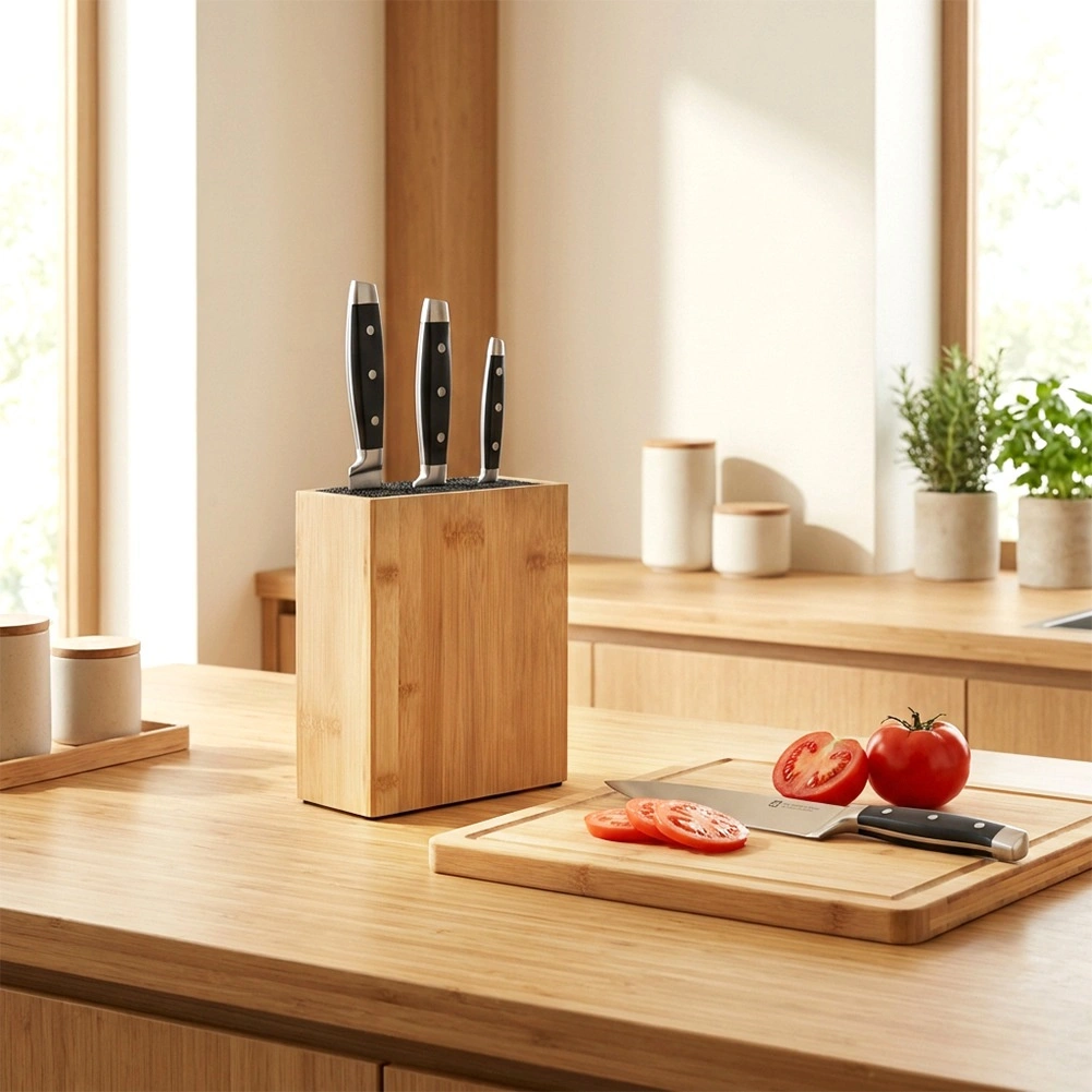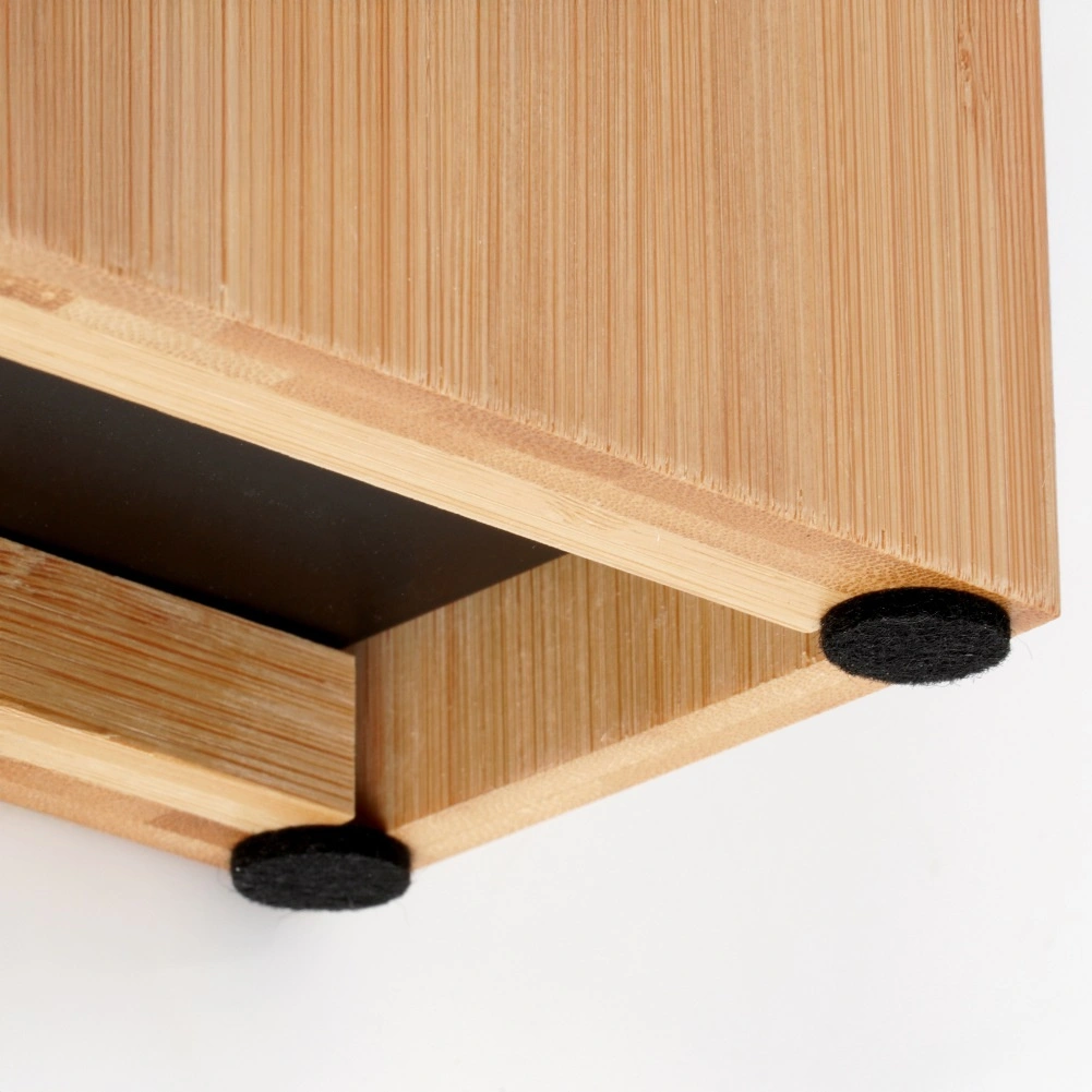 Naravni bambus z gladko površinsko obdelavo lepo dopolni kuhinjo, z možnostjo uporabe filc podlog pa blok stoji trdno na mestu.