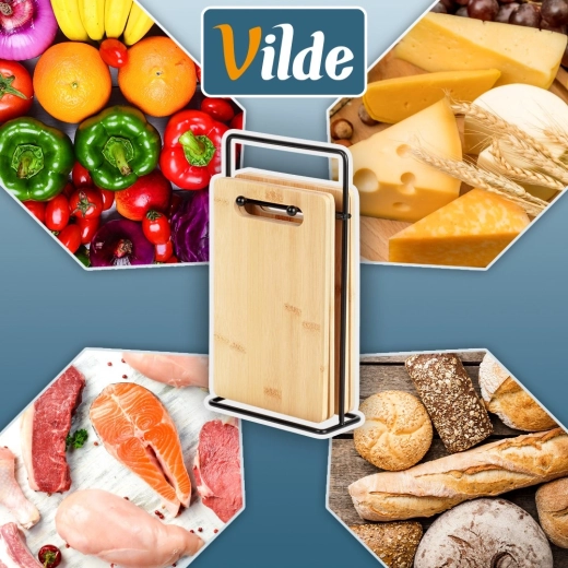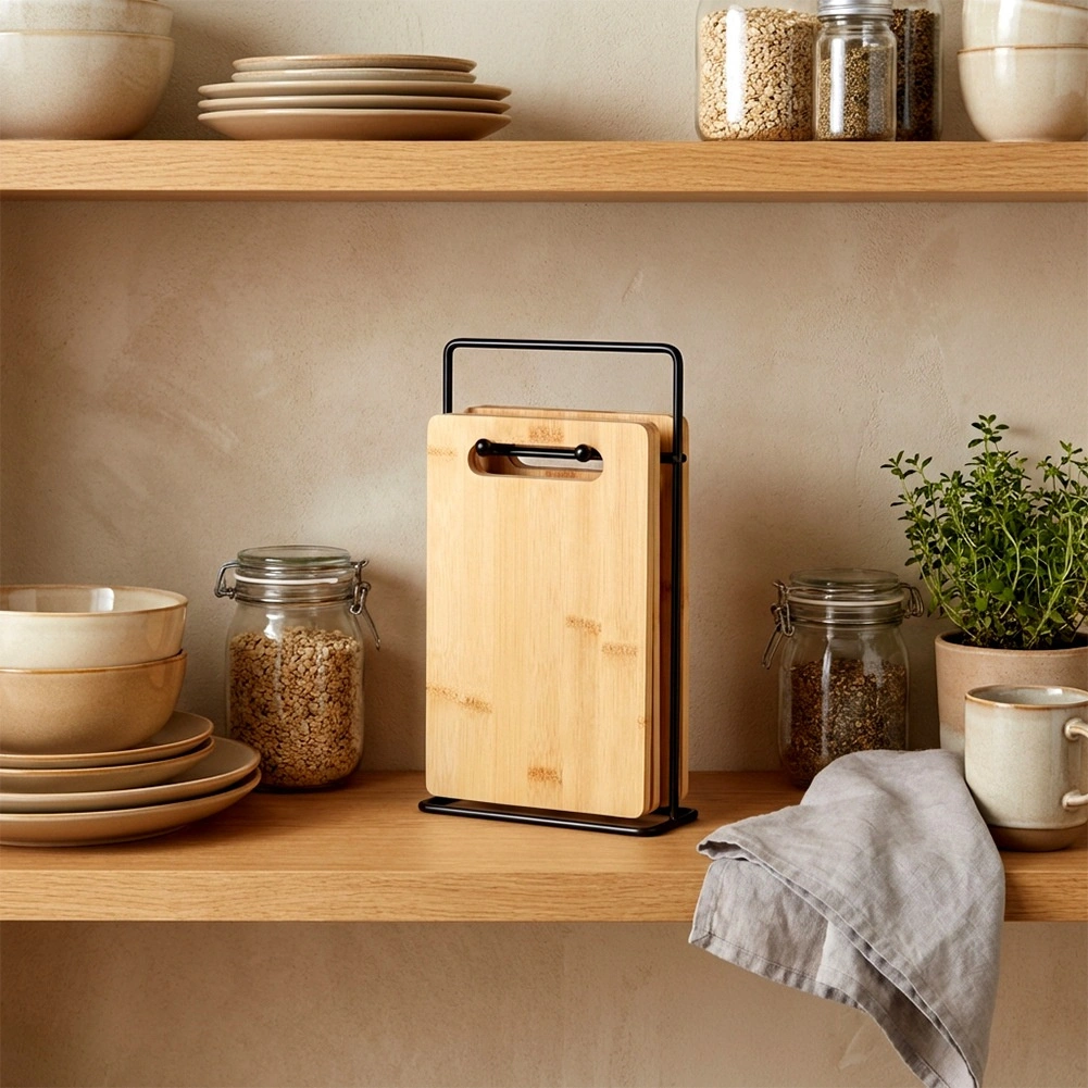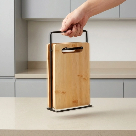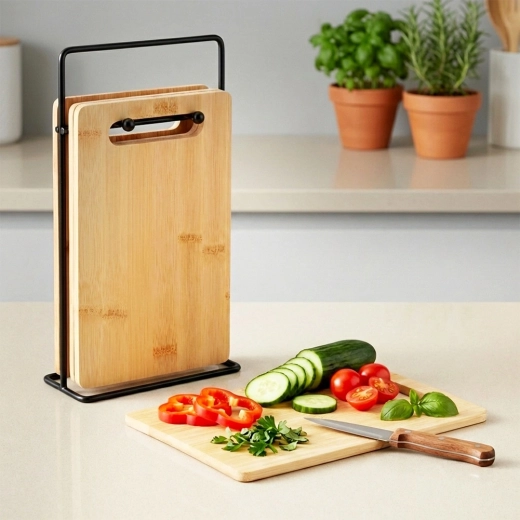 Komplet bambusnih desk je idealen za vsakodnevno rezanje zelenjave, sadja, peciva in mesa. Zaradi kompaktnih mer ne zaseda odvečnega prostora na delovni površini, stojalo pa poskrbi, da so deske vedno pri roki in higiensko zračene. brezčasen naraven videz se poda vsaki kuhinji.