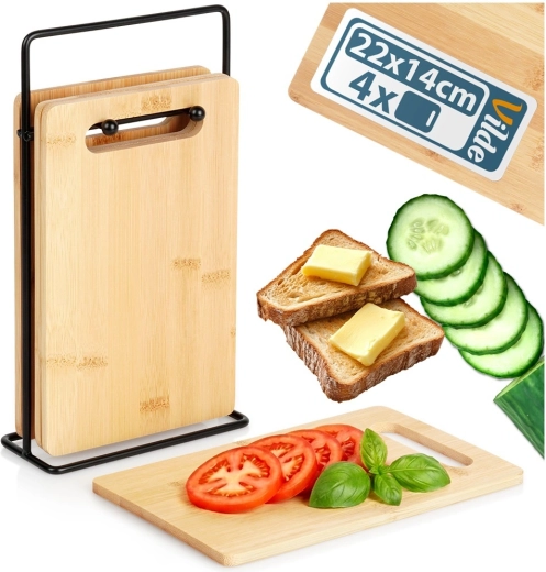 Deske 22 × 14 × 0,7 cm lepo sedejo v roko in so idealne za zelenjavo, sadje, pecivo in manjše porcije mesa. Stojalo vse drži skupaj.