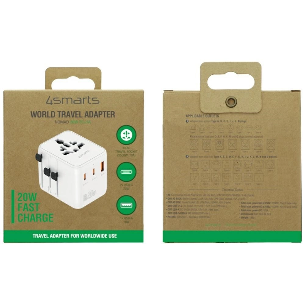 4smarts NOMAD 20 W je idealen spremljevalec za poslovna in zasebna potovanja. V enem ohišju združuje globalni adapter za vtičnice in večportni hitri polnilnik, zato napaja tako drobno elektroniko prek USB kot tudi naprave iz klasičnega omrežja. Kompaktna bela izvedba se prilega vsaki torbi, tehnologija GaN pa poskrbi, da je adapter manjši, učinkovitejši in hladnejši.