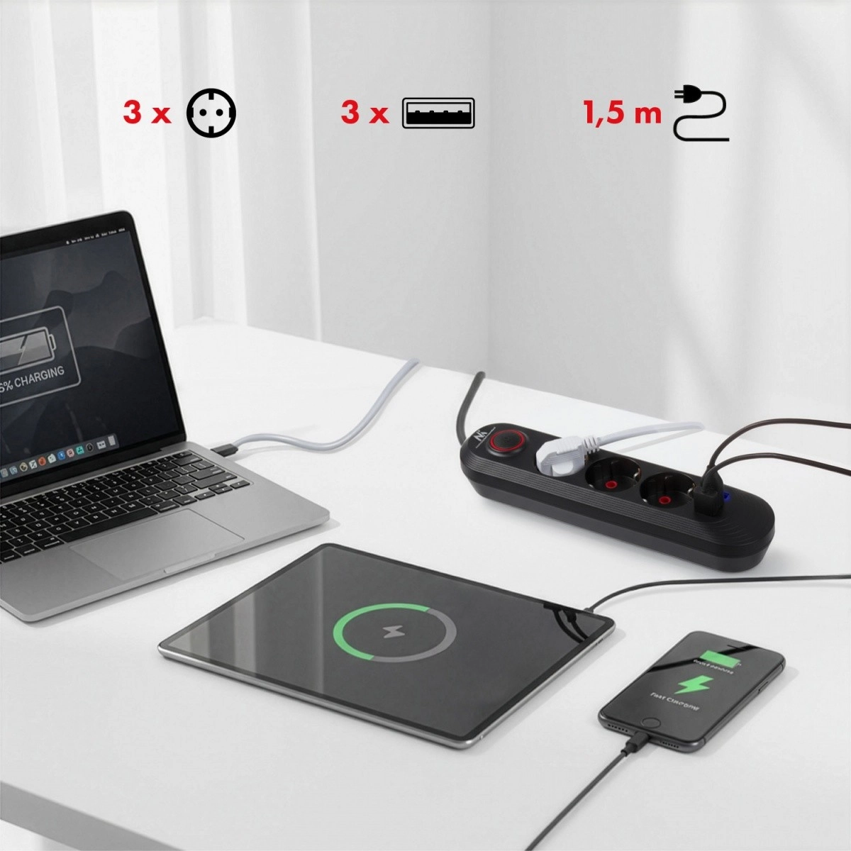 Tri vtičnice Schuko in tri USB vrata omogočajo hkratno napajanje aparatov ter polnjenje telefona ali tablice brez dodatnih adapterjev.