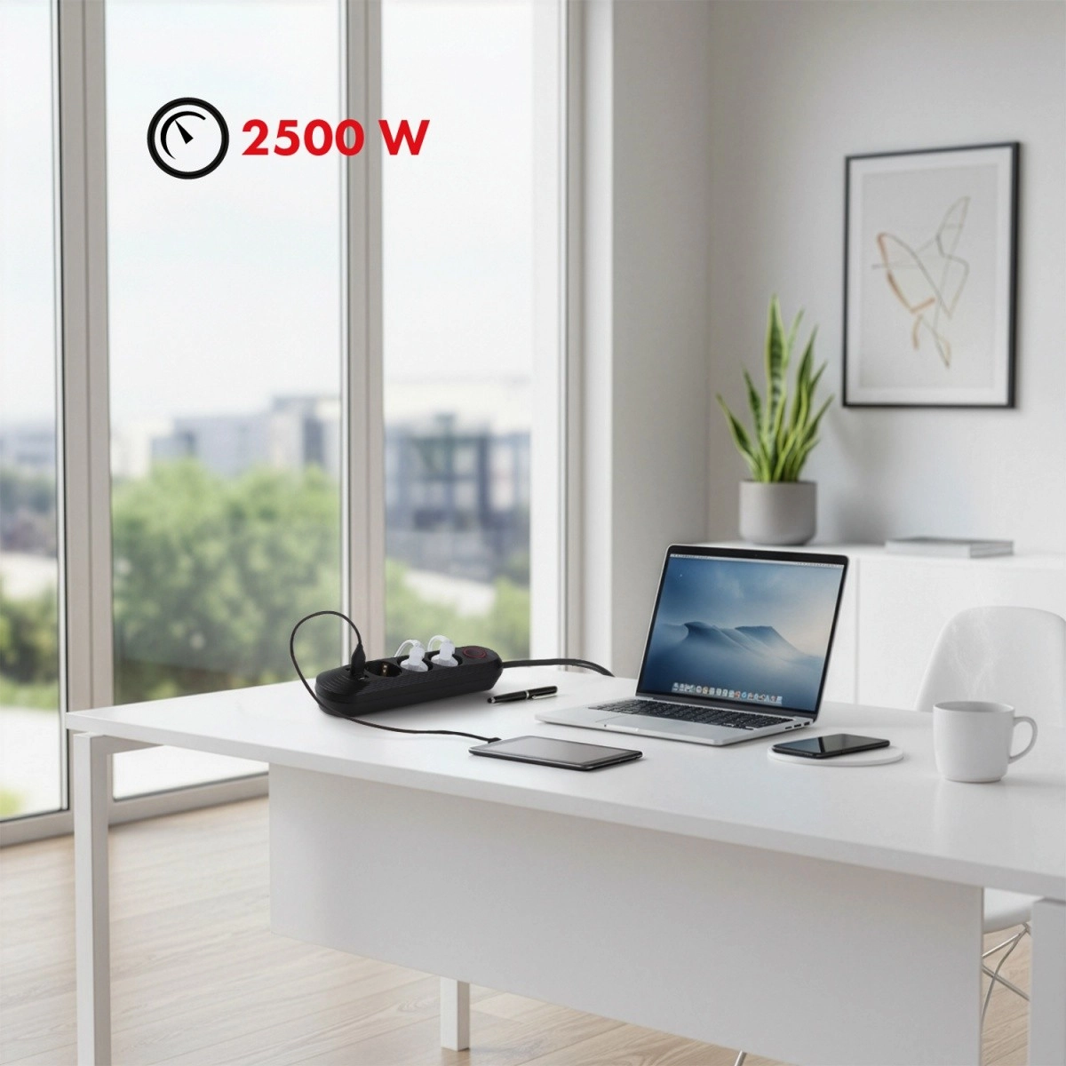 Poskrbite za red med kabli in napajajte vse potrebno z enega mesta. Ta razdelilna letev s 3 omrežnimi vtičnicami in 3 USB vrati zanesljivo oskrbi prenosnik, svetilko ter polnjenje telefona ali tablice. Zahvaljujoč univerzalnemu vhodu 110–240 V AC / 50–60 Hz in moči do 2500 W zanesljivo obvlada vsakodnevno rabo.