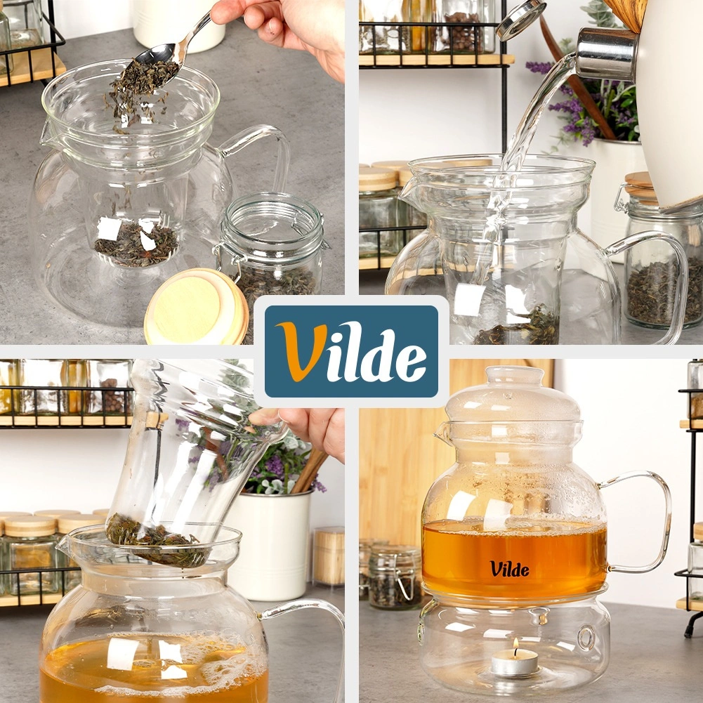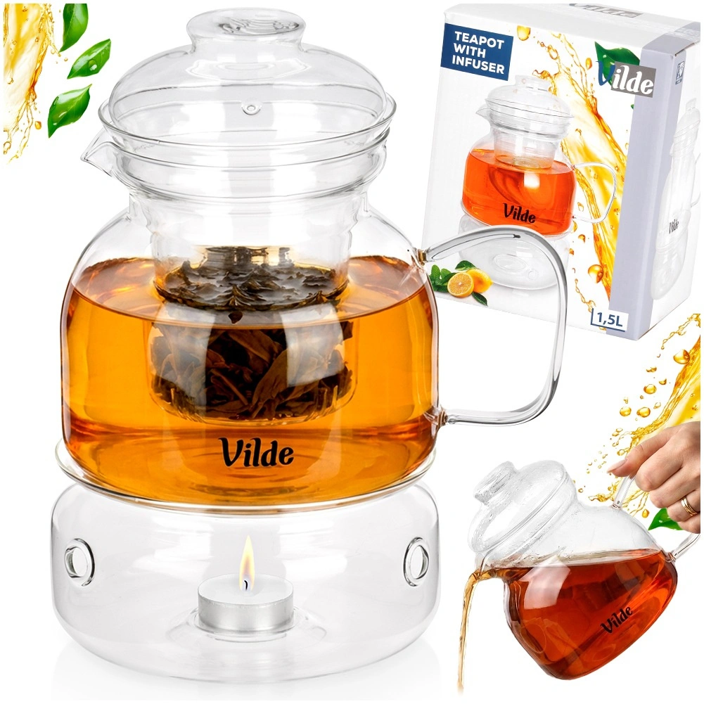Odkrijte premišljen set za pripravo in postrežbo čaja: stekleno čajniko z nežnim filtrom in grelcem na čajno svečko, ki ohranja napitek prijetno topel dalj časa. Čista, minimalistična zasnova iz borosilikatnega stekla izgleda odlično na vsaki mizi in hkrati zagotavlja visoko odpornost na toplotne šoke.