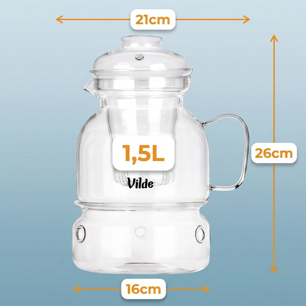 Celoten set – čajnika, filter in grelec – je izdelan iz toplotno odpornega borosilikatnega stekla, odpornega od -20 °C do 150 °C. Odlično za vroče in hladne napitke.