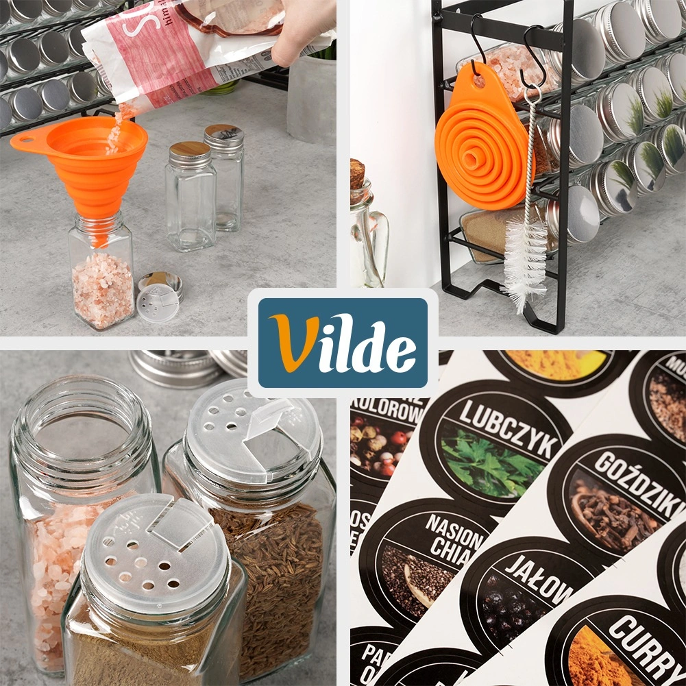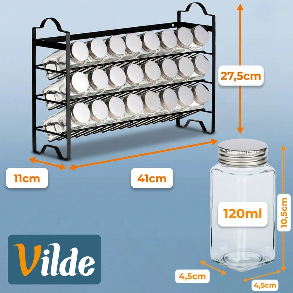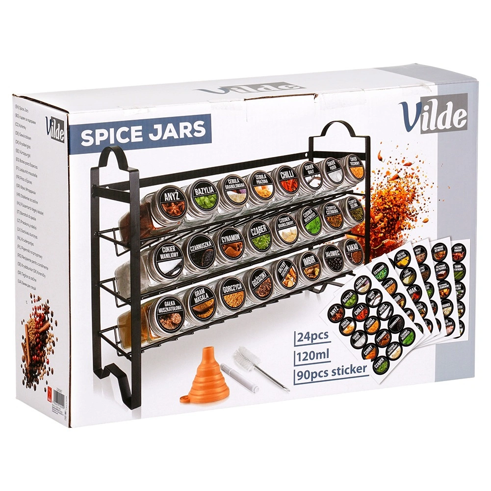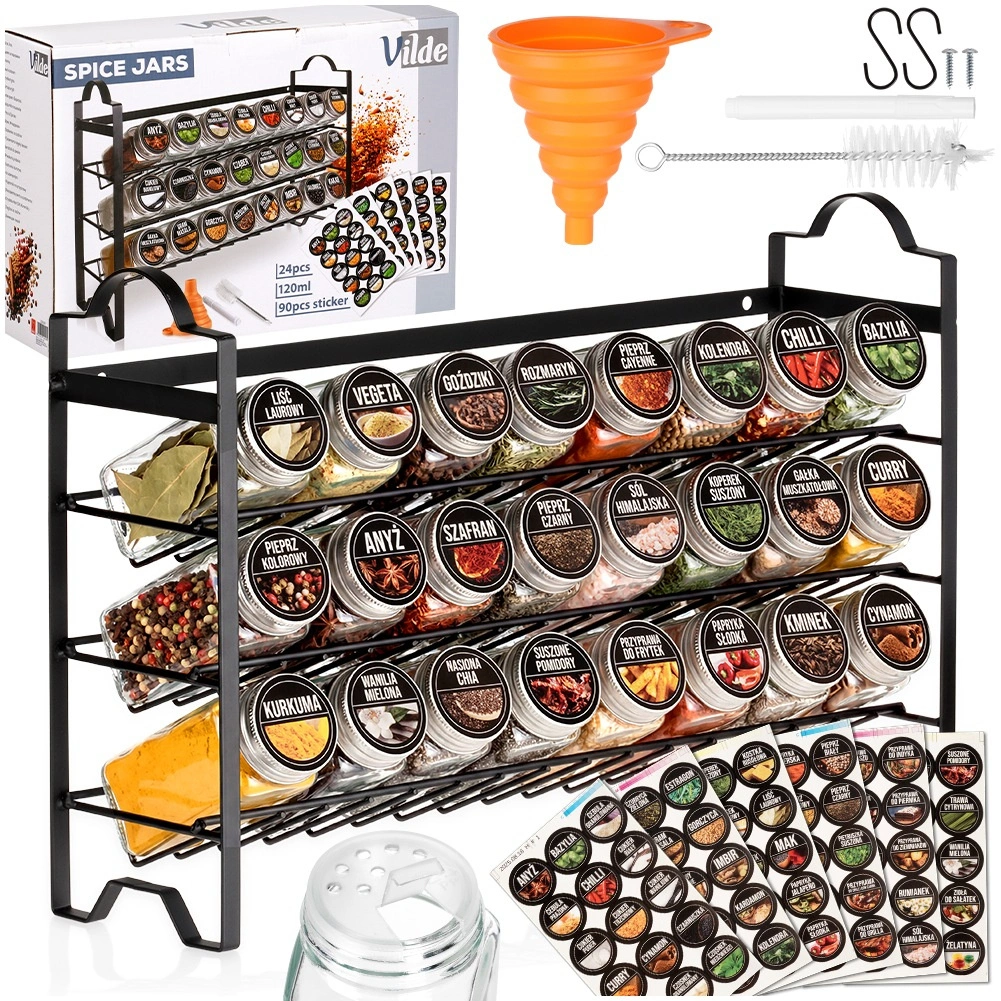 Praktičen set za organizirano kuhanje: kovinska polica v loft slogu s tremi ravnmi in 24 steklenimi kozarčki za začimbe (120 ml) s sitkami in srebrnimi pokrovčki. V kompletu je 90 samolepilnih nalepk, silikonski zložljiv lijak, čistilna krtačka, 2 kljukici in bel marker. Ohranja začimbe sveže, prihrani prostor in poskrbi za preglednost v vsaki kuhinji.
