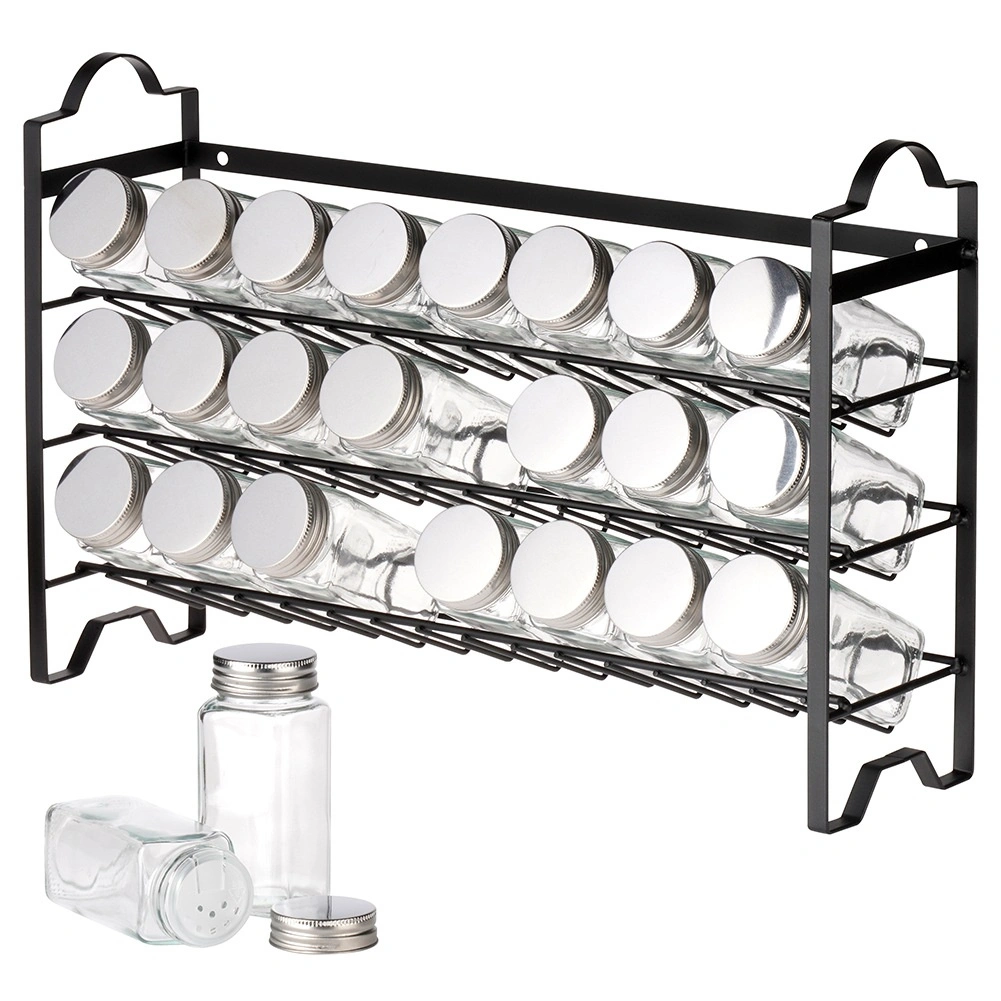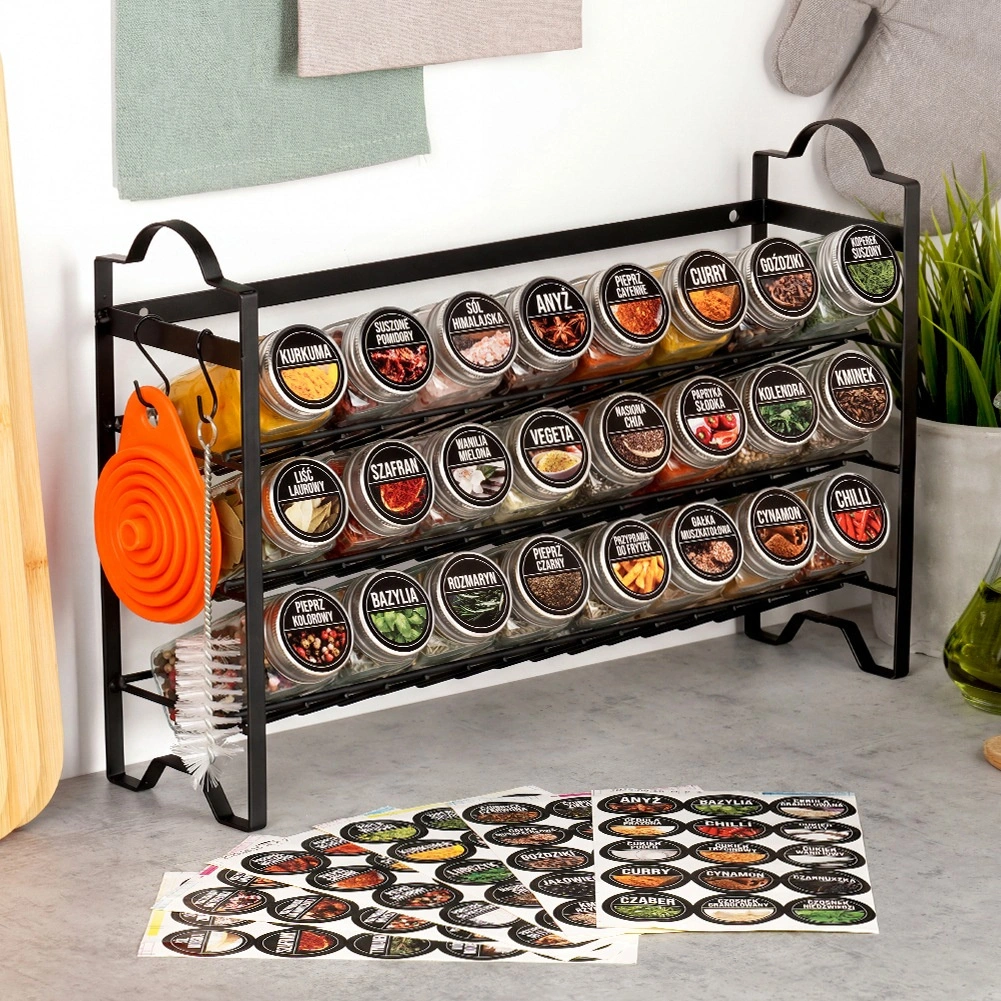 Stilna in funkcionalna organizacija začimb za vsakodnevno kuhanje. Črna kovinska polica s tremi nadstropji nudi pregleden prostor za začimbe, zelišča in manjše kuhinjske pripomočke. Stekleni kozarci s prozornimi sitkami olajšajo doziranje, tesnilni pokrovčki pa ščitijo pred vlago, da začimbe dlje ohranijo aromo.