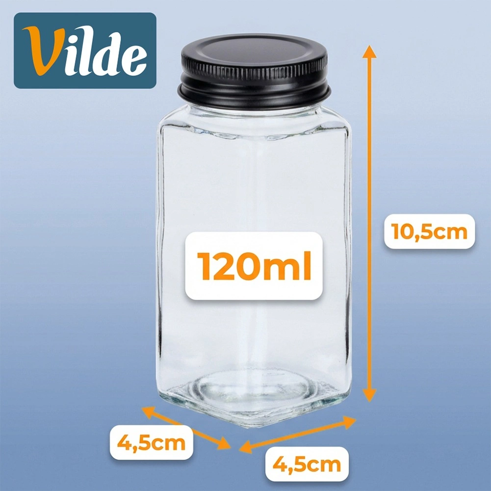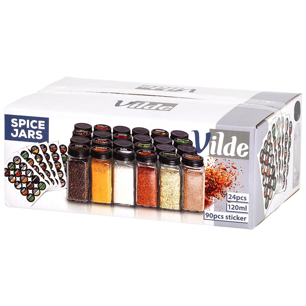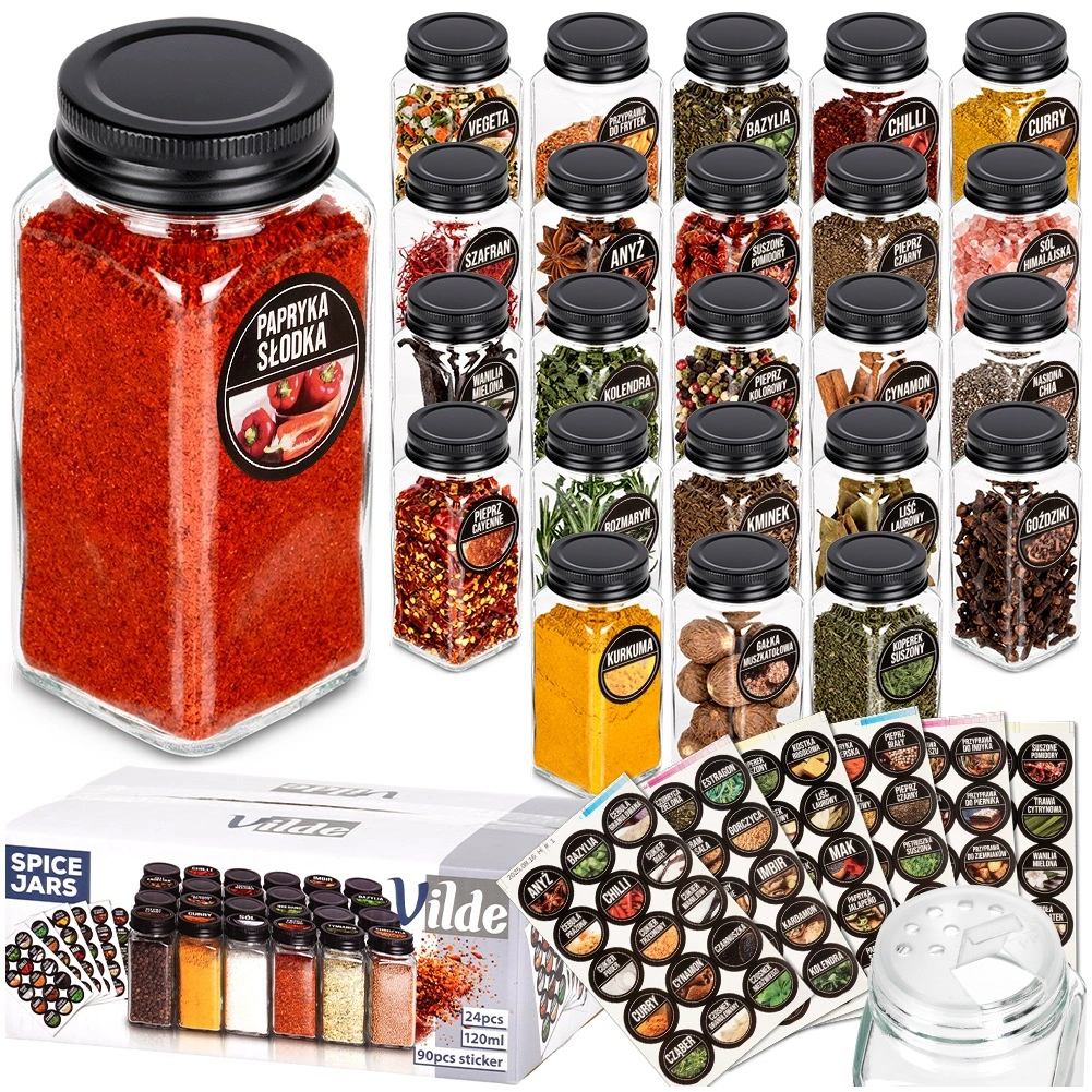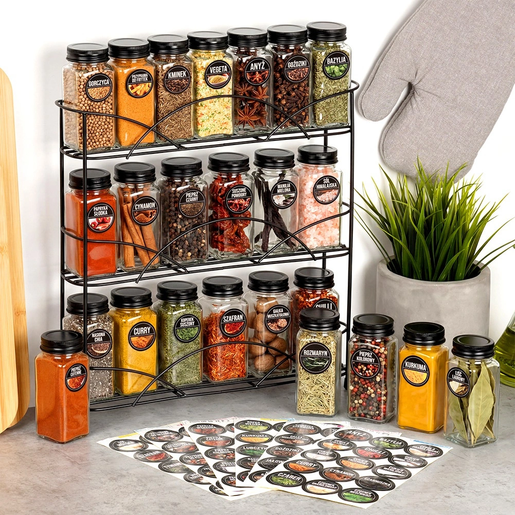 Praktičen set steklenih začimbnic za pregledno shranjevanje začimb in zelišč v kuhinji. Vsebuje 24 prozornih steklenih kozarčkov s prostornino 120 ml s črnimi kovinskimi pokrovčki in 90 samolepilnih nalepk za hitro označevanje. Vsaka začimbnica meri 4,5 × 4,5 × 10,5 cm, ščiti pred vlago in zahvaljujoč praktičnemu cedilu omogoča udobno doziranje. Idealno za red v predalih, na policah in kuhinjskem pultu.