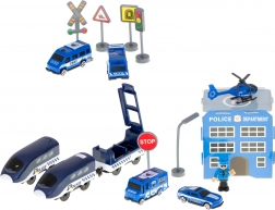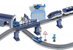 36 tirov + spojke, most, tunel, 2 lokomotivi, odpirajoči se vagon, 4 policijska vozila, helikopter, figurica policista, 6 znakov, kartonska policijska postaja s heliportom, nalepke, navodila s predlogi prog