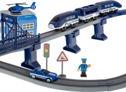 Odkrijte akcijski svet policije s to električno vlakovno progo – kompletom s 92 deli in dolžino tira do 300 cm. Dvonivojski tiri z mostom in tunelom, pogonska lokomotiva na baterije, policijski avtomobili, helikopter in postaja s heliportom spremenijo sobo v središče dogajanja. Odlično za kreativno igro, razvoj motorike in učenje prometnih pravil.