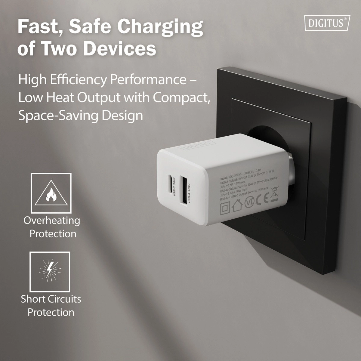 Kompakten USB polnilec s tehnologijo GaN ponuja moč 30 W za hitro in zanesljivo polnjenje. Zahvaljujoč priključkoma USB‑C (do 30 W) in USB‑A (do 18 W) napaja pametne telefone, tablice in lahke prenosnike. Ob sočasni uporabi obeh priključkov zagotovi do 15 W. Moderna GaN II zagotavlja višjo učinkovitost, manj segrevanja in manjše dimenzije – idealno za dom, pisarno in potovanja. Ohišje iz 98 % PCR plastike in embalaža brez plastike bosta razveselila tudi okoljsko ozaveščene uporabnike.