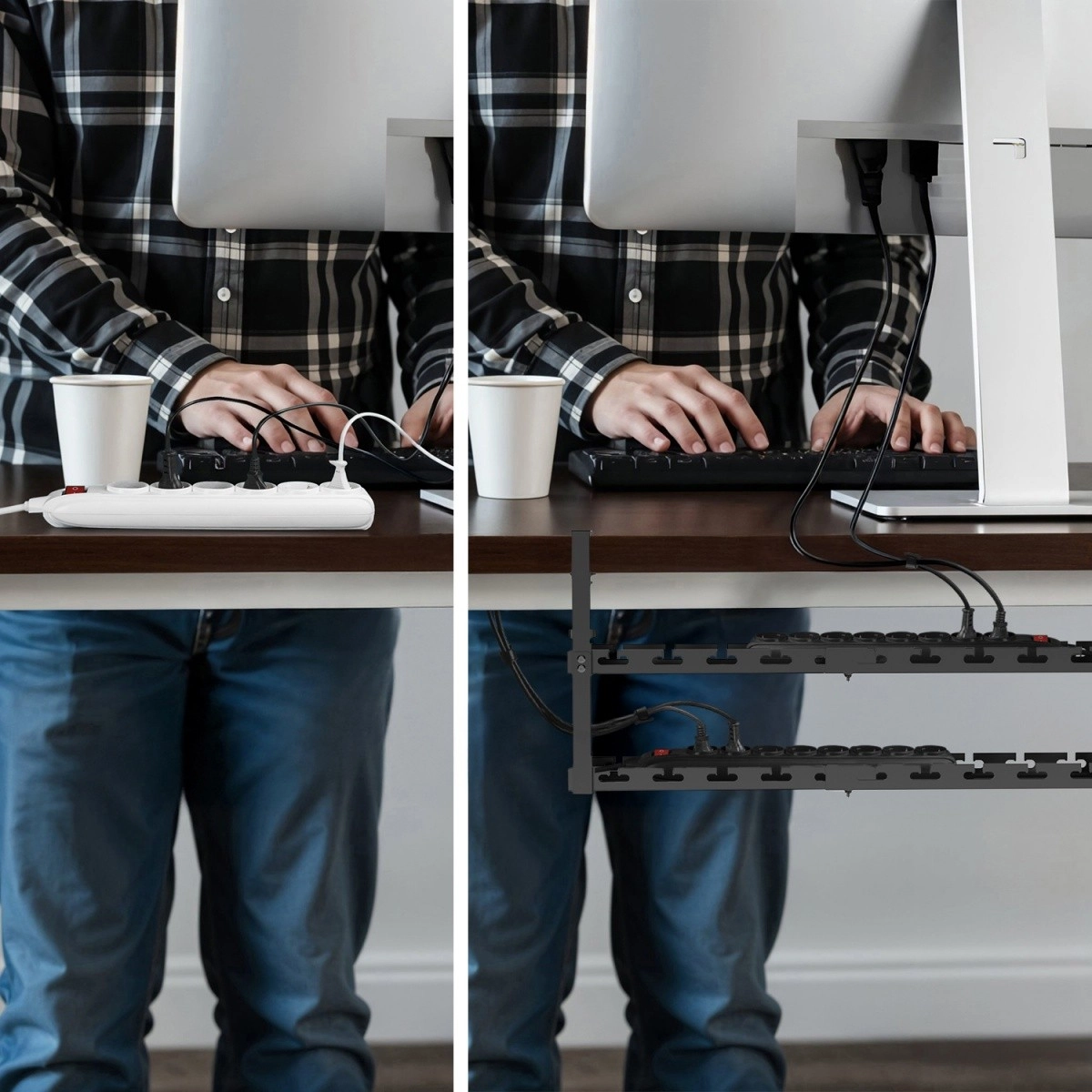 MACEAN MC-102 je praktičen organizator kablovja, ki se pritrdi neposredno pod mizno ploščo – brez vrtanja in brez poškodb pohištva. Dve ločeni ravni nudita prostor za dve napajalni letvi ali dodatke, kot so adapterji, USB vozlišča ali usmerjevalniki. Prehodne odprtine in reže olajšajo vodenje kablov med nivoji in ob straneh, zato povezave ostanejo pregledne in varne.