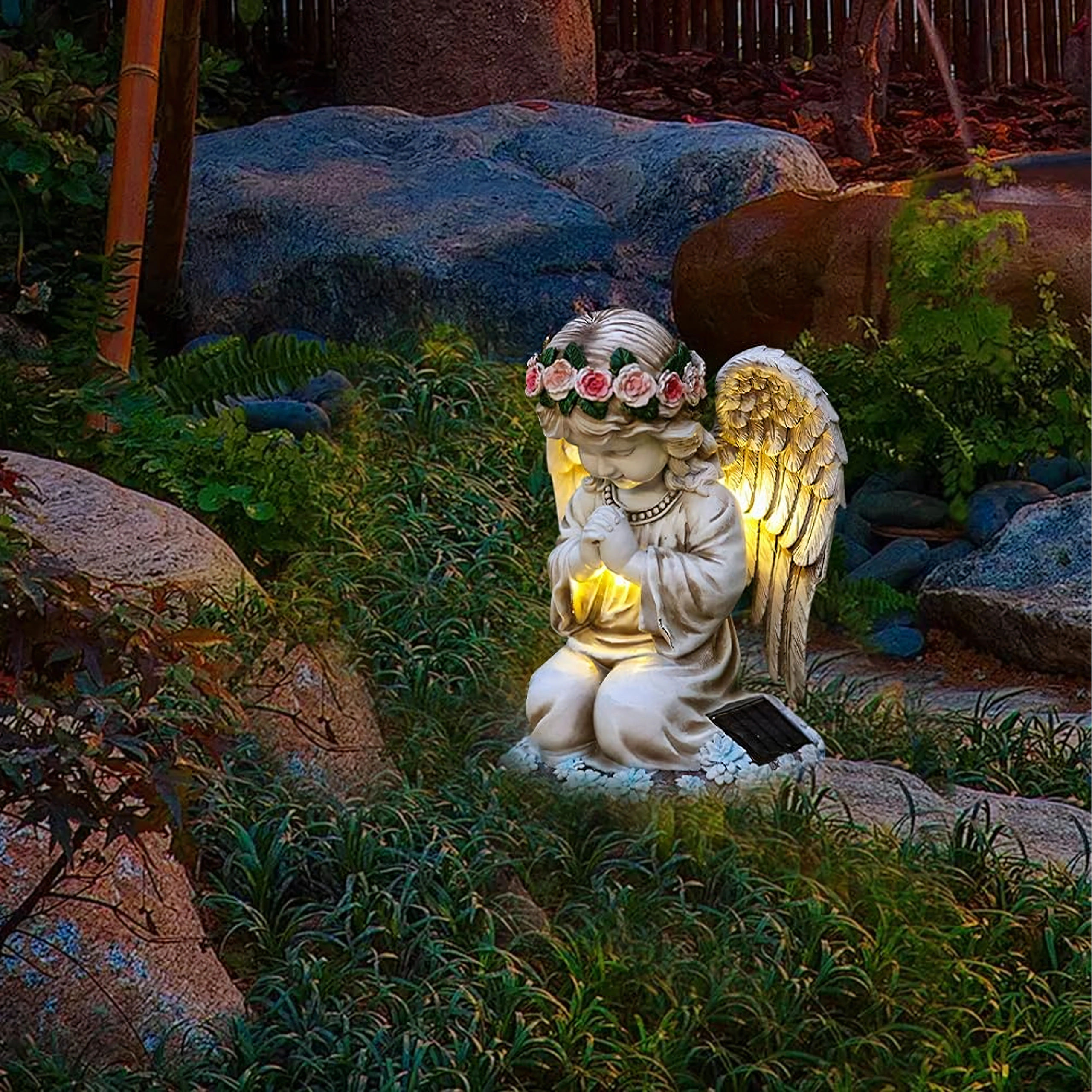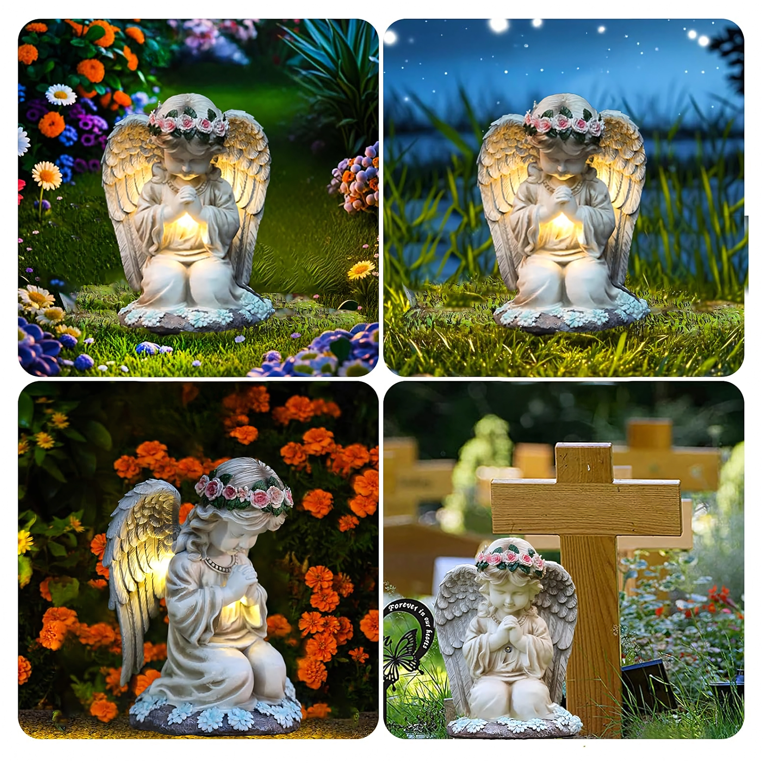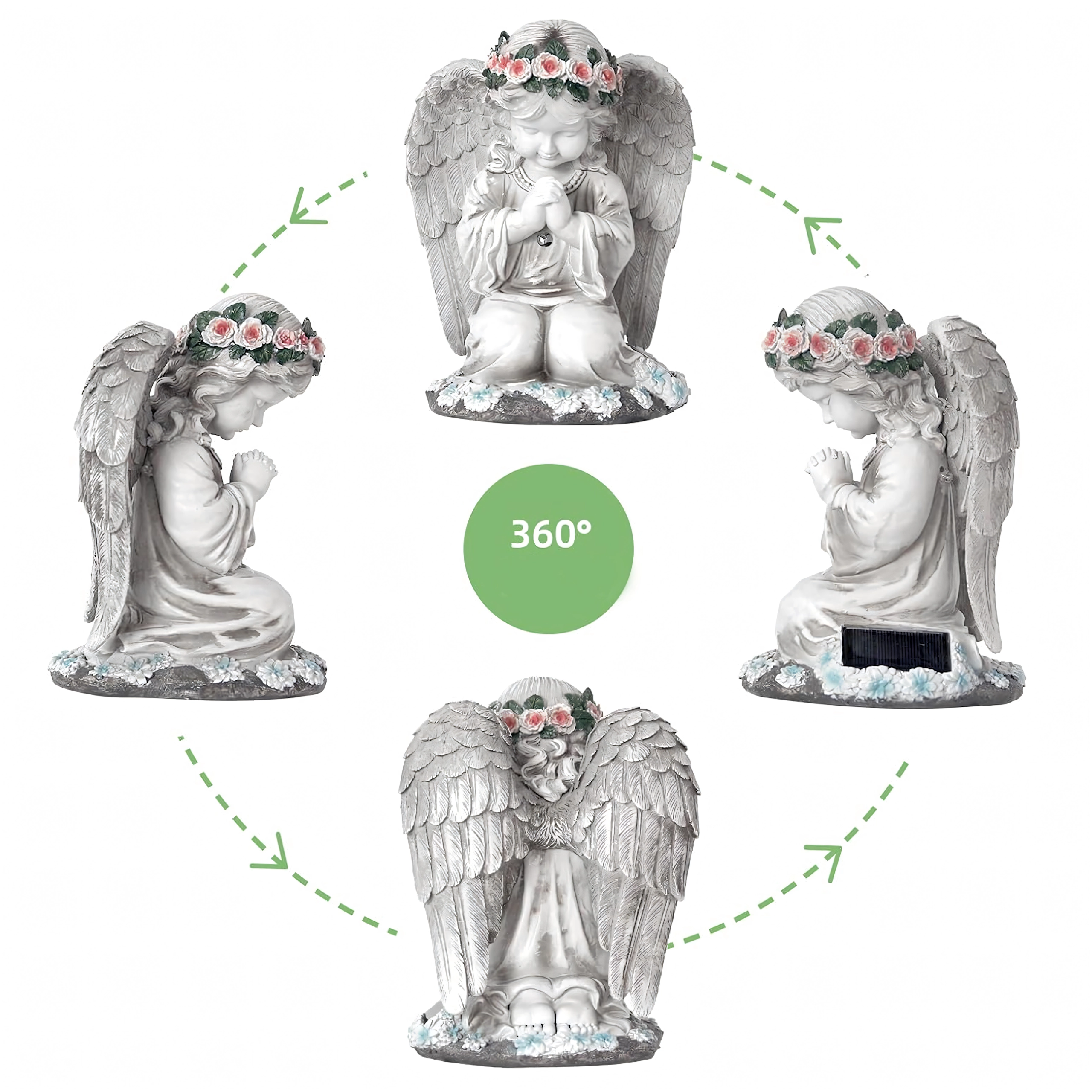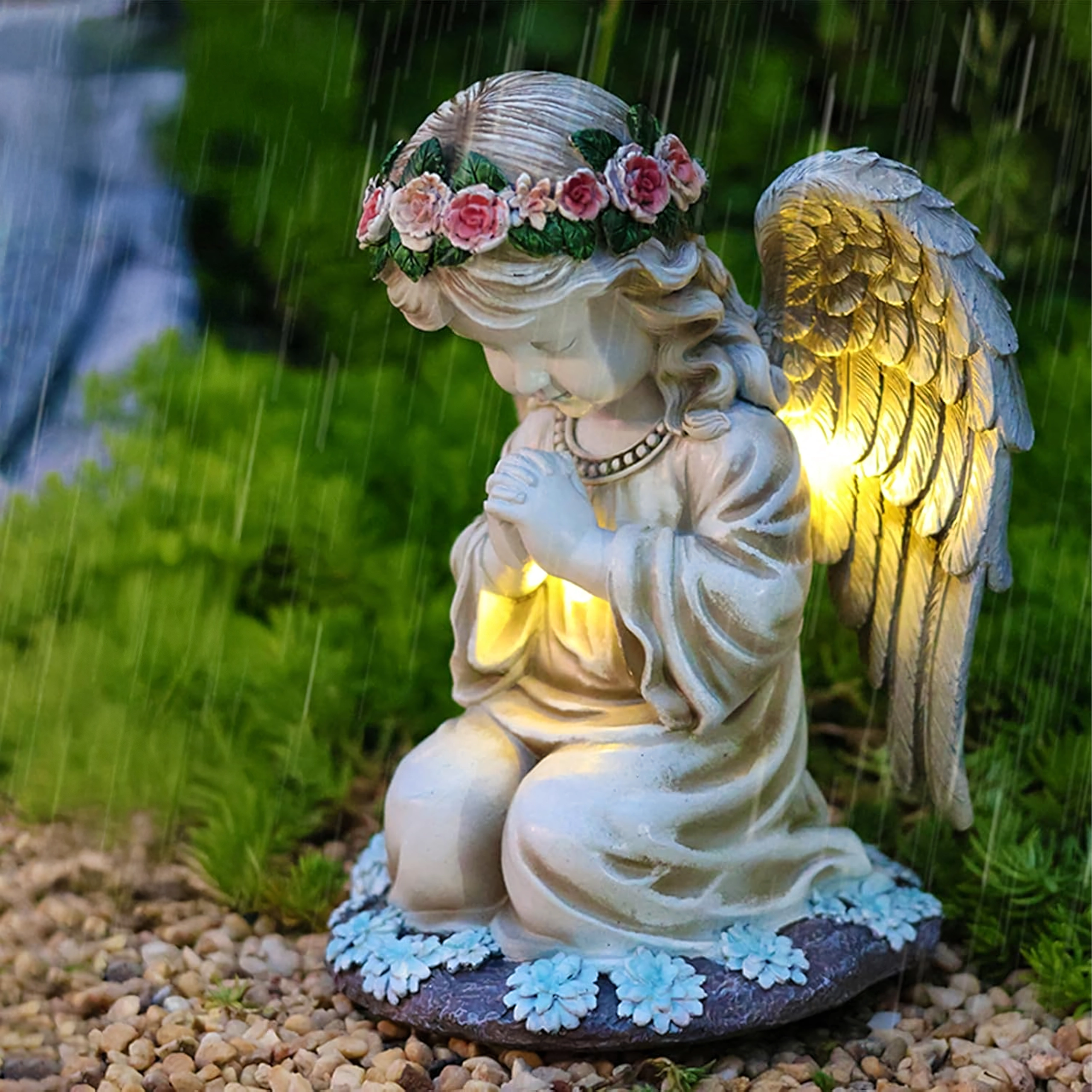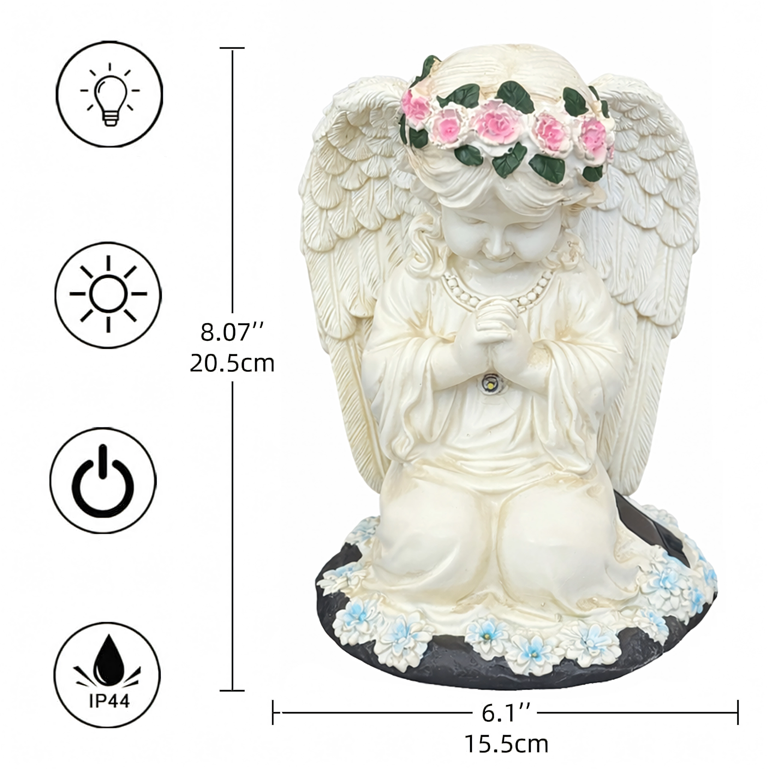 Elegantna vrtna figurica angela bo nežen poudarek vašemu zunanjemu prostoru. Vgrajena topla LED osvetlitev za prijetno vzdušje, sončno napajanje za brezžično delovanje in odporna izdelava za vse vremenske razmere jo naredijo za čudovito in praktično dekoracijo za vrt, teraso ali spominska mesta.