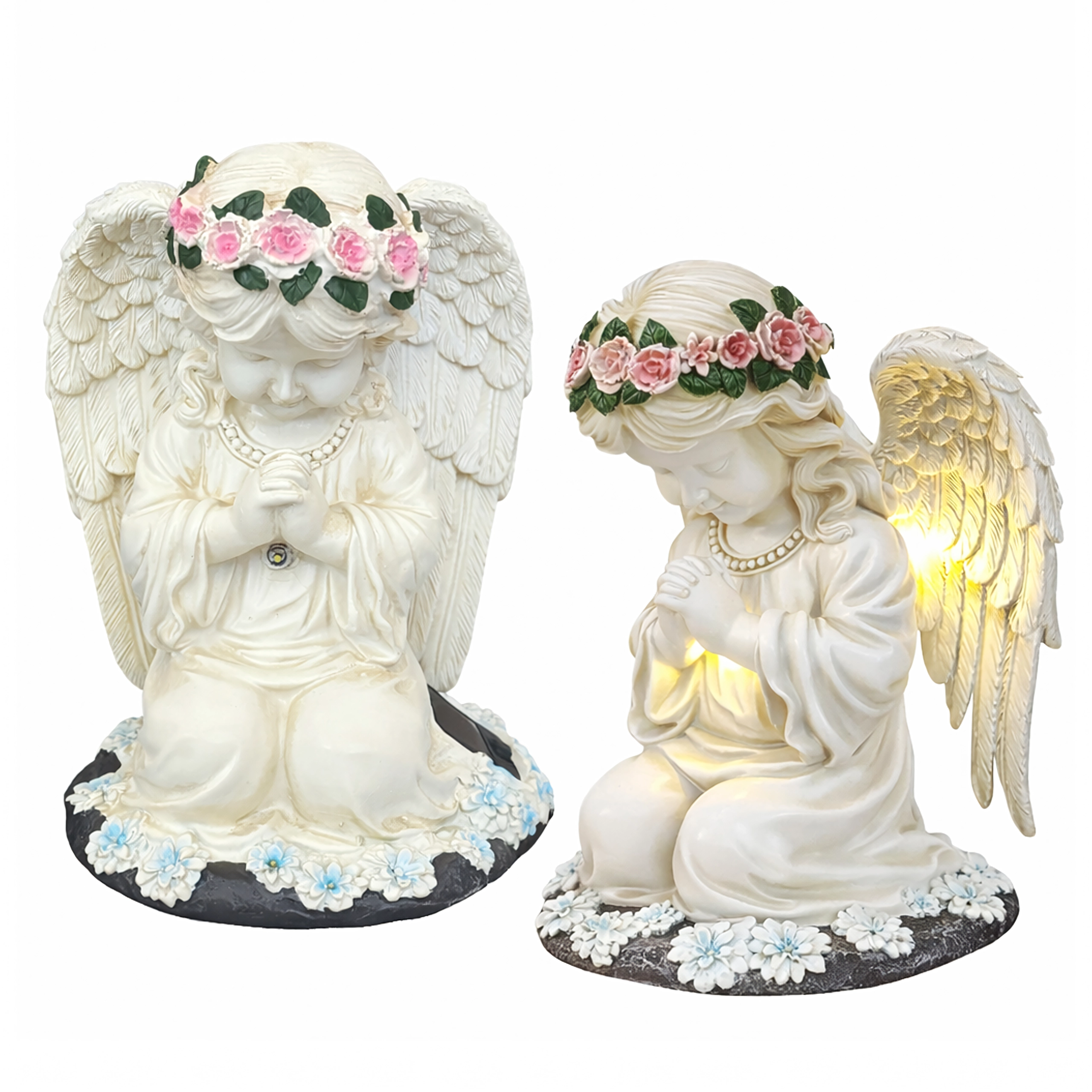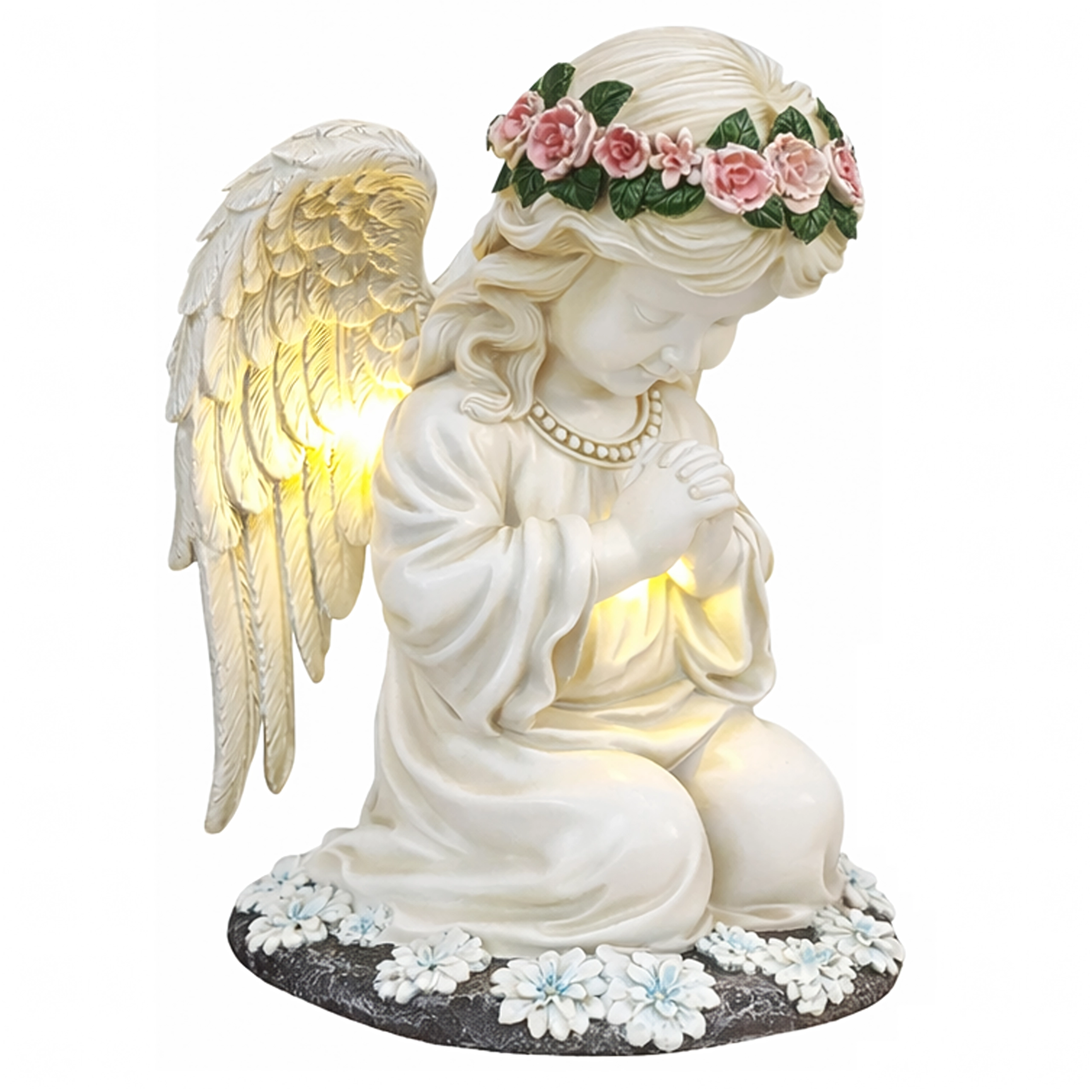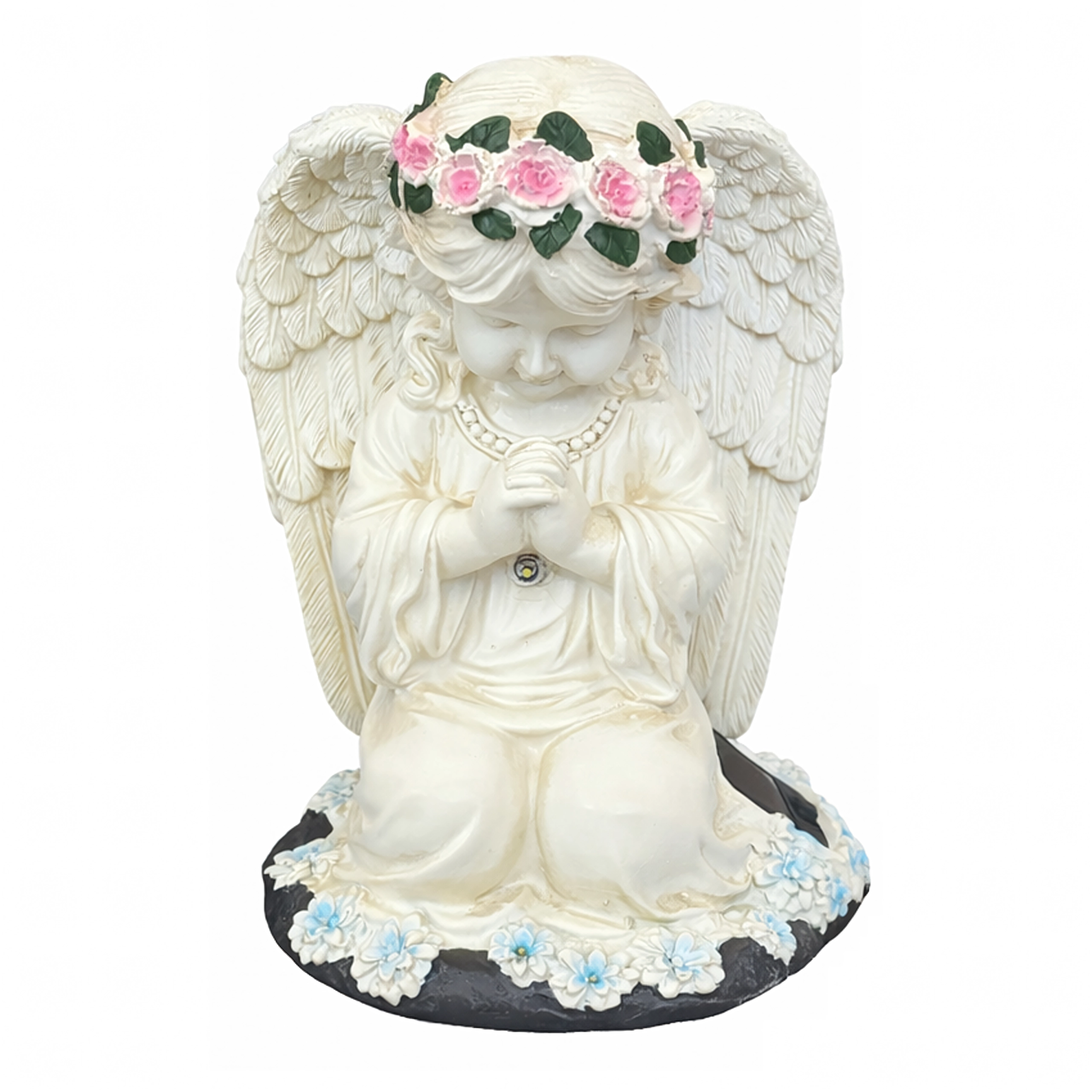 Ta podrobno oblikovana figurica klečečega angela s cvetličnim vencem in bogato oblikovanimi krili je zasnovana za celoletno zunanjo uporabo. Vgrajene toplo bele LED diode nežno osvetljujejo krila in obleko ter ustvarjajo pomirjujočo večerno svetlobo za vrtne poti, gredice in spominska mesta. Zahvaljujoč sončnemu panelu se podnevi polni in se ob mraku samodejno prižge.