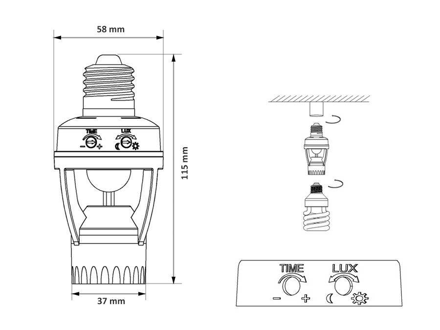 Namestitev traja le nekaj minut: preprosto privijte v obstoječe grlo E27 in vstavite žarnico. Z vrtljivimi regulatorji preprosto nastavite čas dosvita (TIME) in prag osvetlitve (LUX). Senzor uporablja infrardeče zaznavanje (PIR) in zanesljivo prepozna dan/noč, s čimer varčuje energijo in stroške.