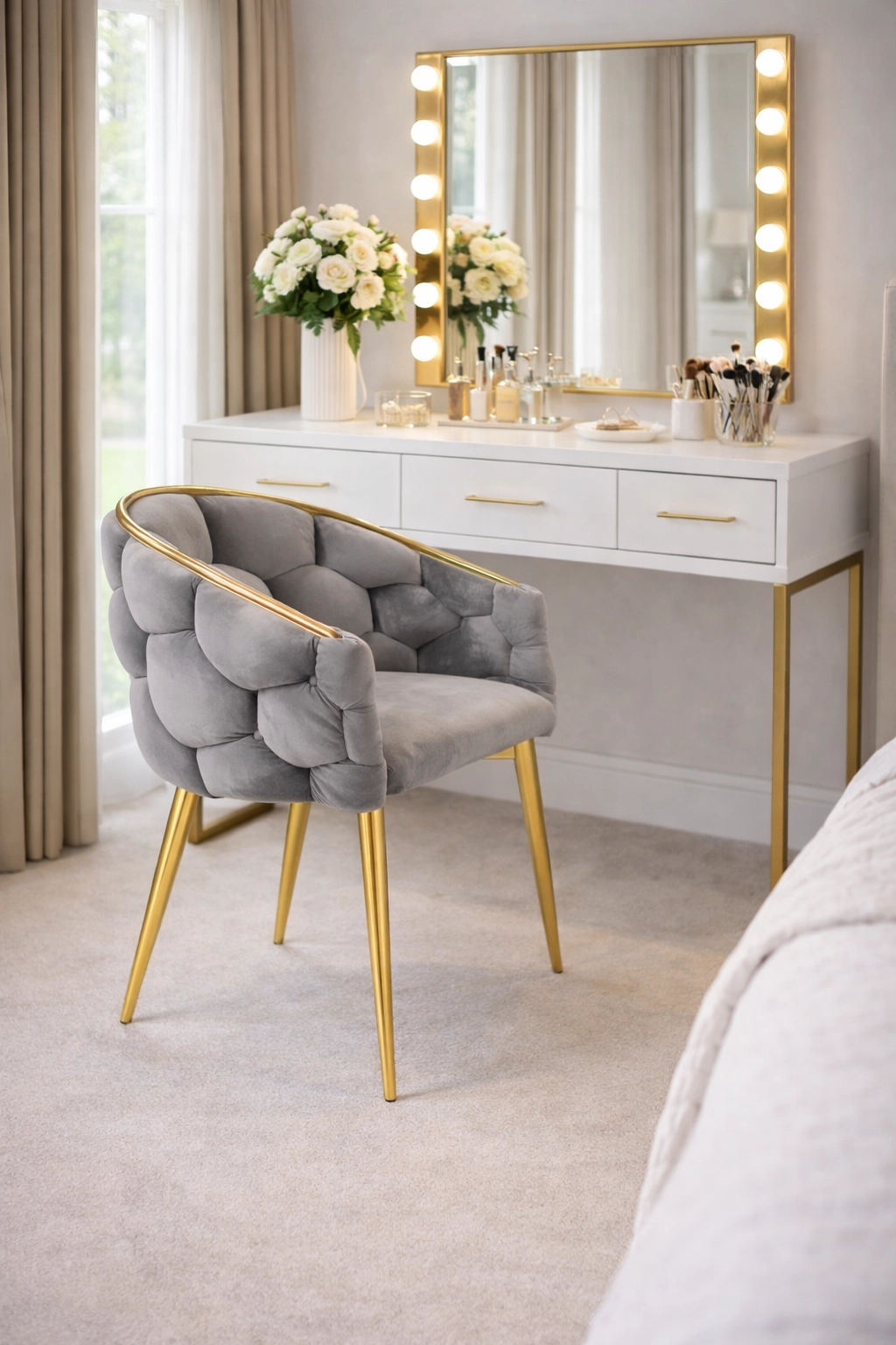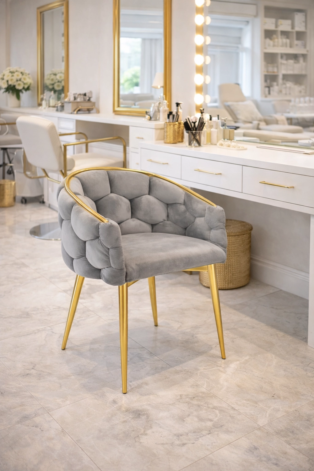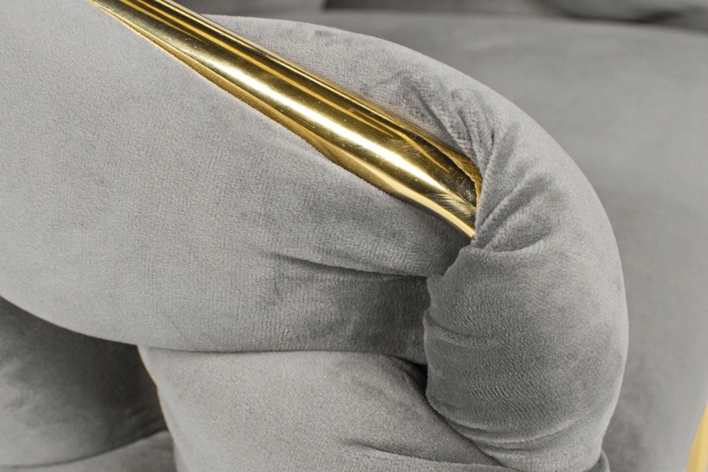 Vitke kovinske noge in zlati robovi dodajo interierju pridih razkošja ter se popolno ujemajo s sivim žametom.