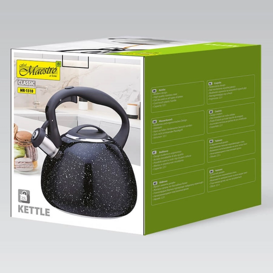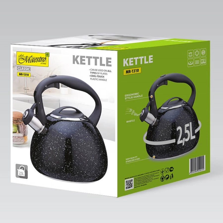 Stilski in trpežen čajnik MAESTRO s prostornino 2,5 l je idealen za vsakodnevno vretje vode. Ima žvižgajoči izljev za varno uporabo, visokokakovostno nerjavno jeklo za dolgo življenjsko dobo in večslojno kapsulirano dno za hitro in enakomerno segrevanje. Zahvaljujoč odstranljivemu pokrovu se enostavno polni in čisti, primeren pa je za vse tipe štedilnikov, vključno z indukcijo.