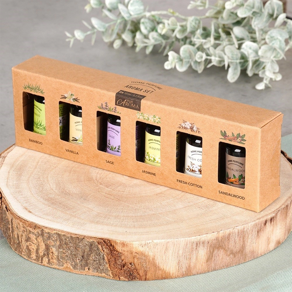 Ta eleganten komplet eteričnih olj prinaša šest priljubljenih dišav za domačo aromaterapijo. Dovolj je nekaj kapljic v difuzor, aromalampico ali na keramično ploščico in vaš prostor se napolni z dolgotrajno dišavo, ki podpira mir, zbranost in dobro počutje. Vsaka steklenička je iz stekla (pribl. 2,5 × 6 cm) in vsebuje 10 ml kakovostnega dišečega olja.