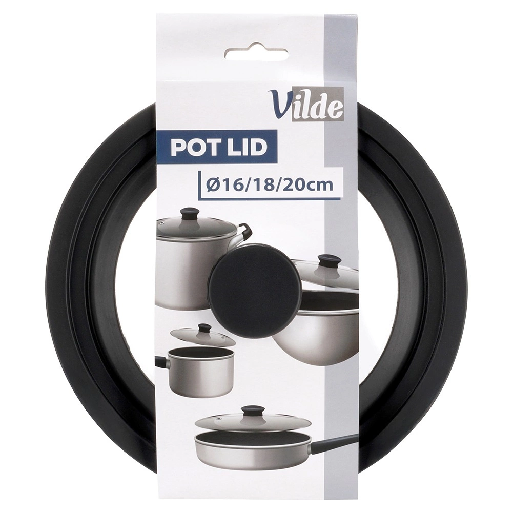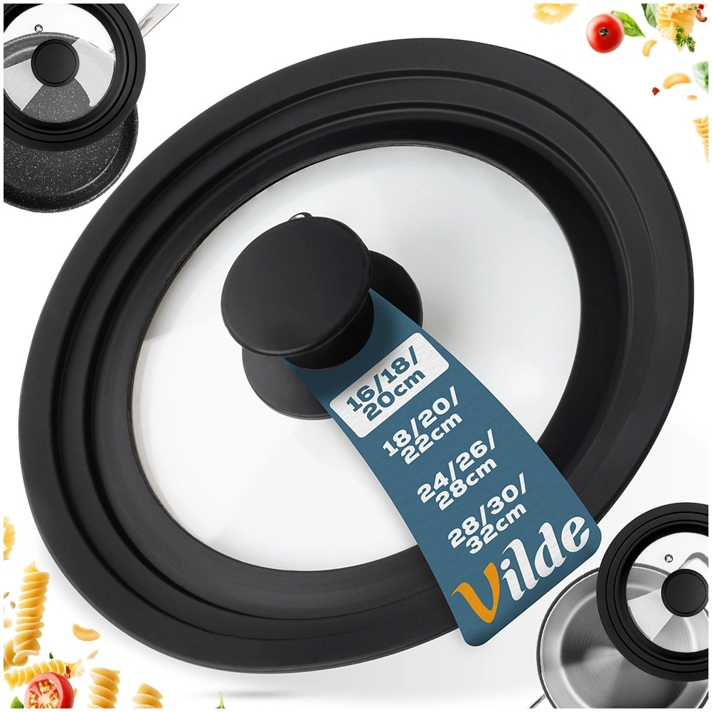 Univerzalni pokrov Vilde združuje odporno kaljeno steklo in prožen silikon v elegantni črni barvi. Zahvaljujoč stopničastemu silikonskemu robu se varno prilega več premerom (16/18/20 cm), tesni, ščiti robove posode in pomaga ohranjati red na kuhalni plošči. Prozorno steklo omogoča spremljanje kuhanja brez dvigovanja pokrova, medtem ko odprtina za izpust pare uravnava odvajanje pare in zmanjšuje tveganje prelivanja.