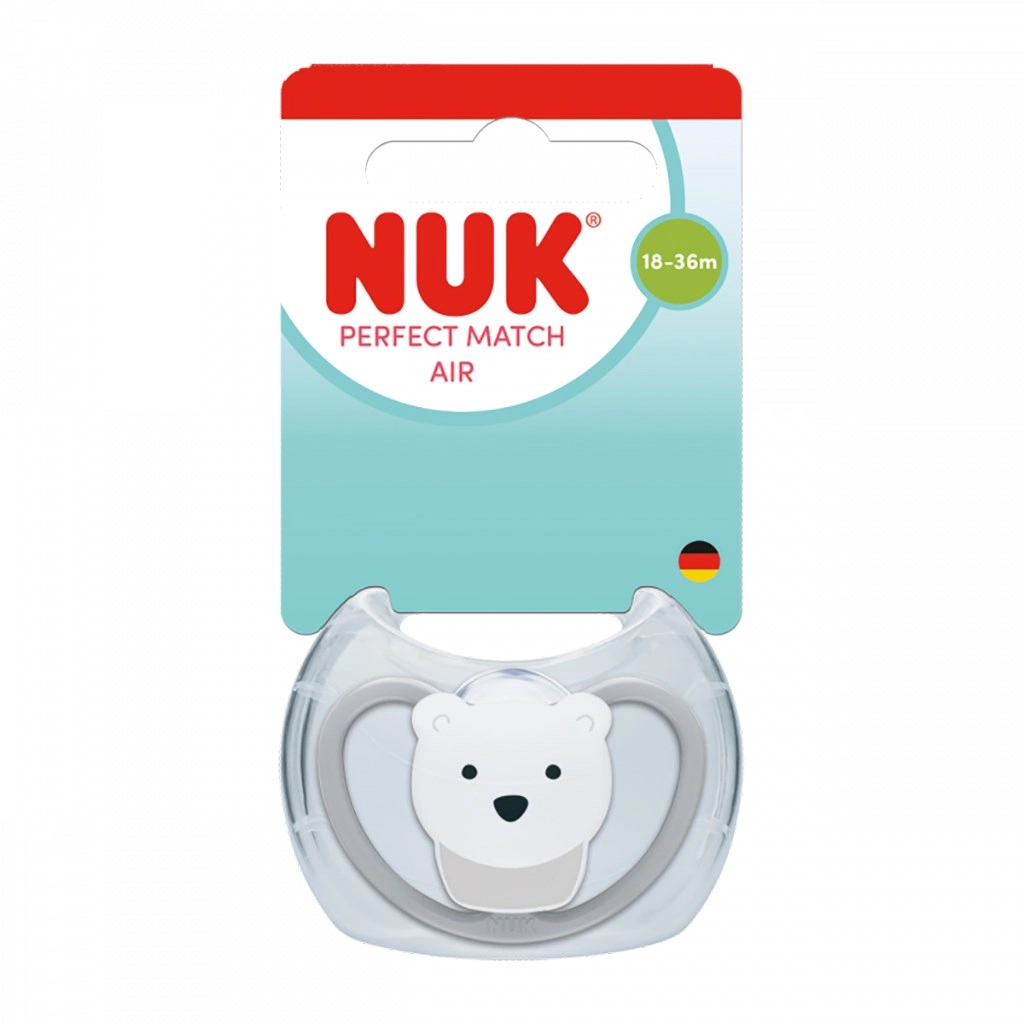 Silikonska dudica NUK Perfect Match Air z motivom Polar Bear za otroke od 18+ mesecev podpira zdrav razvoj zob in čeljusti. Zahvaljujoč izjemno velikim prezračevalnim odprtinam koži okoli ust omogoča, da prosto diha, ter pomaga preprečevati draženje. Mehak sesalni del z ergonomsko obliko podpira naravni sesalni refleks. Priloženo je trdno, večkrat uporabno potovalno ohišje, primerno tudi za mikrovalovno pečico.