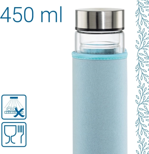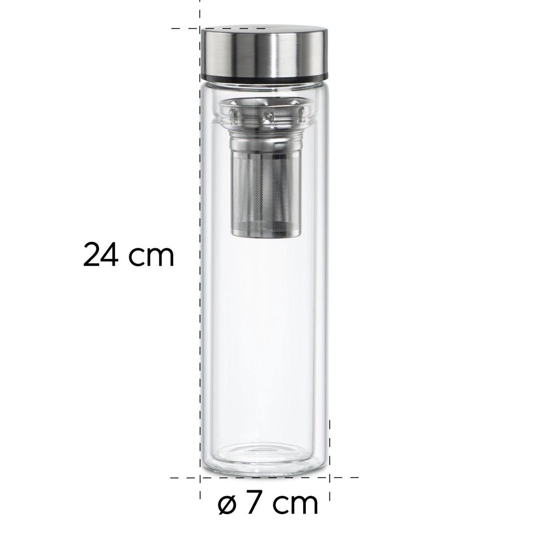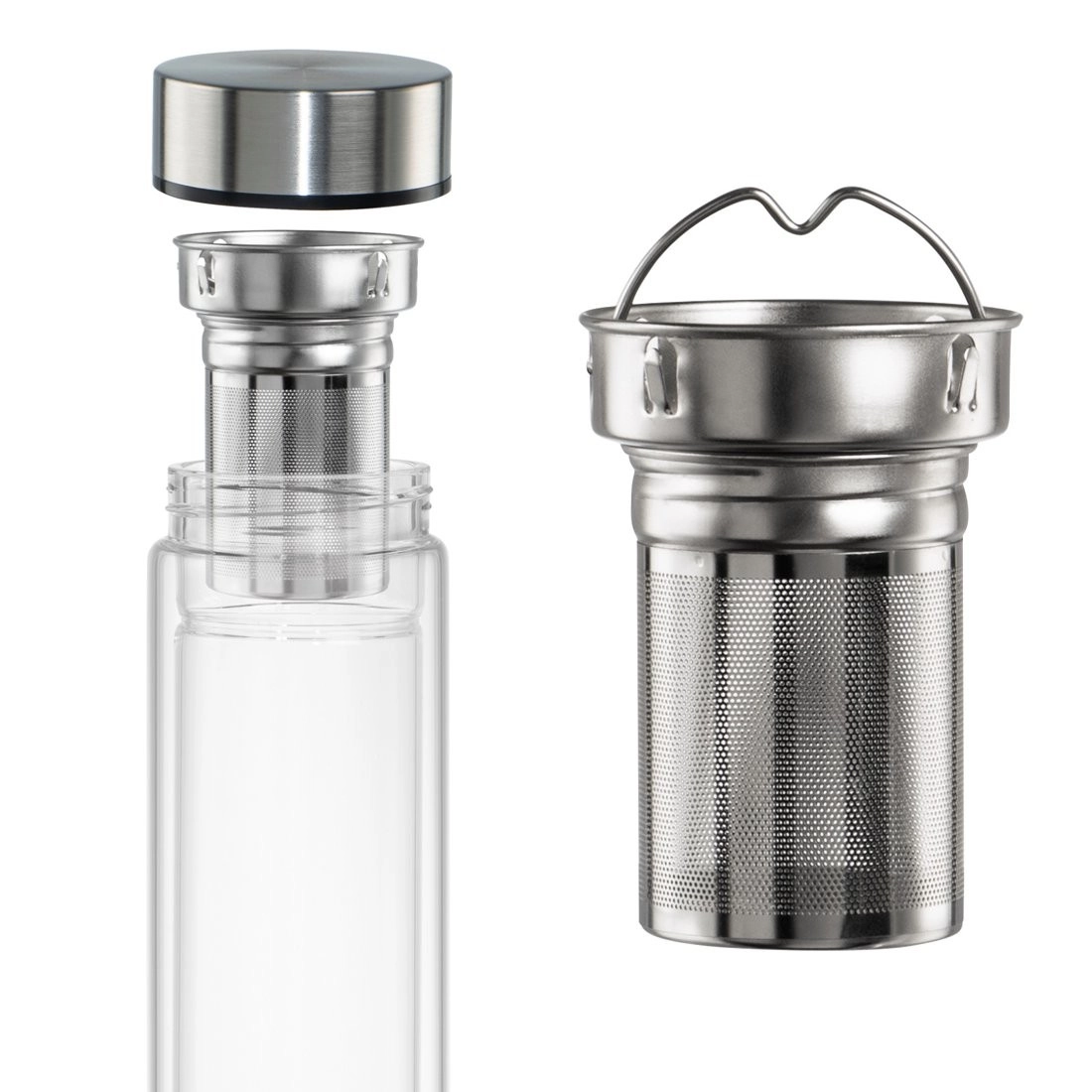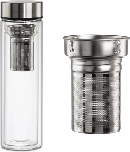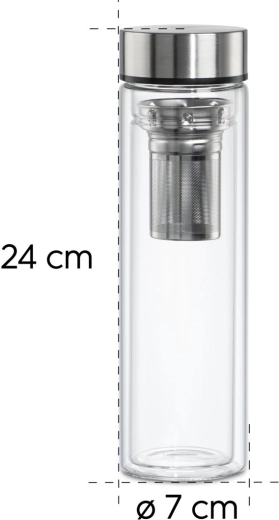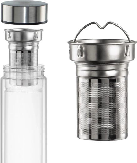 Zaradi kakovostnega borosilikatnega stekla je steklenička lahka, trpežna in nevtralnega okusa. Nerjavni pokrovček s silikonskim tesnilom preprečuje iztekanje v torbi ali nahrbtniku. Odstranljivo fino cedilo s priročnim držajem olajša rokovanje in čiščenje.