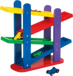 Lesena dirkalna steza z barvnimi avtomobilčki