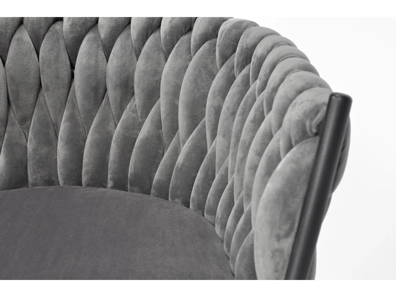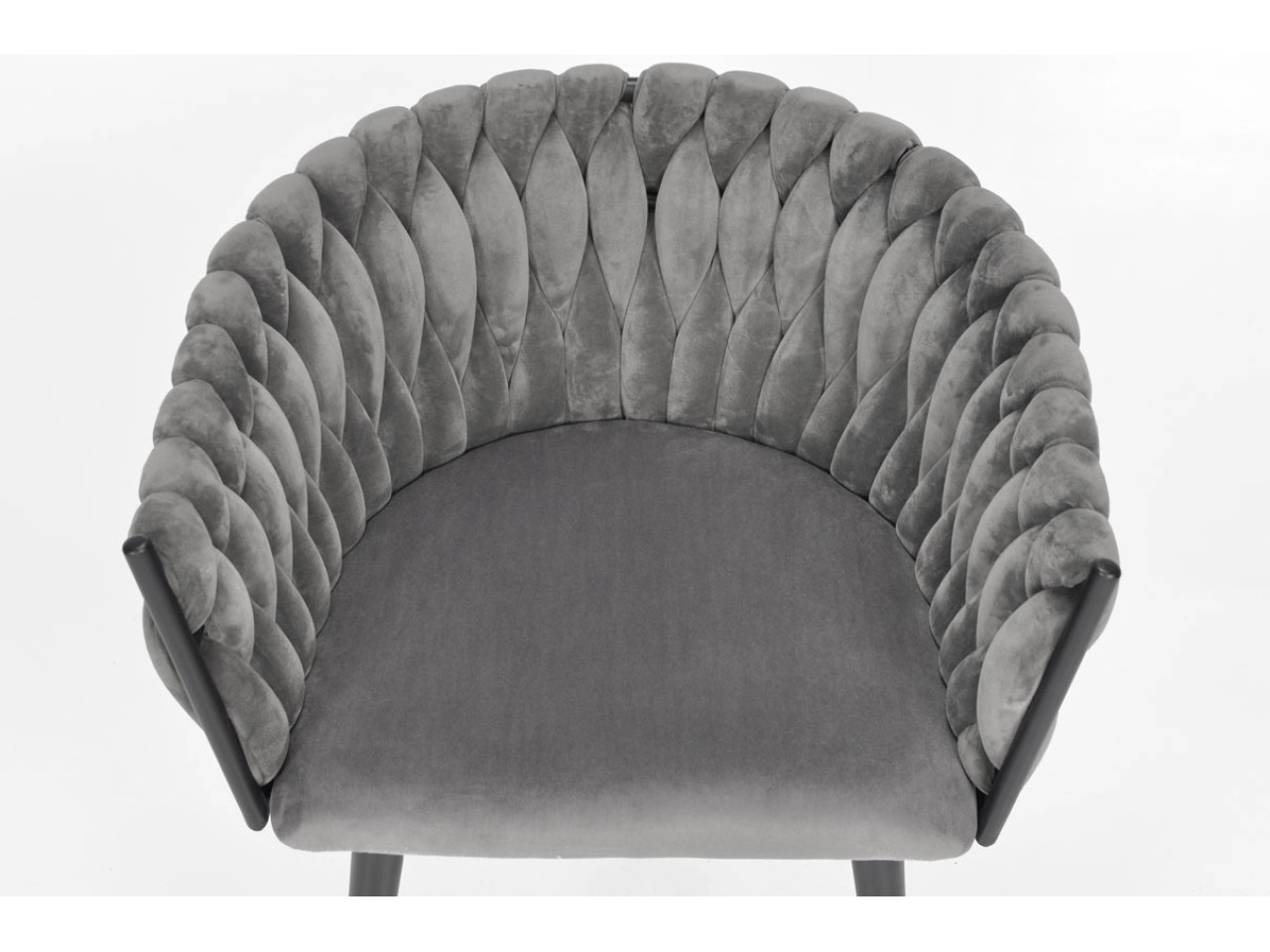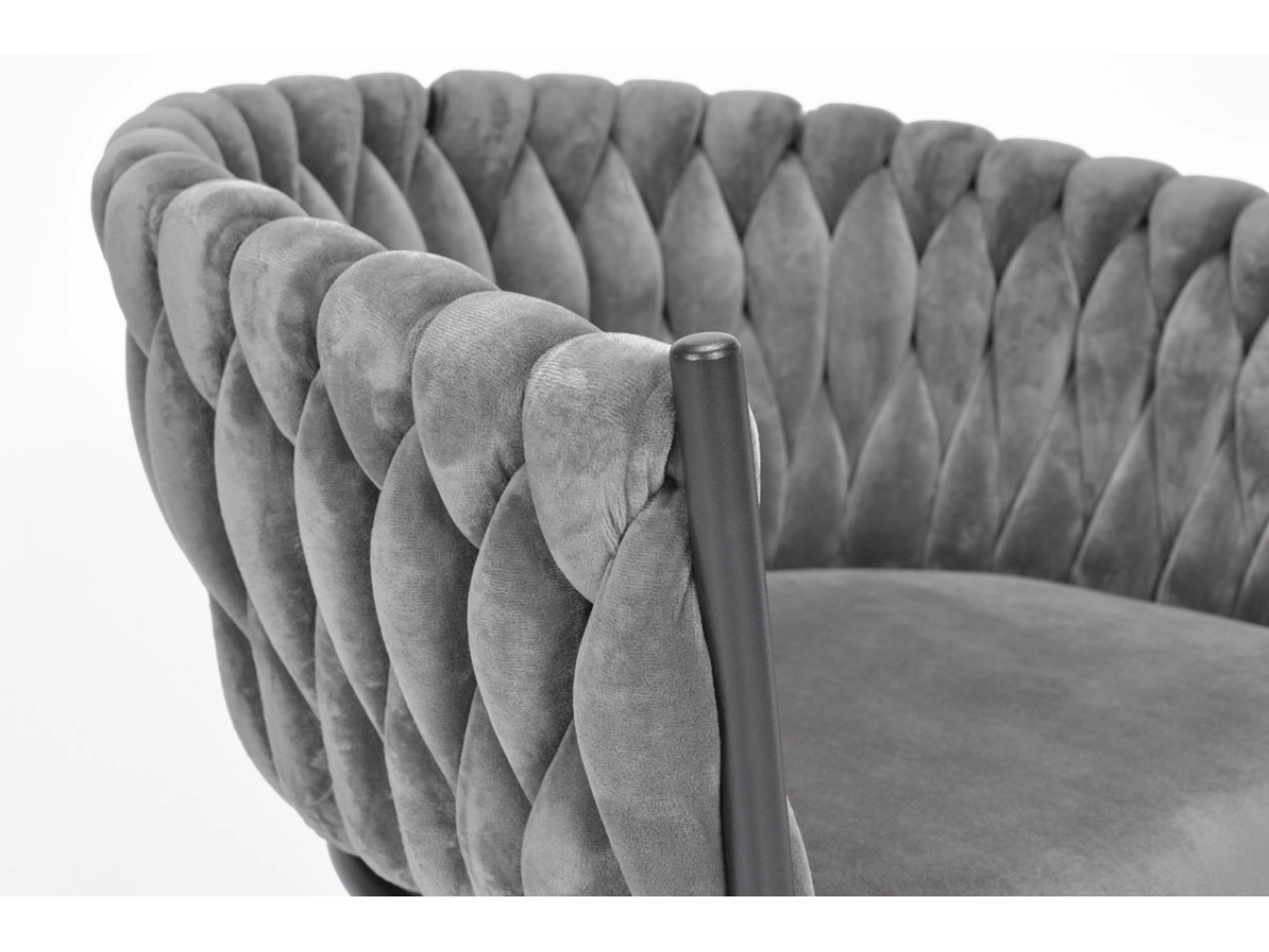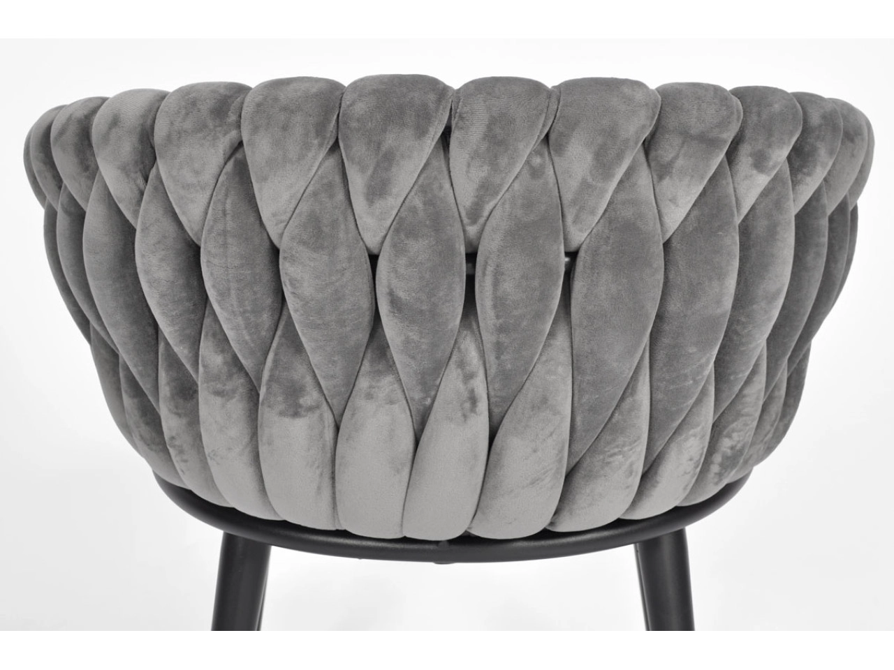 V svoj dom vnesite eleganco in udobje v modernem glamur slogu. Žametno oblazinjenje z nežnim sijajem deluje razkošno in lepo kontrastira s črnimi, vitkimi kovinskimi nogami. Izrazit pleteni naslon je dekorativni element, ki pritegne pogled in stol spremeni v oblikovalski poudarek prostora.