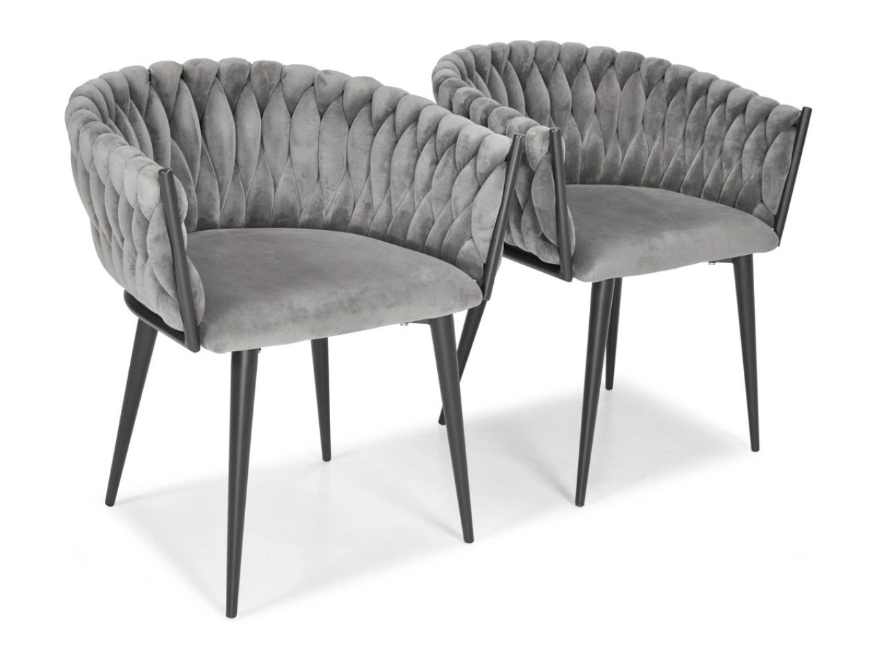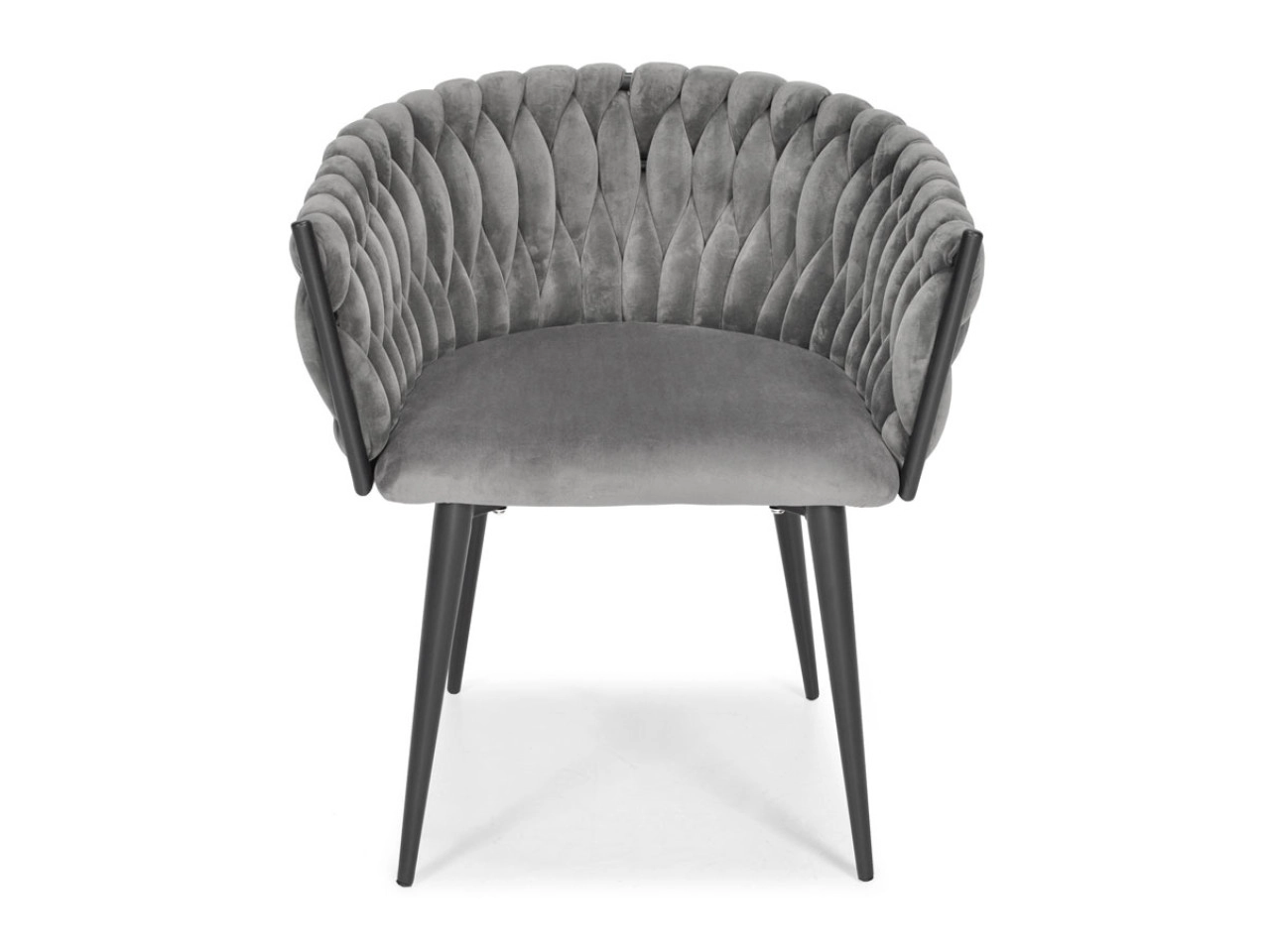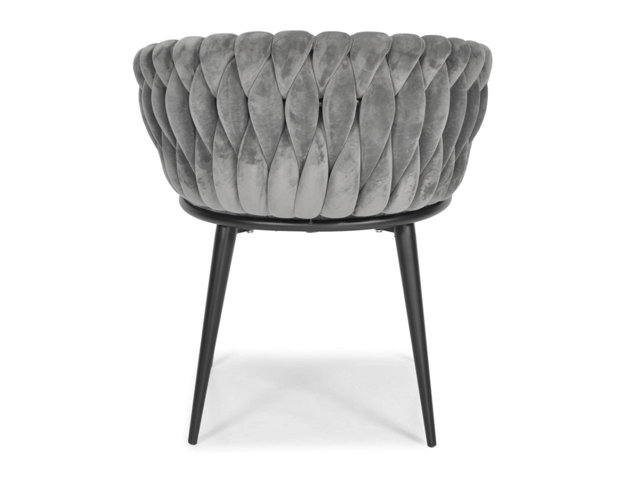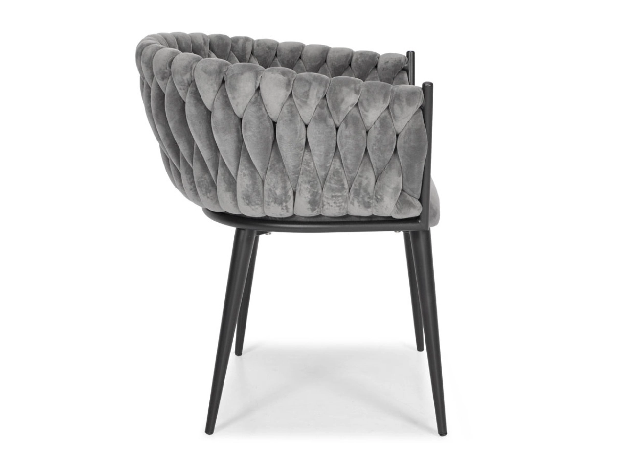 V svoj dom vnesite eleganco in udobje v modernem glamur slogu. Žametno oblazinjenje z nežnim sijajem deluje razkošno in lepo kontrastira s črnimi, vitkimi kovinskimi nogami. Izrazit pleteni naslon je dekorativni element, ki pritegne pogled in stol spremeni v oblikovalski poudarek prostora.