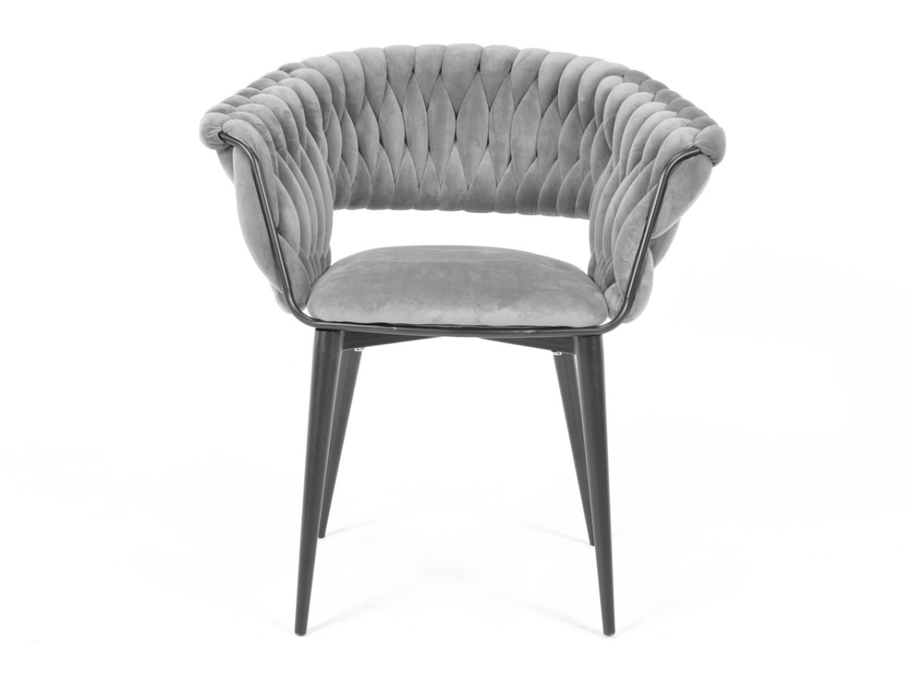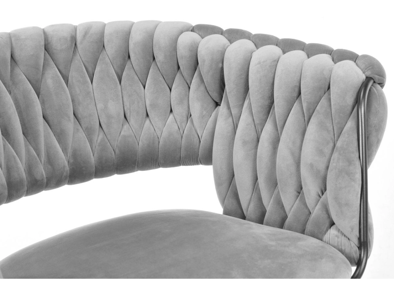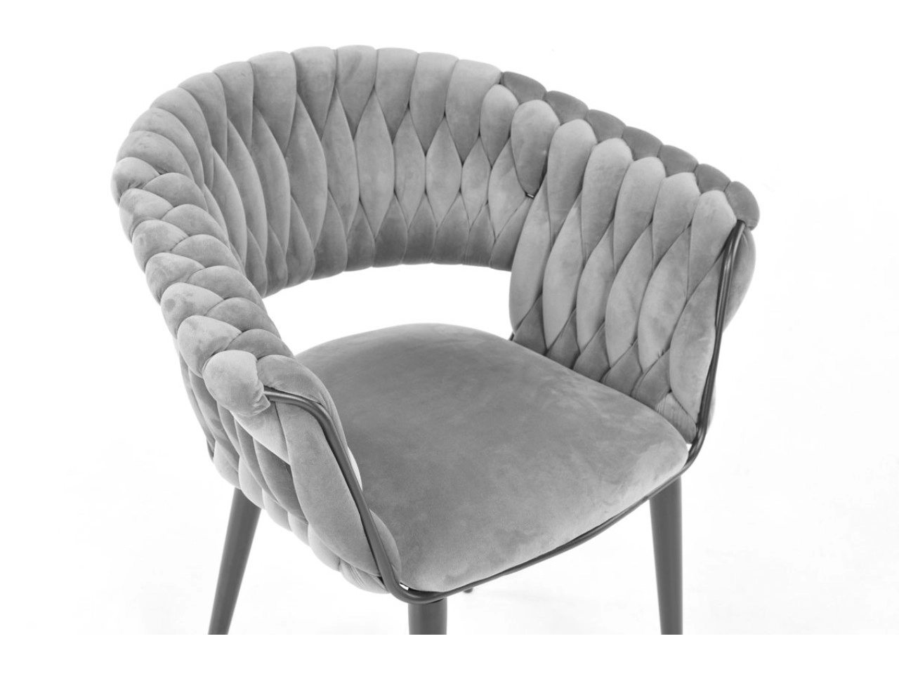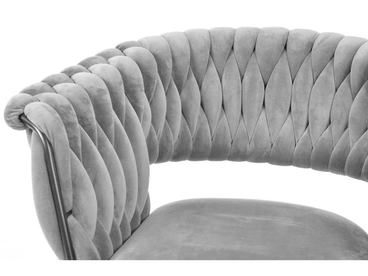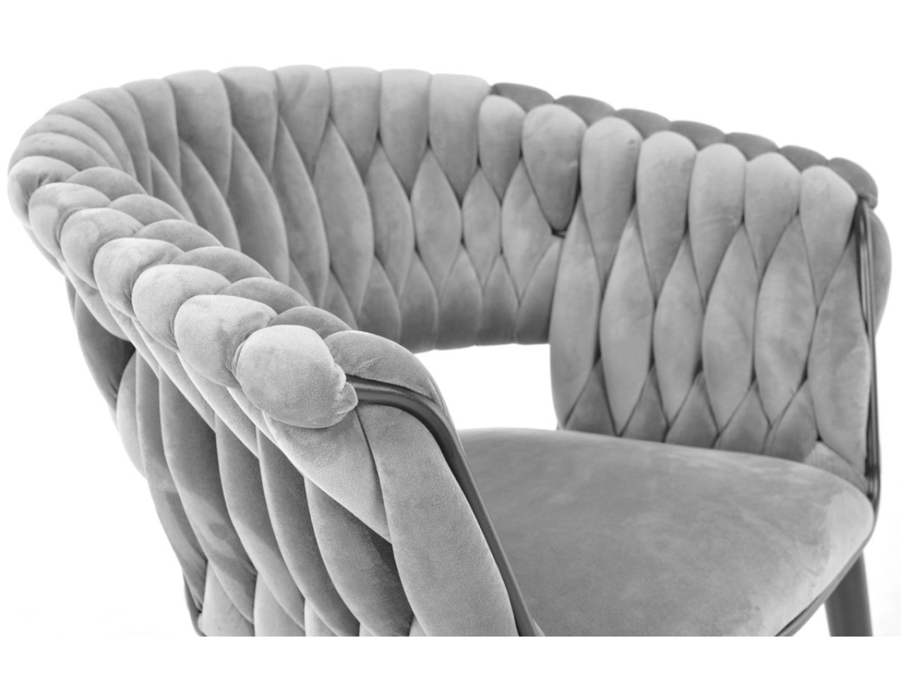 Eleganten siv naslanjač iz mehkega „velvet“ žameta z izrazitim pletenim naslonom in črnimi kovinskimi nogami doda interierju moderen glamur pridih. Ponuja udobno oblazinjenje, stabilno konstrukcijo in stilski kontrast sive in črne, ki se poda jedilnici, dnevni sobi in delovni sobi.