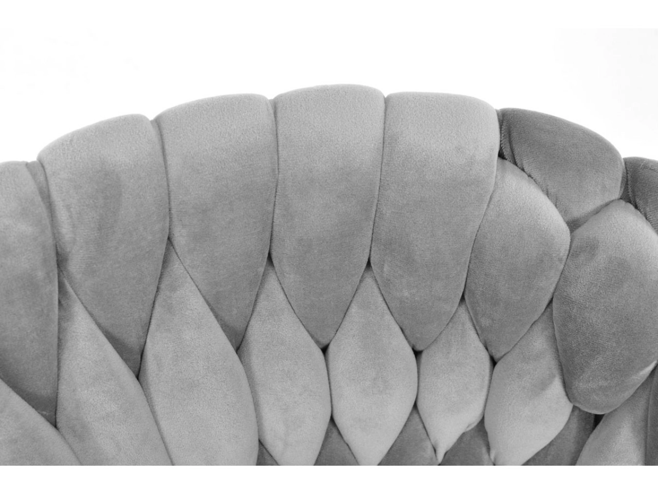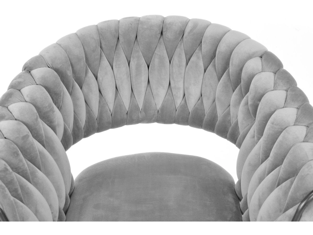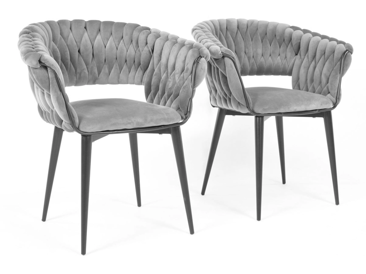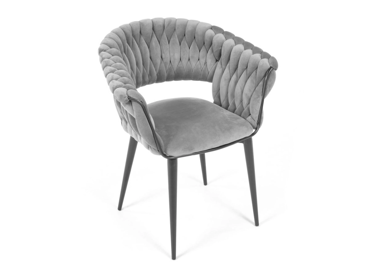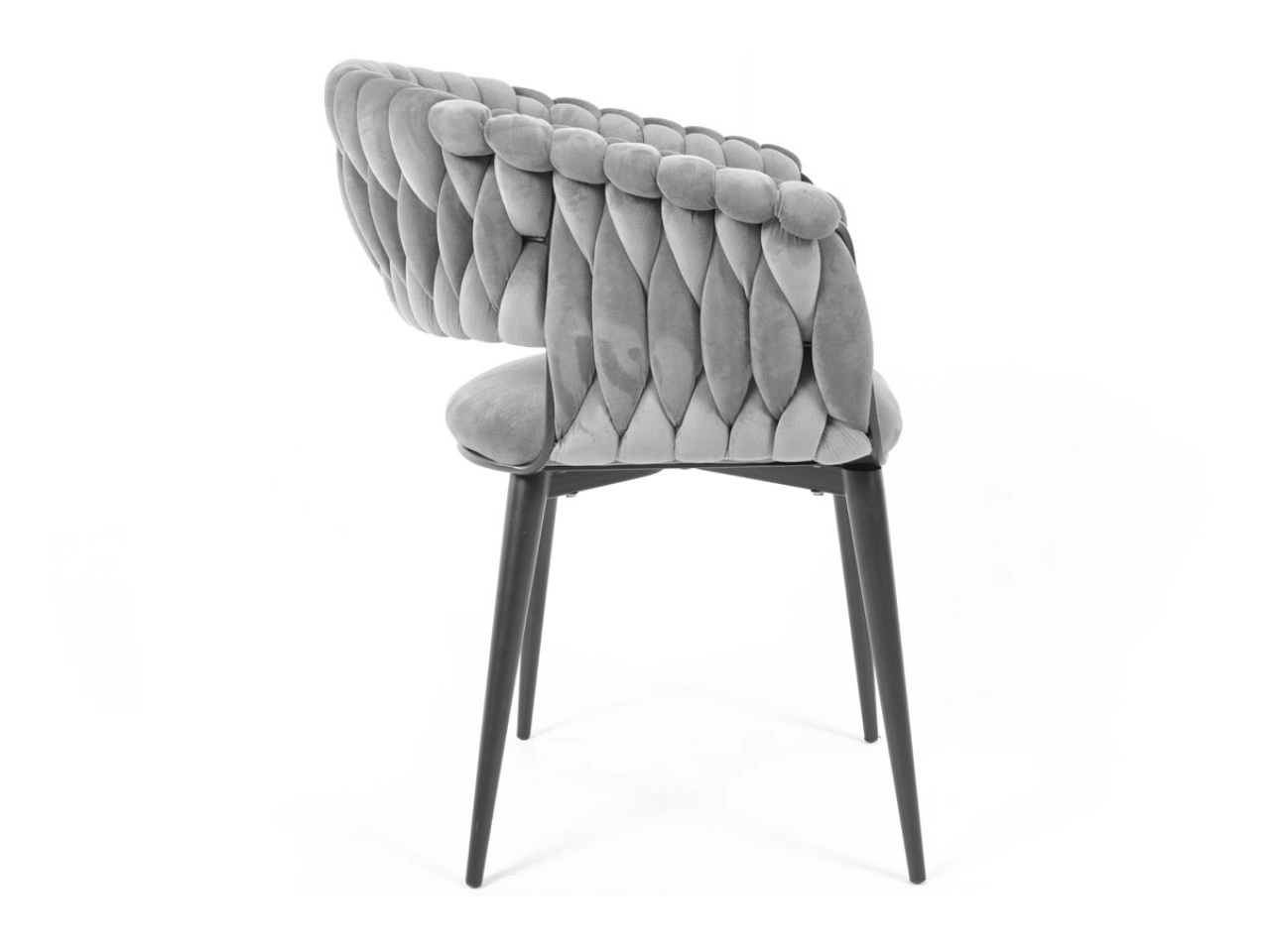 Eleganten siv naslanjač iz mehkega „velvet“ žameta z izrazitim pletenim naslonom in črnimi kovinskimi nogami doda interierju moderen glamur pridih. Ponuja udobno oblazinjenje, stabilno konstrukcijo in stilski kontrast sive in črne, ki se poda jedilnici, dnevni sobi in delovni sobi.