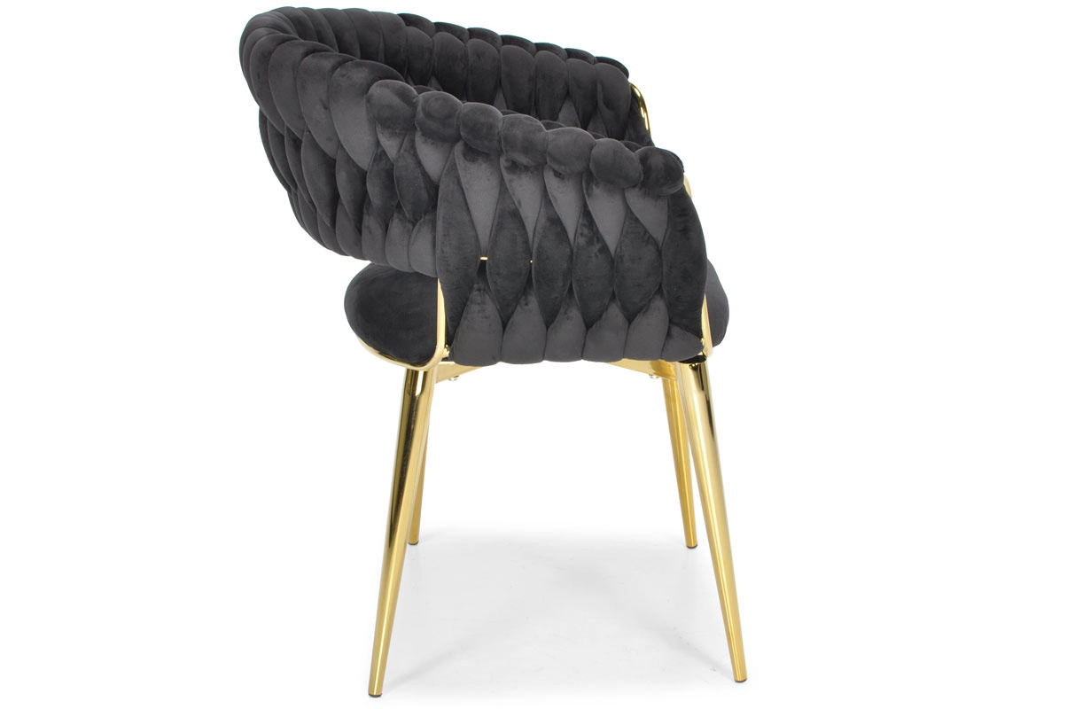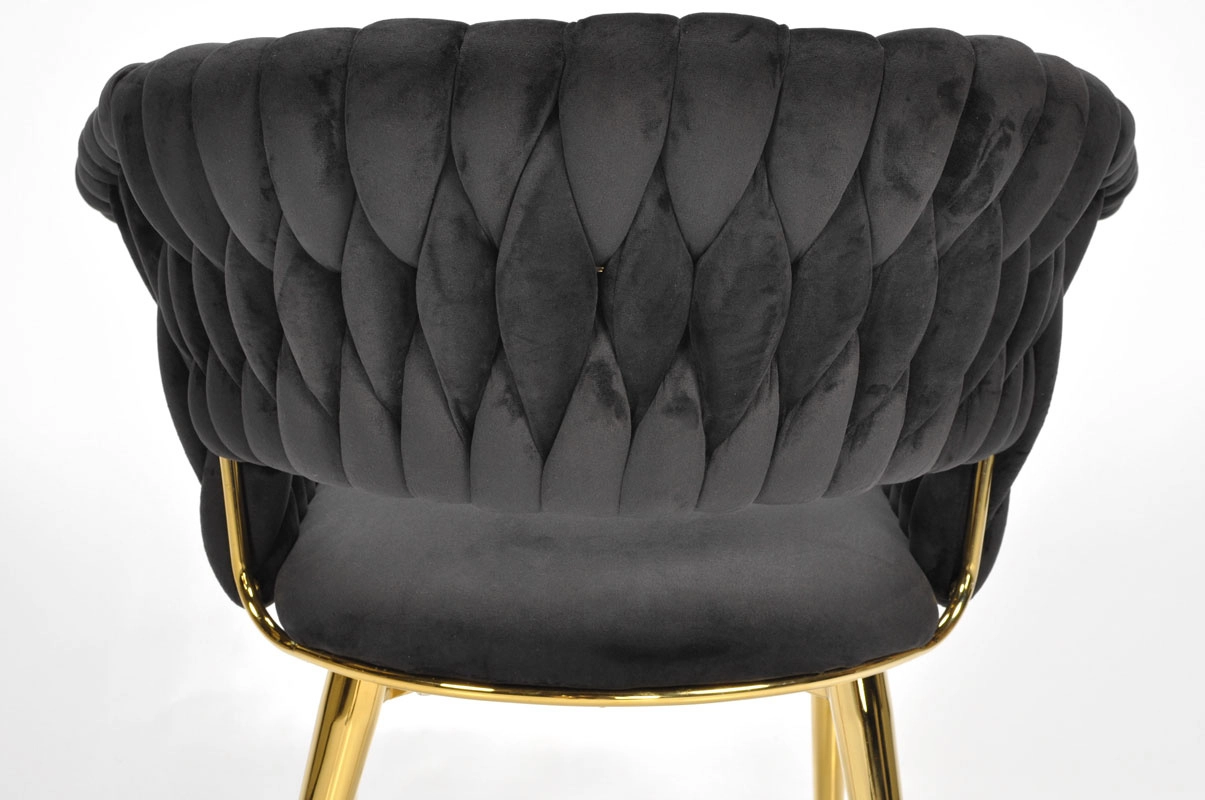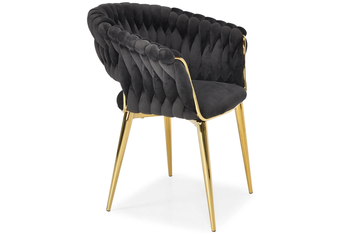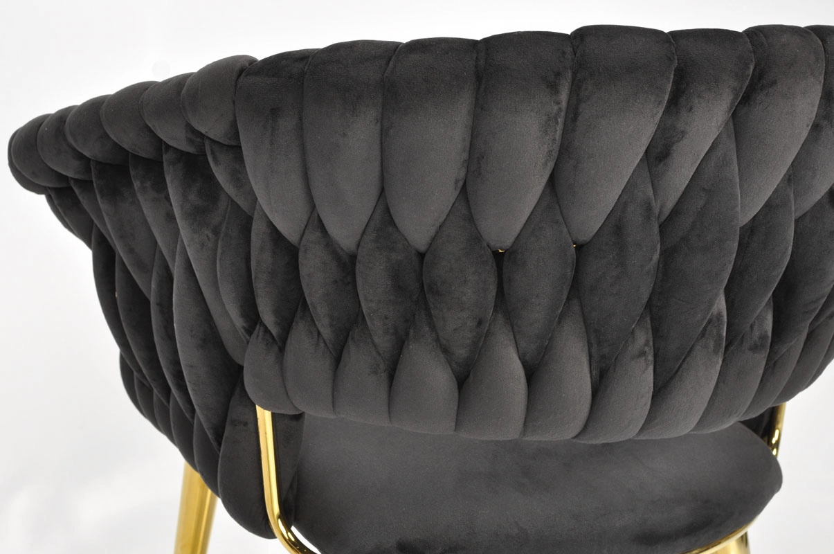 Ta moderen žametni stol združuje brezčasno črnino in zlate poudarke za maksimalen učinek. Velur oblazinjenje je na otip nežno in rahlo sijoče, zato odlično izstopa v jedilnici, dnevni sobi ali v stilski kavarni. Pleteno naslonjalo stolu doda dekorativni značaj in ga spremeni v izrazit solist.