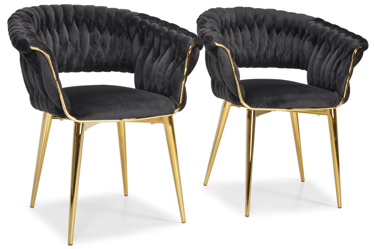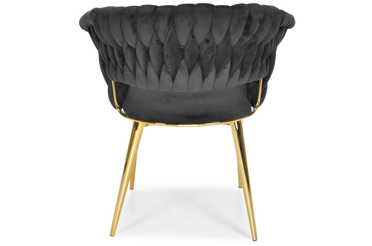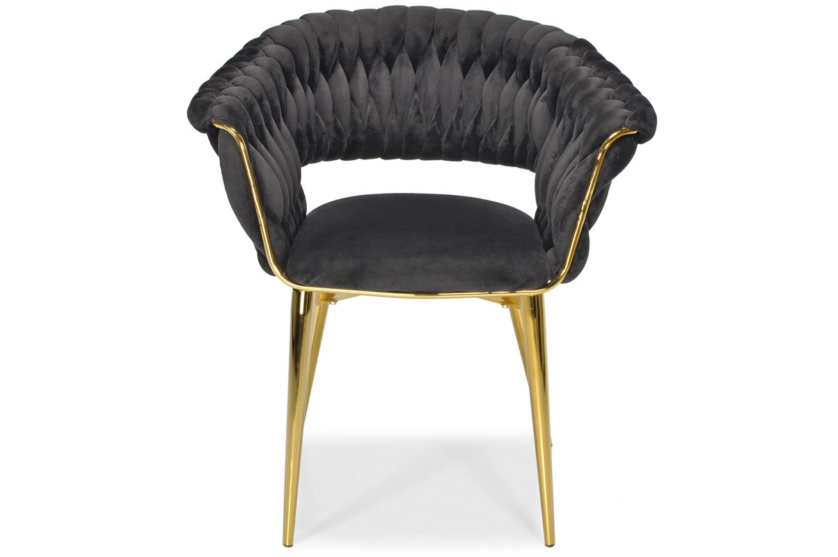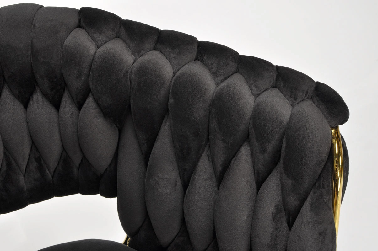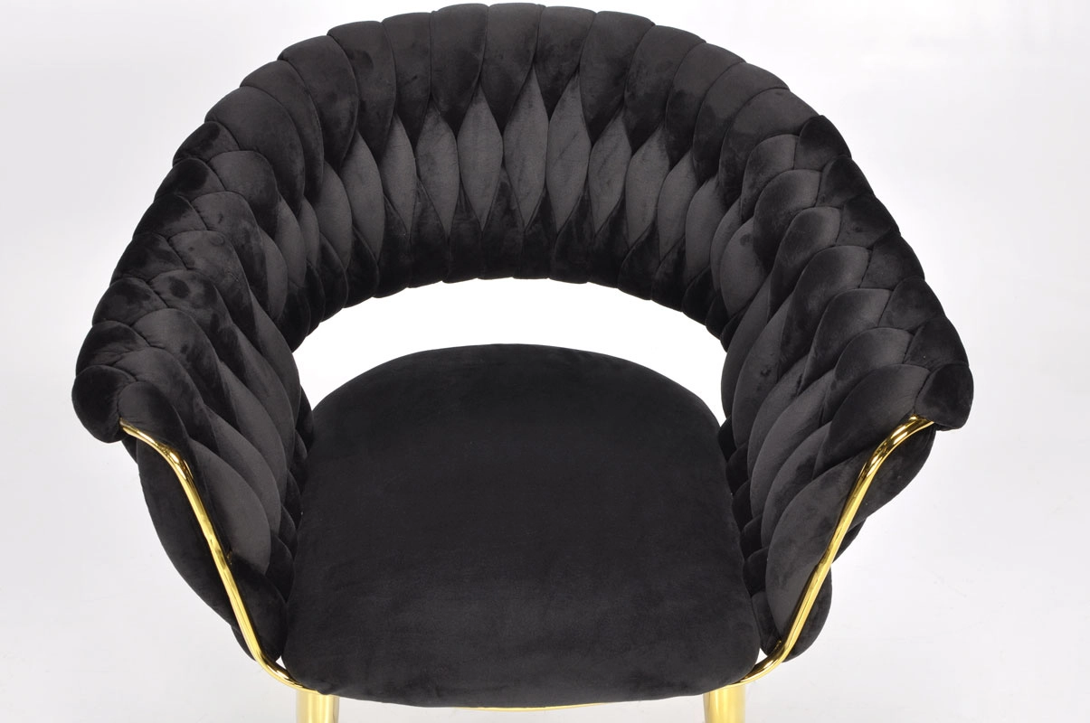 Ta moderen žametni stol združuje brezčasno črnino in zlate poudarke za maksimalen učinek. Velur oblazinjenje je na otip nežno in rahlo sijoče, zato odlično izstopa v jedilnici, dnevni sobi ali v stilski kavarni. Pleteno naslonjalo stolu doda dekorativni značaj in ga spremeni v izrazit solist.