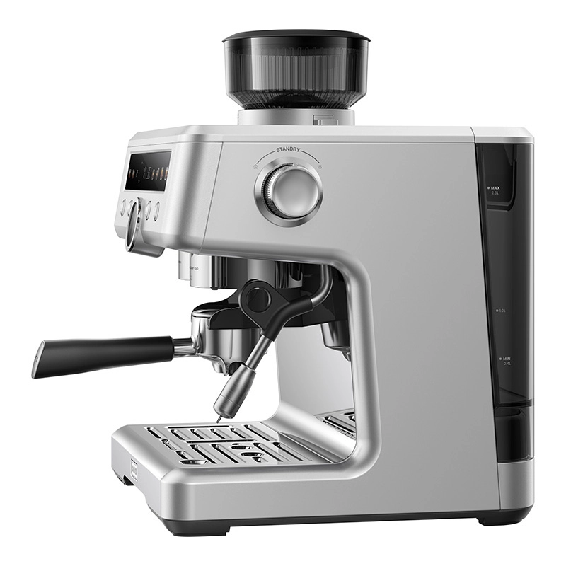 Vgrajeni stožčasti mlinček z 34 stopnjami mletja in zalogovnikom za 250 g zrn (s silikonskim tesnjenjem) ohranja največjo svežino. Funkcija Anti‑Static Grinding zmanjšuje oprijemanje in razsip mlete kave. Parna glava 58 mm z manometrom omogoča natančen nadzor poteka ekstrakcije, tlak 20 barov pa iz vsakega zrna izvabi polno aromo.