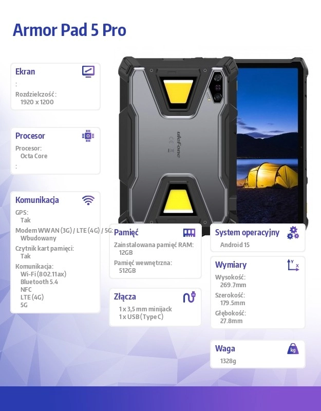 Ulefone Armor Pad 5 Pro je zasnovan za uporabnike, ki potrebujejo tablico, na katero se lahko zanesejo v vsaki situaciji. Robusta konstrukcija z gumiranimi vogali, ojačanimi robovi in zatesnjenimi vrati ščiti napravo pred udarci, prahom in vodo. Zahvaljujoč 5G ostanete povezani tudi na terenu, velik 11" zaslon pa nudi udobje za delo, navigacijo in multimedijo.