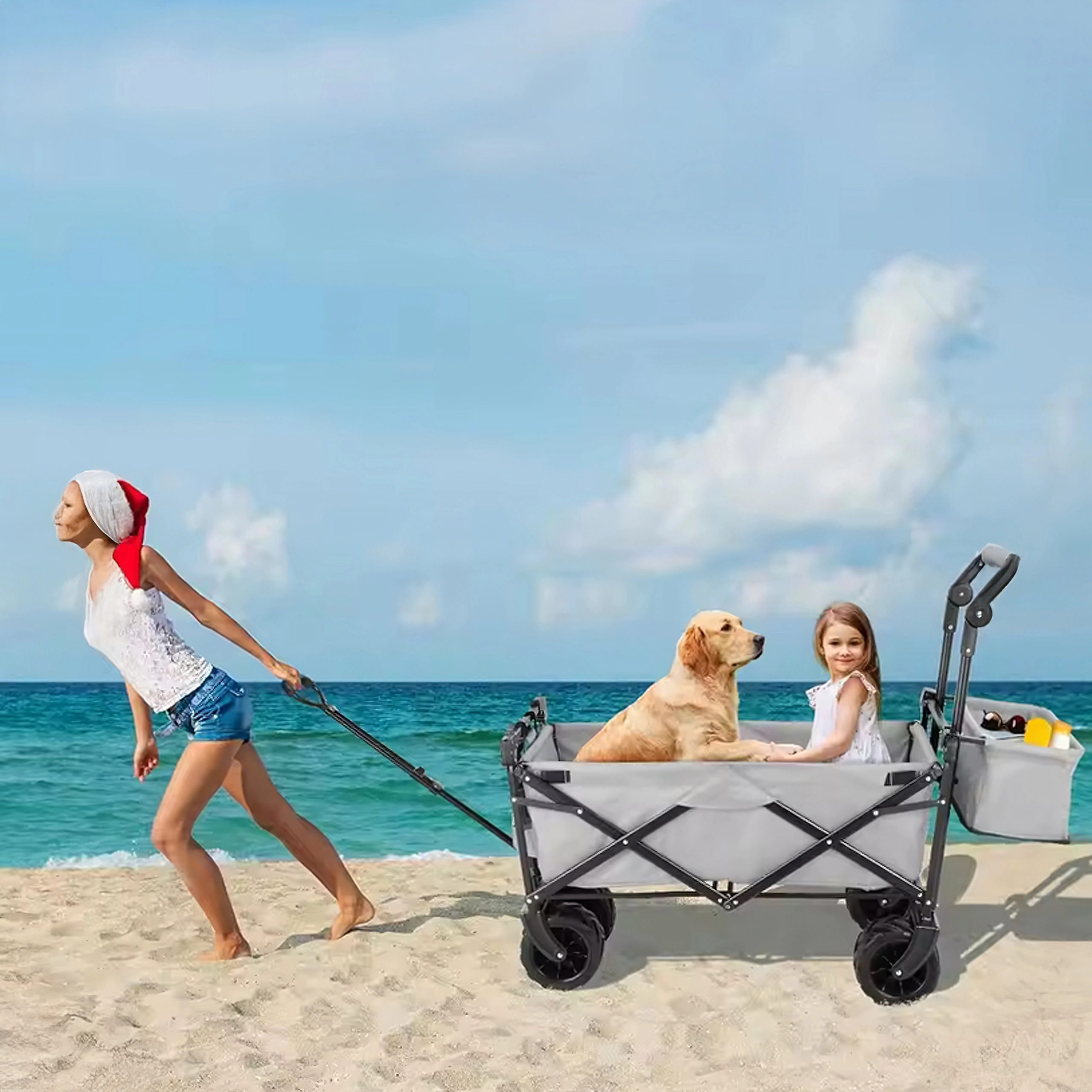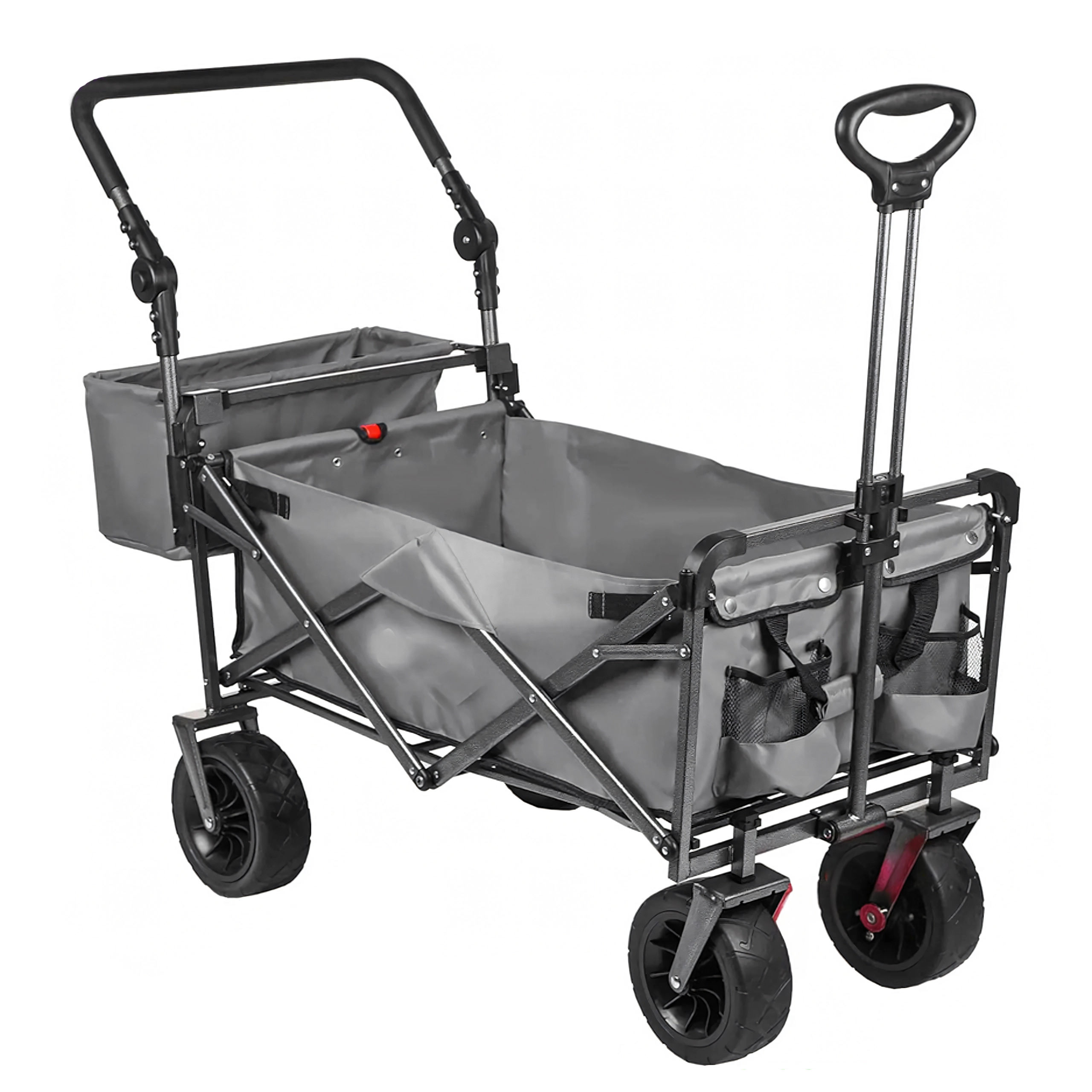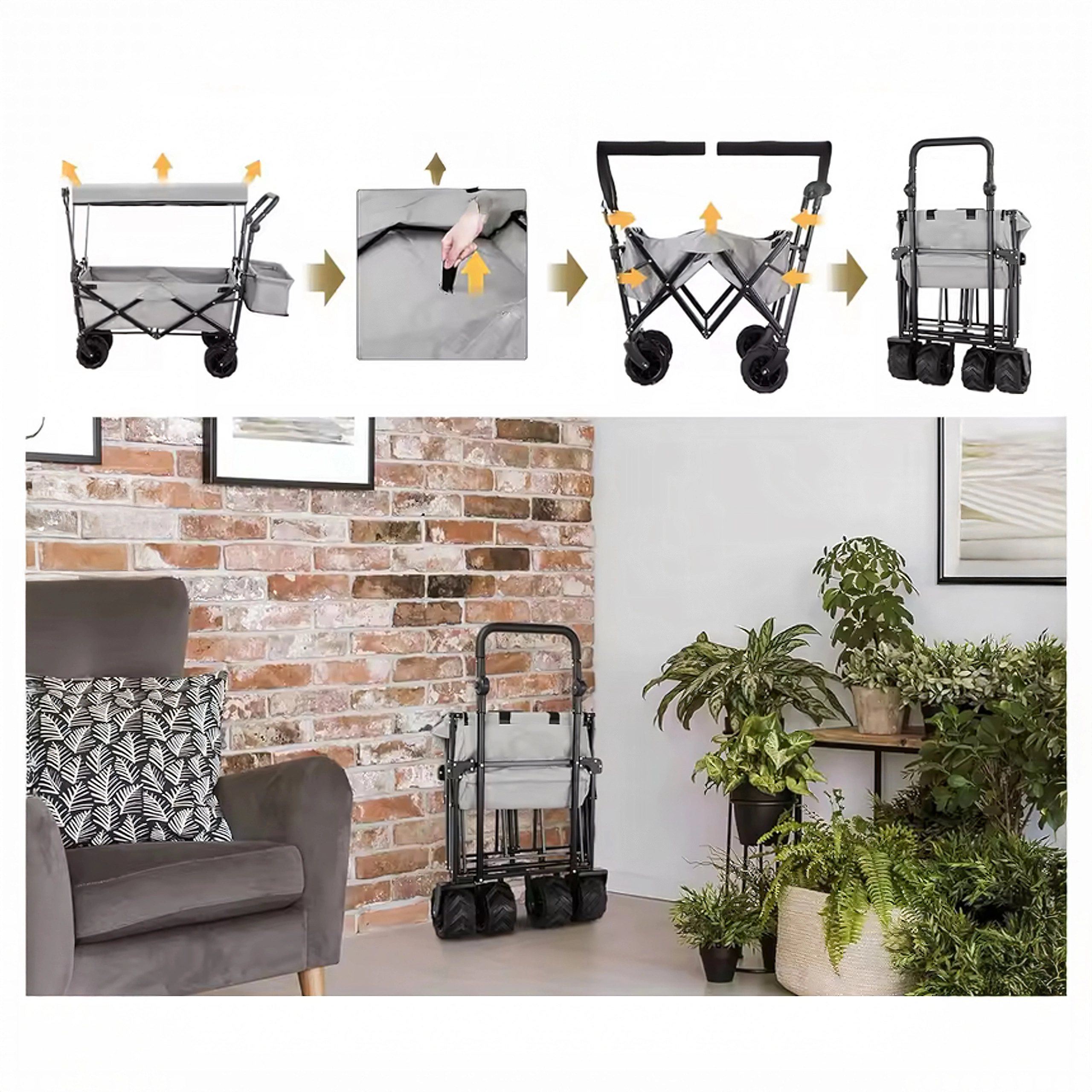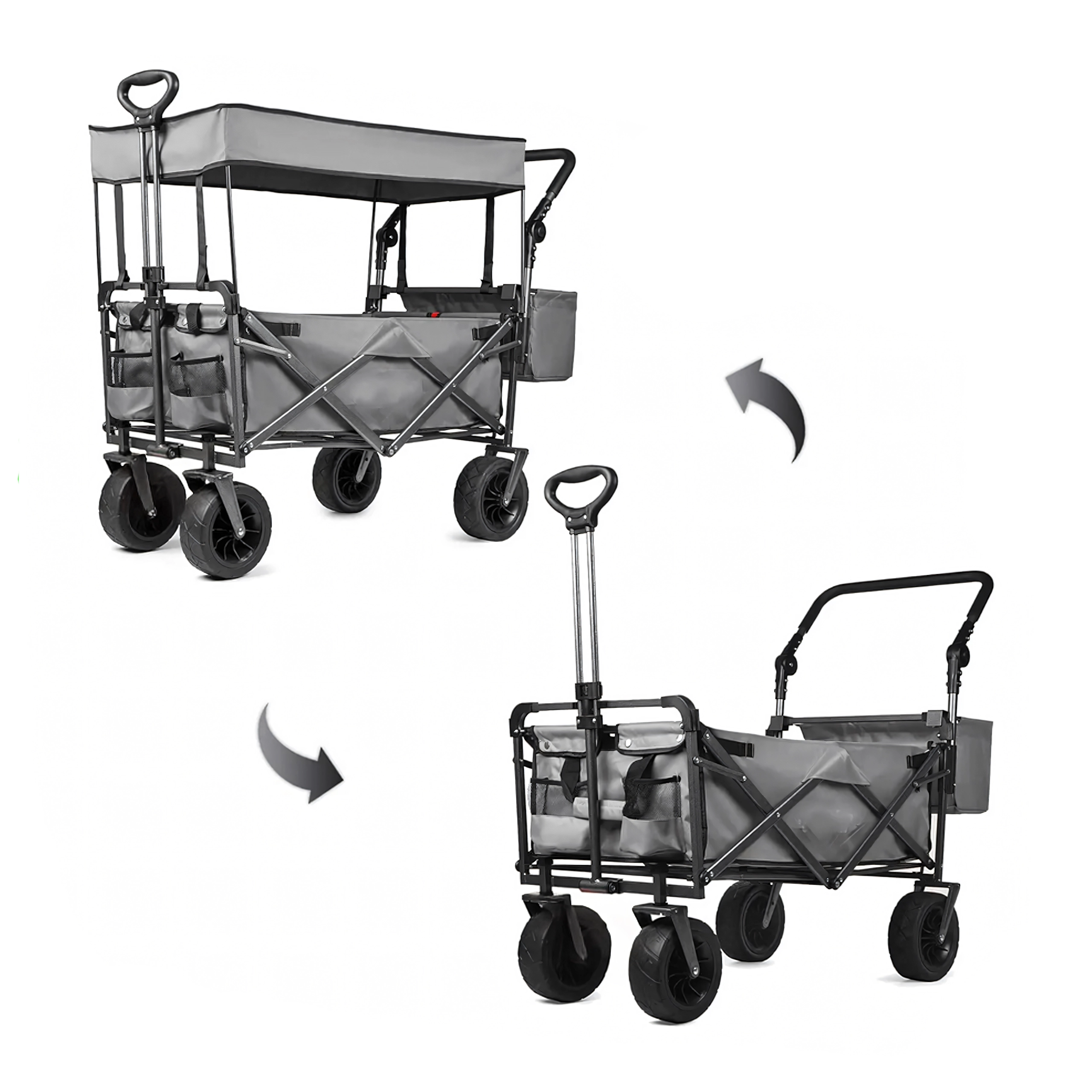 Univerzalni zložljiv voziček je idealen pomočnik za vrt, plažo, kampiranje in ribolov. Robusten okvir s trdnim tekstilnim koritom zlahka prenese orodje, nakupe, športno opremo in plažne dodatke. Zahvaljujoč kolesom XL se zlahka premika po pesku, travi in gramozu, medtem ko strešica nudi senco in zaščito pred soncem.