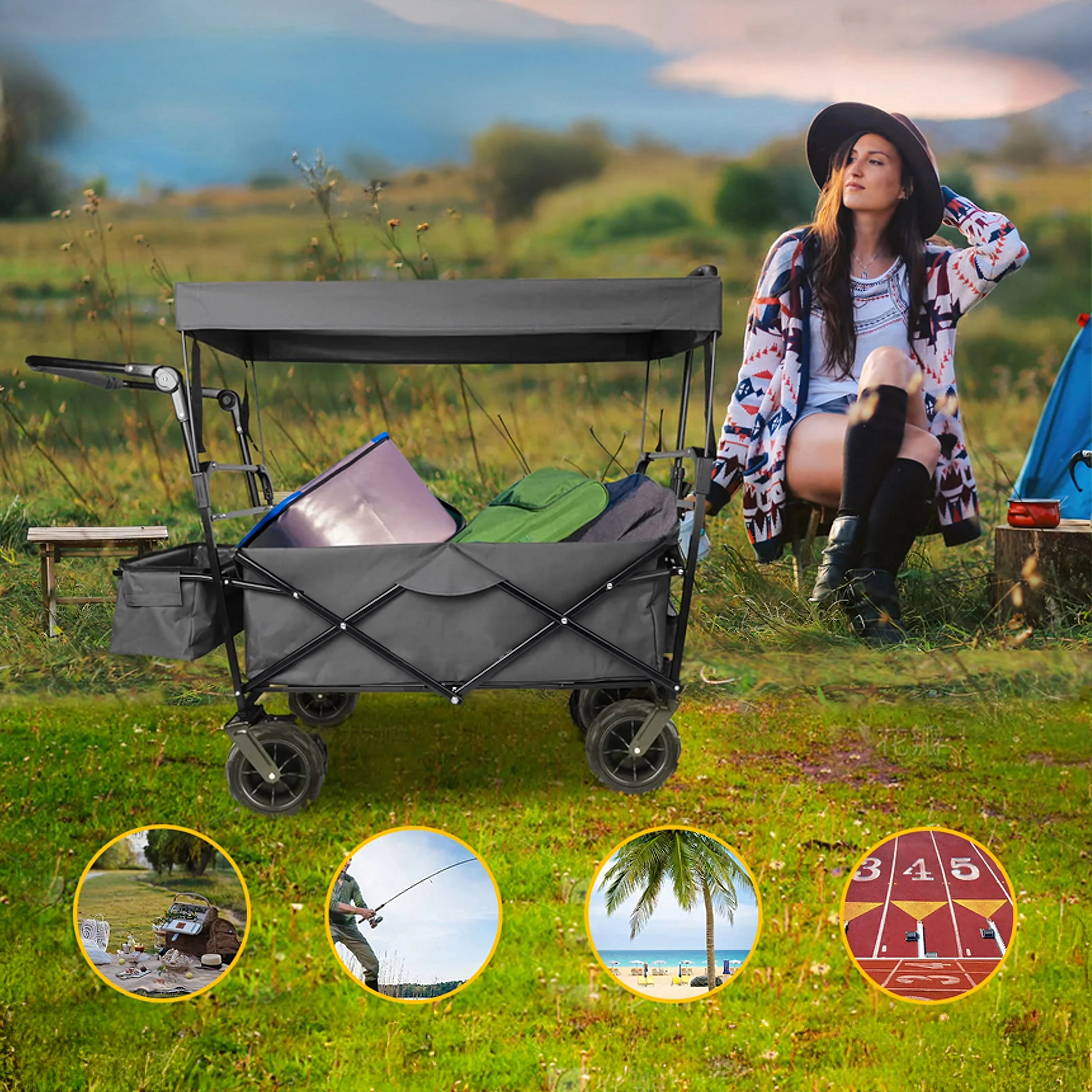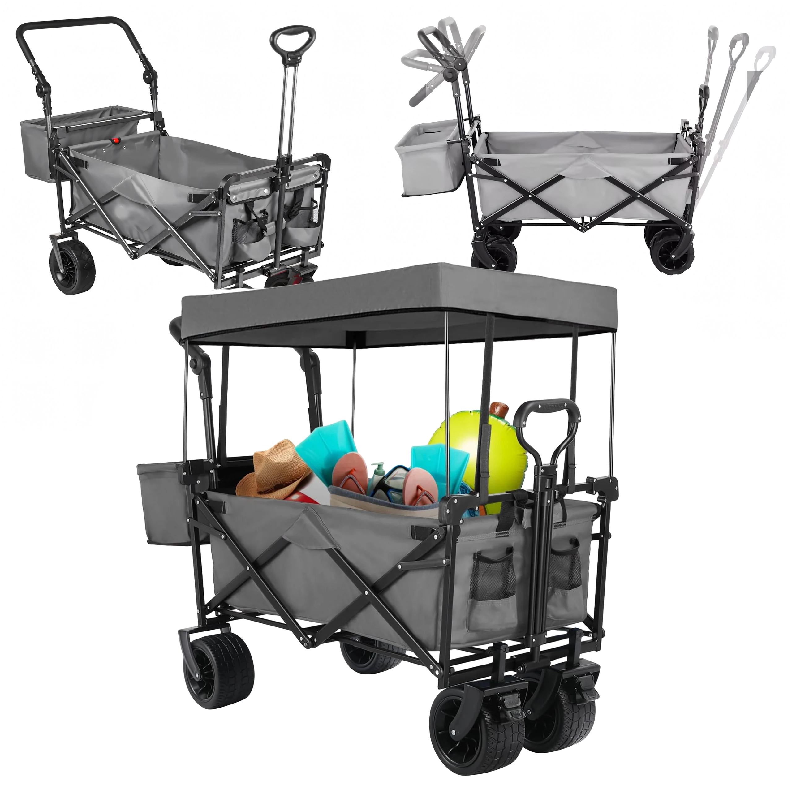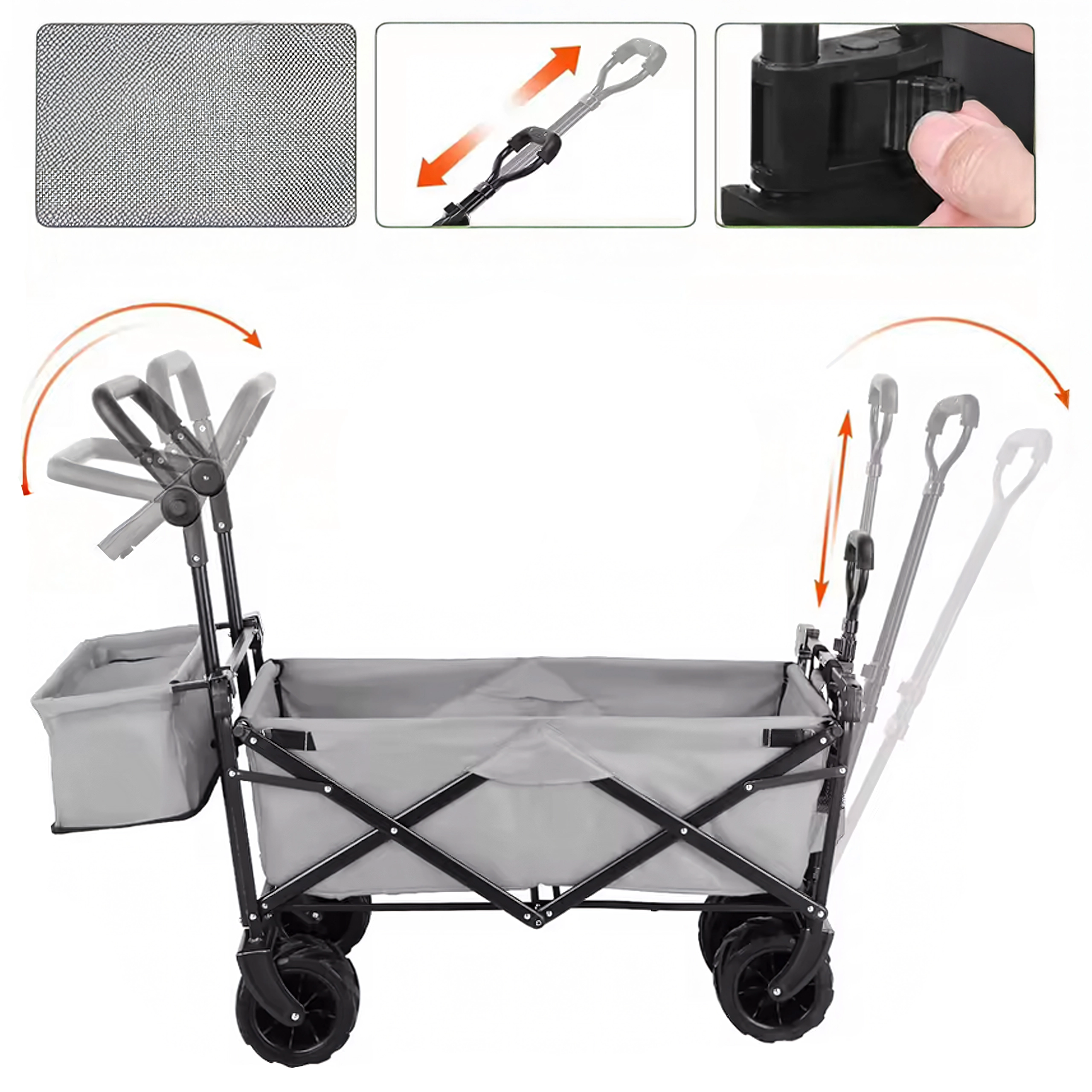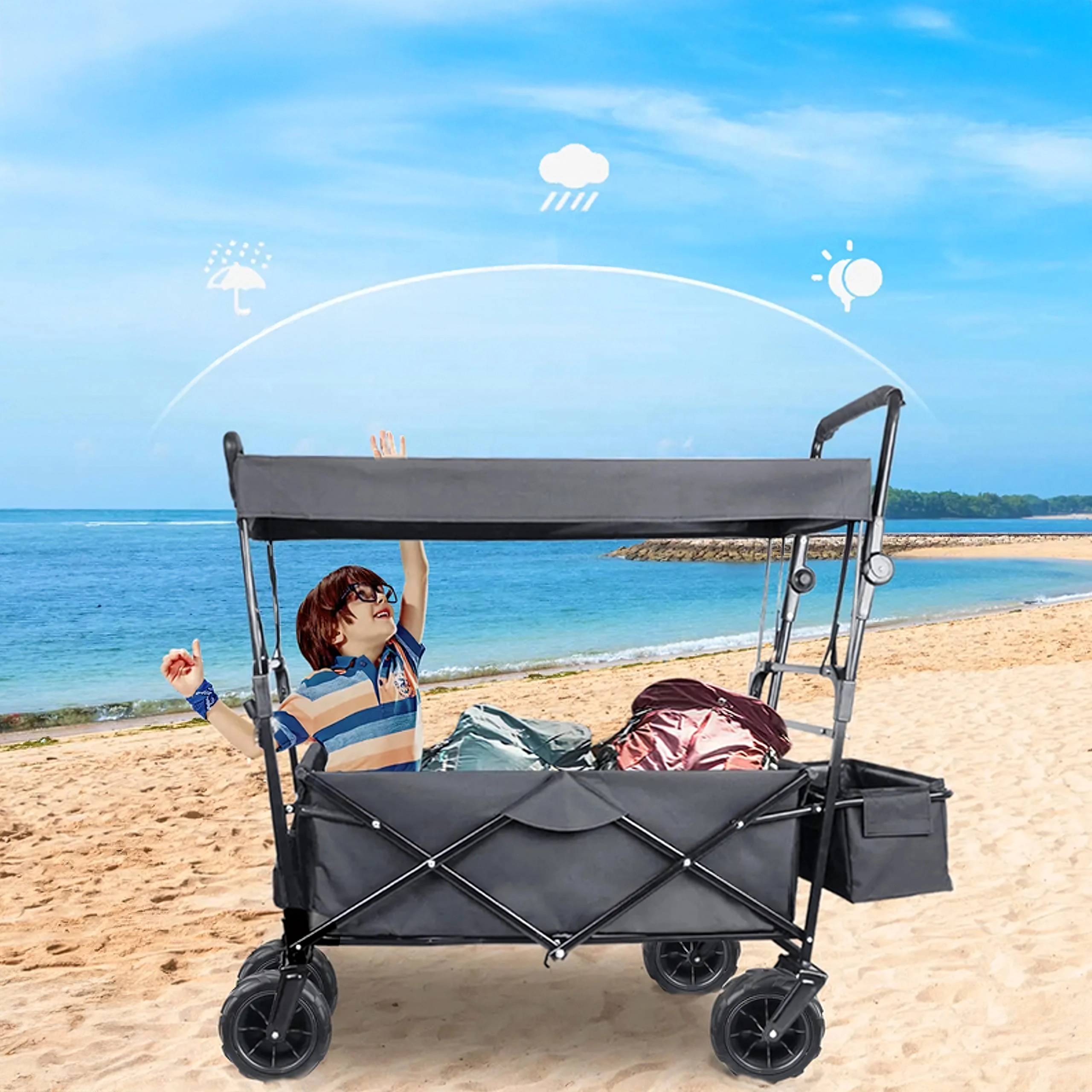 Univerzalni zložljiv voziček je idealen pomočnik za vrt, plažo, kampiranje in ribolov. Robusten okvir s trdnim tekstilnim koritom zlahka prenese orodje, nakupe, športno opremo in plažne dodatke. Zahvaljujoč kolesom XL se zlahka premika po pesku, travi in gramozu, medtem ko strešica nudi senco in zaščito pred soncem.