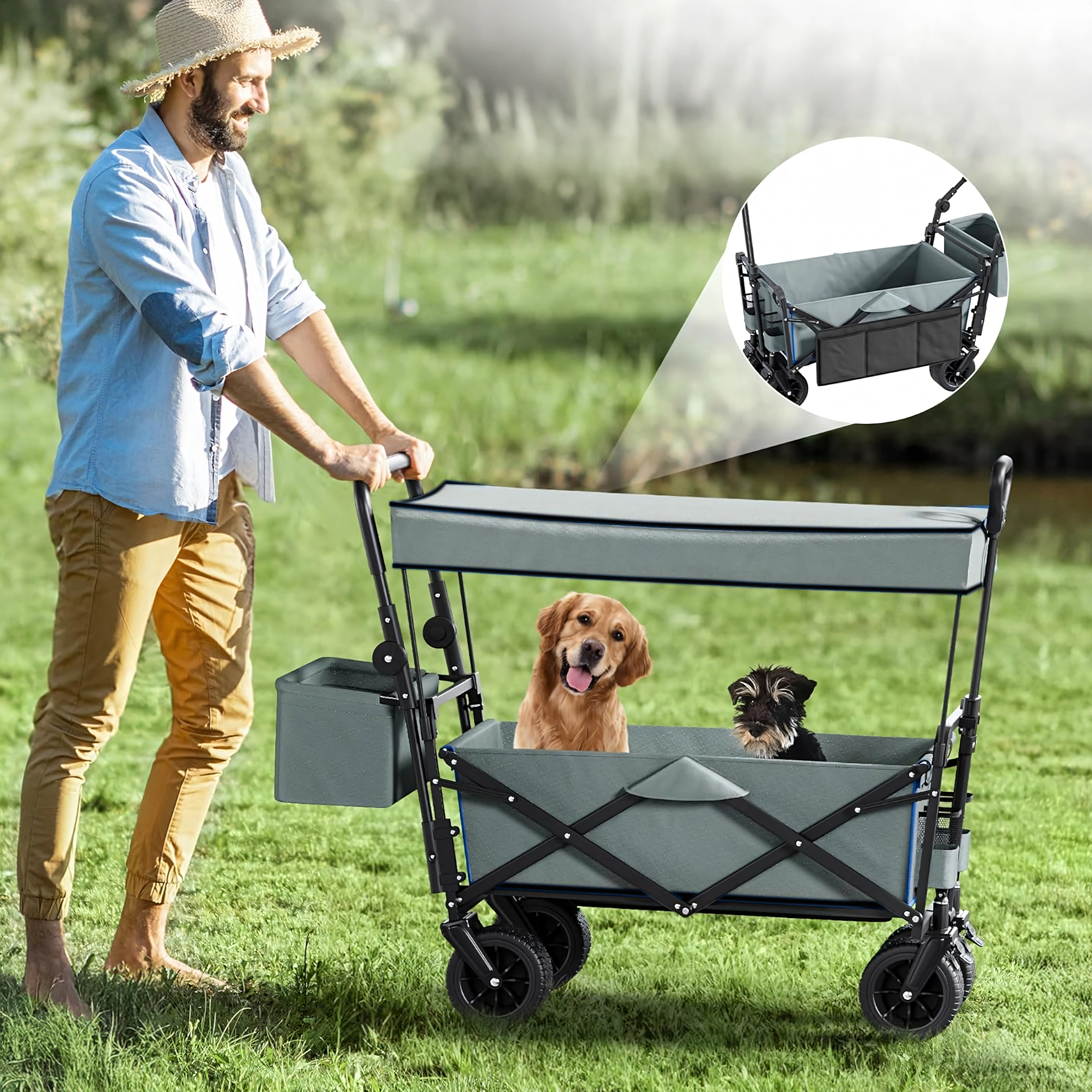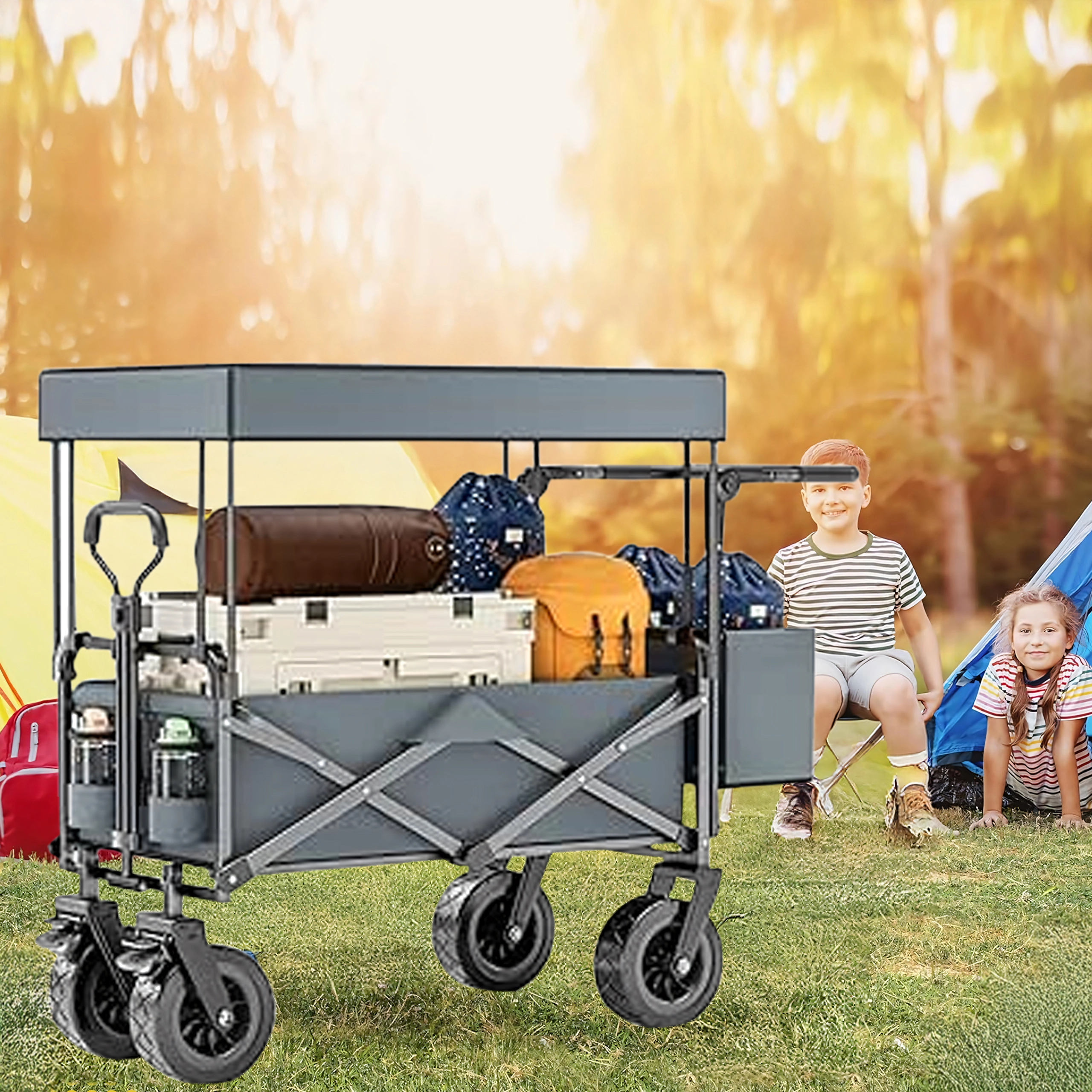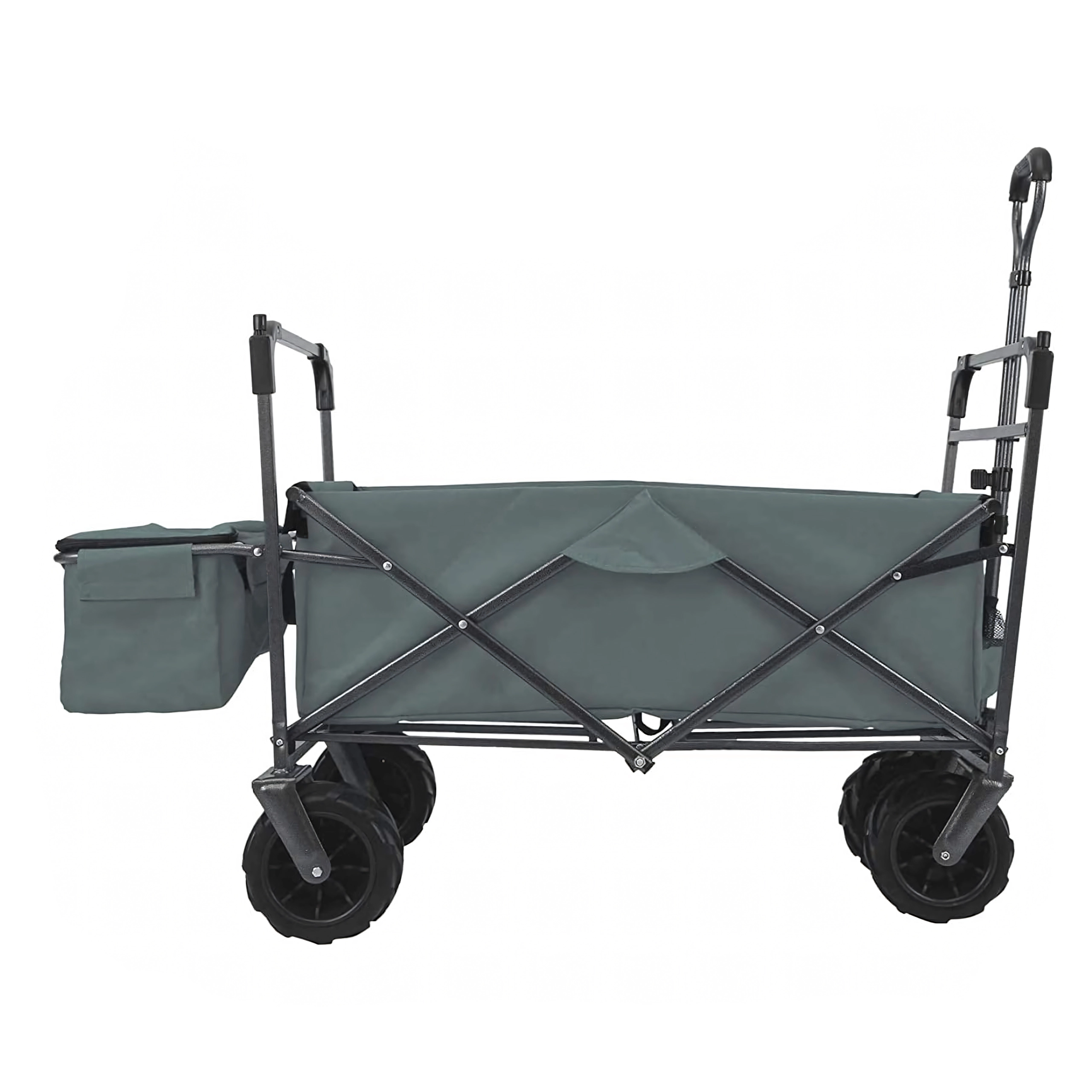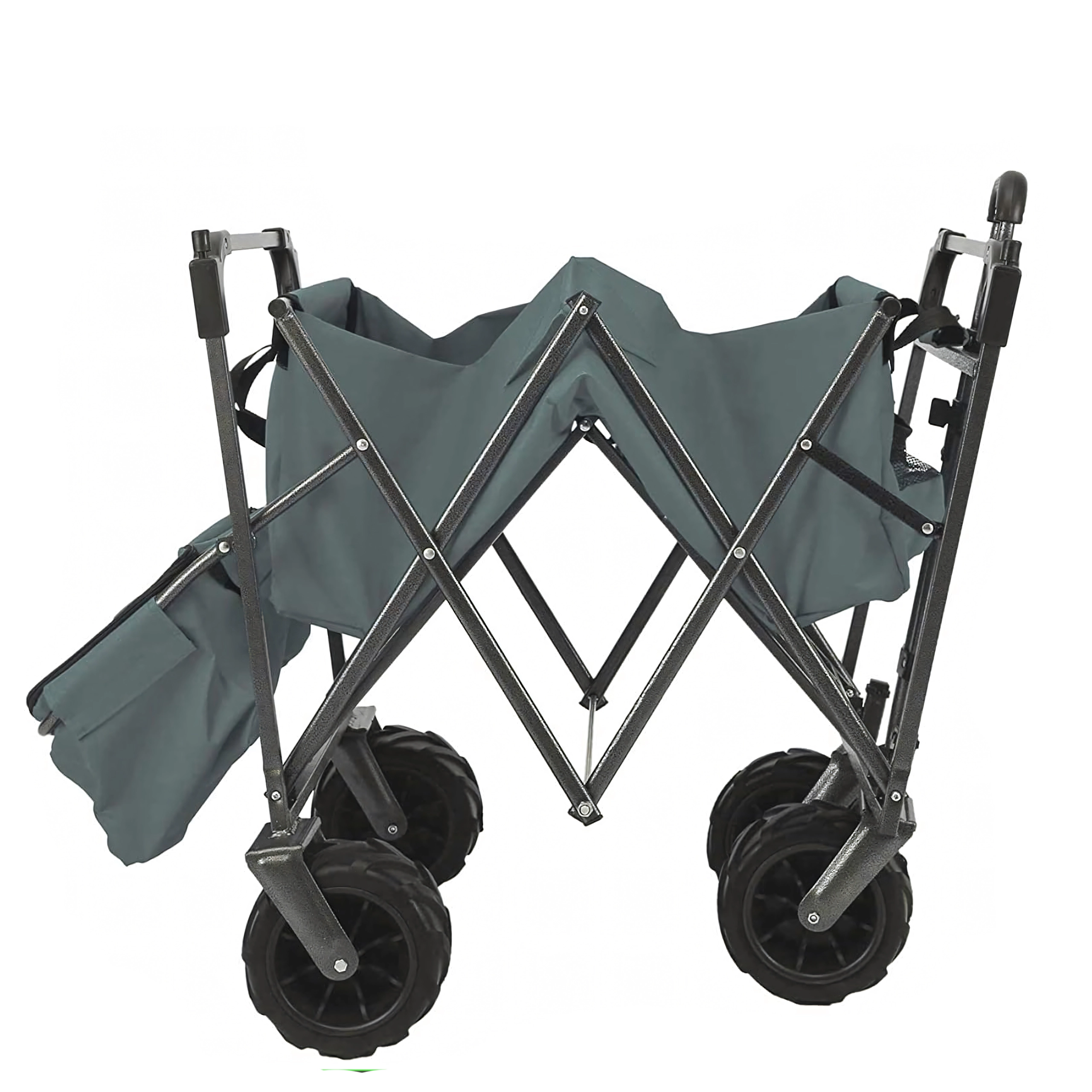 Univerzalni zložljiv voziček je idealen pomočnik za vrt, plažo, kampiranje in ribolov. Robusten okvir s trdnim tekstilnim koritom zlahka prenese orodje, nakupe, športno opremo in plažne dodatke. Zahvaljujoč kolesom XL se zlahka premika po pesku, travi in gramozu, medtem ko strešica nudi senco in zaščito pred soncem.