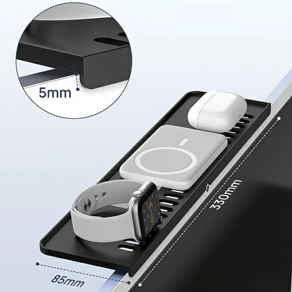 Montaža je opravljena v hipu: preprosto nastavite kot rok in polico namestite na zgornji rob monitorja. Gumirane kontaktne površine zagotavljajo stabilnost in ščitijo površino monitorja pred praskami. Zahvaljujoč nastavitvi naklona do 120° in združljivosti z debelino monitorjev 5–20 mm je primerna za iMac in običajne PC monitorje.