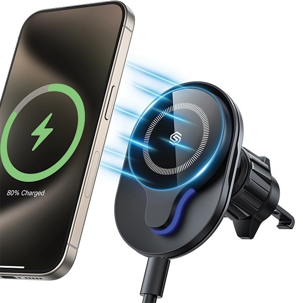Kompakten magnetni avtomobilski nosilec z MagSafe in brezžičnim polnjenjem 15 W varno drži telefon na zračni rešetki. Zahvaljujoč močnemu magnetu, 360° vrtljivemu zglobu in stabilnemu kavljičnemu sponu je idealen za navigacijo in prostoročno uporabo. Primerno za iPhone 15/14/13/12. Ni primerno za okrogle zračnike.