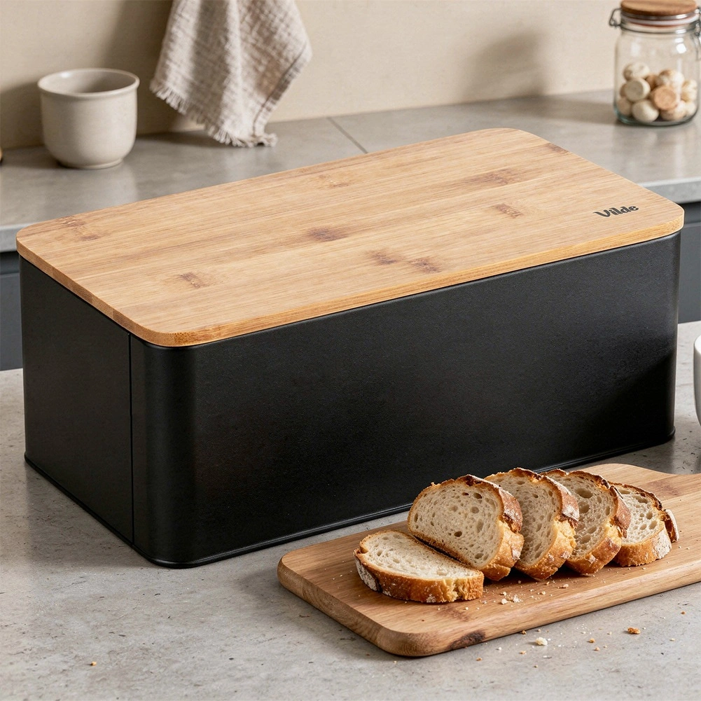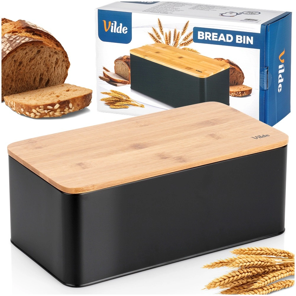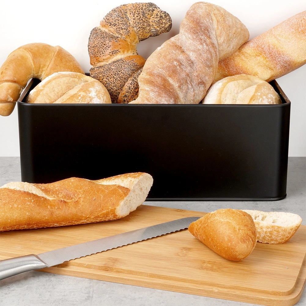 Prostoren zaboj za kruh v sodobni črni izvedbi združuje trpežno kovinsko ohišje z naravnim bambusovim pokrovom, ki hkrati služi kot deska. Mere 33 × 18 × 13 cm zagotavljajo dovolj prostora za kruh, bagete in žemlje, medtem ko čvrsta konstrukcija ščiti pecivo pred zmečkanjem.