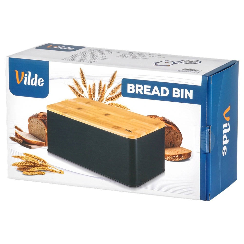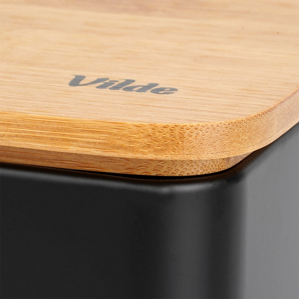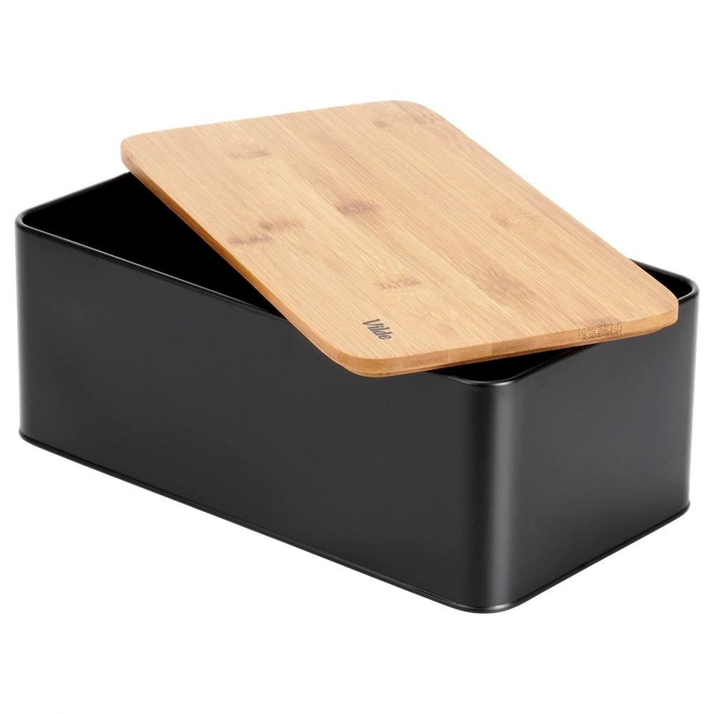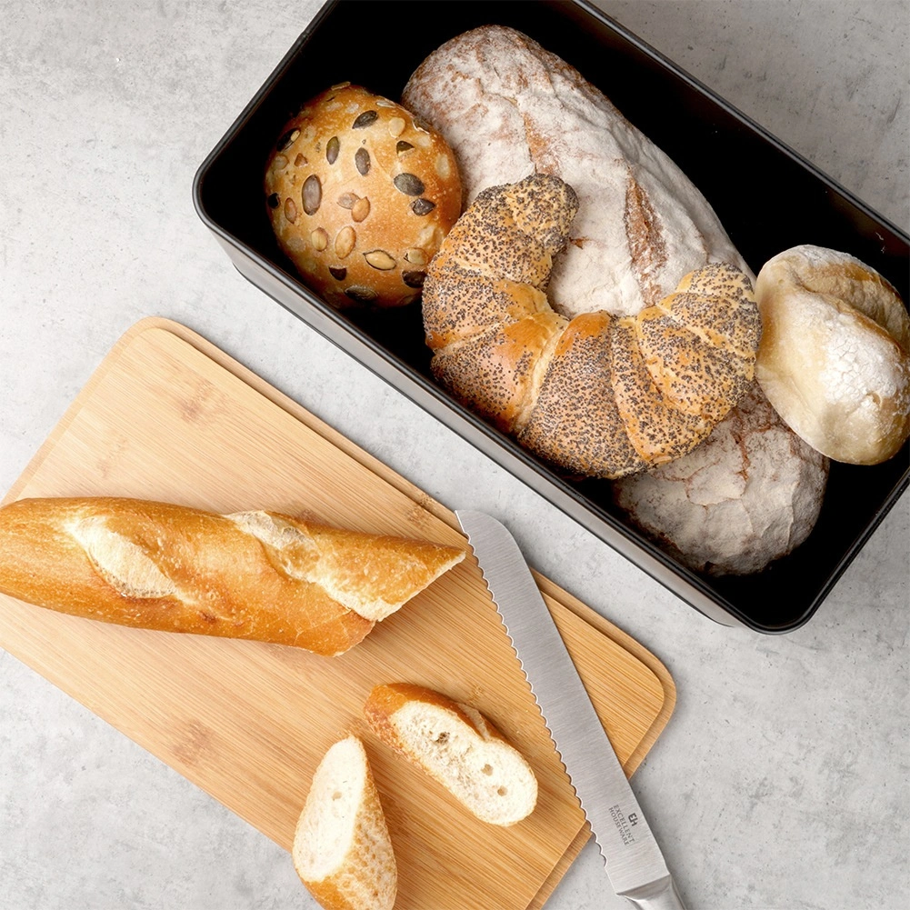 Prostoren zaboj za kruh v sodobni črni izvedbi združuje trpežno kovinsko ohišje z naravnim bambusovim pokrovom, ki hkrati služi kot deska. Mere 33 × 18 × 13 cm zagotavljajo dovolj prostora za kruh, bagete in žemlje, medtem ko čvrsta konstrukcija ščiti pecivo pred zmečkanjem.