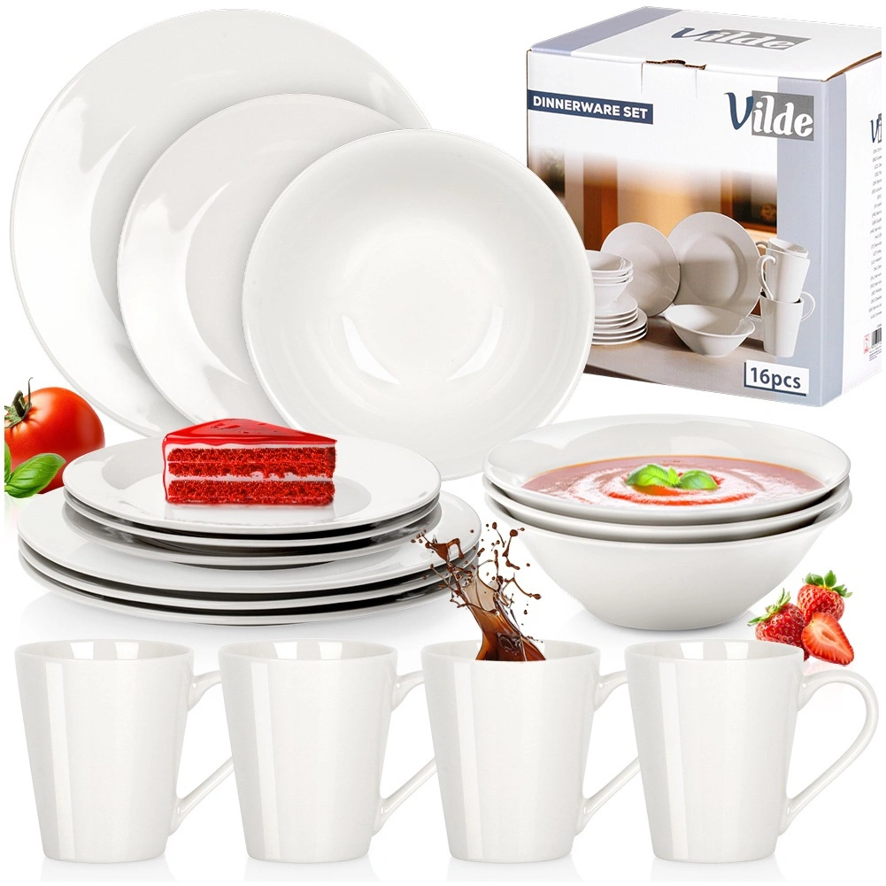 Elegantni porcelanasti jedilni set za 4 osebe ponuja 16 delov za vsakodnevno obedovanje in praznične priložnosti. V paketu najdete sklede 600 ml, ploske krožnike, desertne krožnike in vrčke 300 ml. Brezčasen čisto bel dizajn se poda vsaki kuhinji, posoda je primerna za pomivalni stroj in mikrovalovno pečico.
