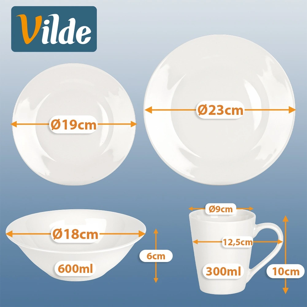 Vsebina seta: 4 sklede 18 × 6 cm (600 ml), 4 plitvi krožniki 23 × 23 × 2 cm, 4 desertni krožniki 19 × 19 × 2 cm, 4 vrčki 12,5 × 9 × 10 cm (300 ml). Posoda je idealna za juhe, solate, glavne jedi in deserte, vrčki so primerni za kavo in čaj. Enostavno vzdrževanje v pomivalnem stroju in varno segrevanje v mikrovalovni pečici prihranita čas vsak dan.