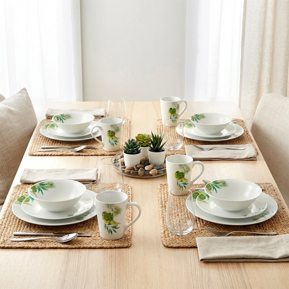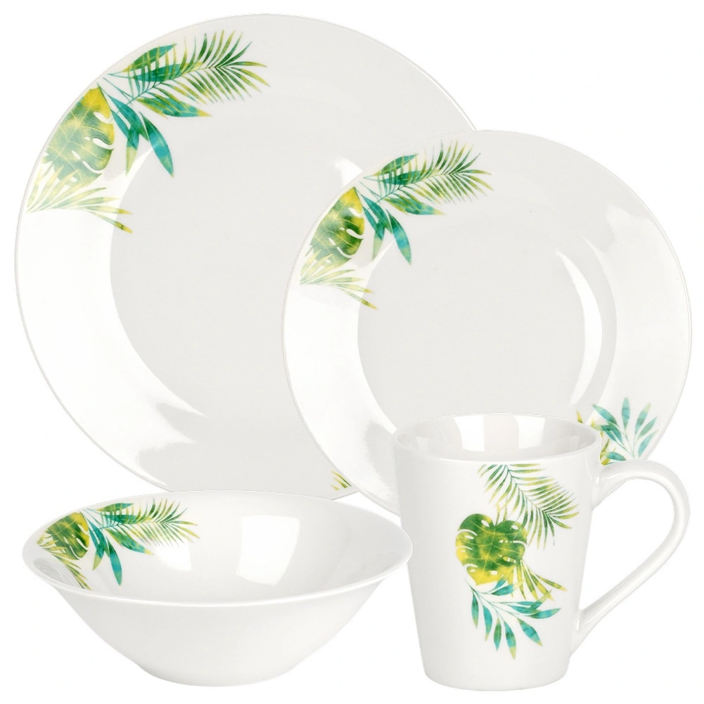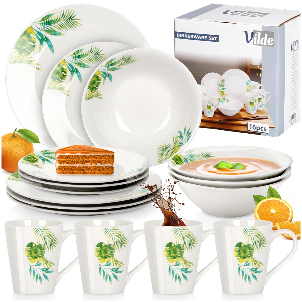 Eleganten porcelanasti jedilni set za 4 osebe z belo glazuro in tropskim rastlinskim motivom. Vsebuje 16 delov: plitve in desertne krožnike, sklede 600 ml ter vrčke 300 ml. Primeren za pomivalni stroj in mikrovalovno pečico, idealen za vsakodnevno pogrinjanje in praznične trenutke. Časovno neodvisen dizajn se zlahka ujema s katero koli kuhinjsko opremo.