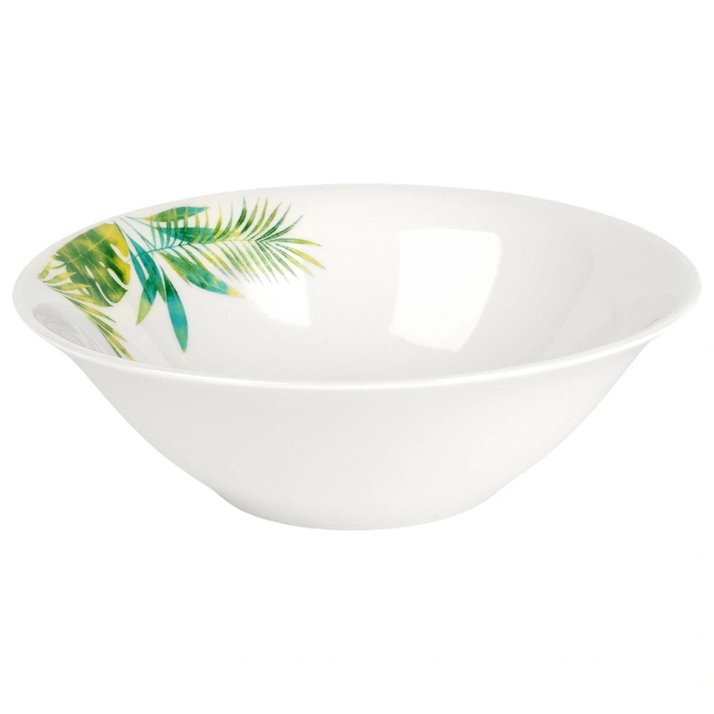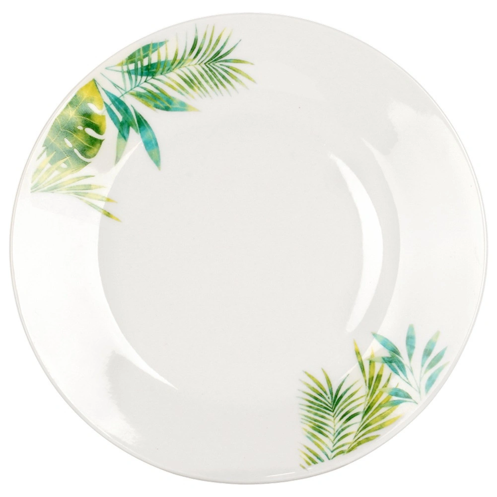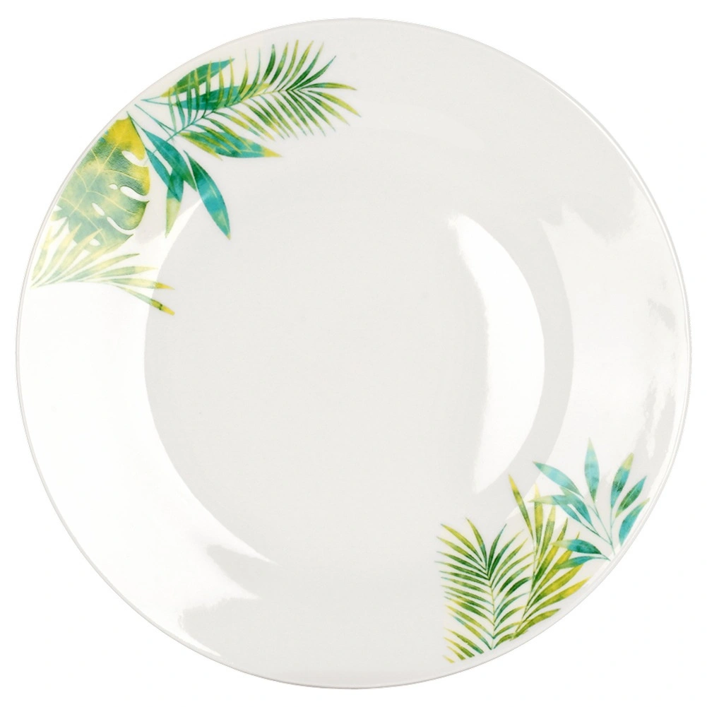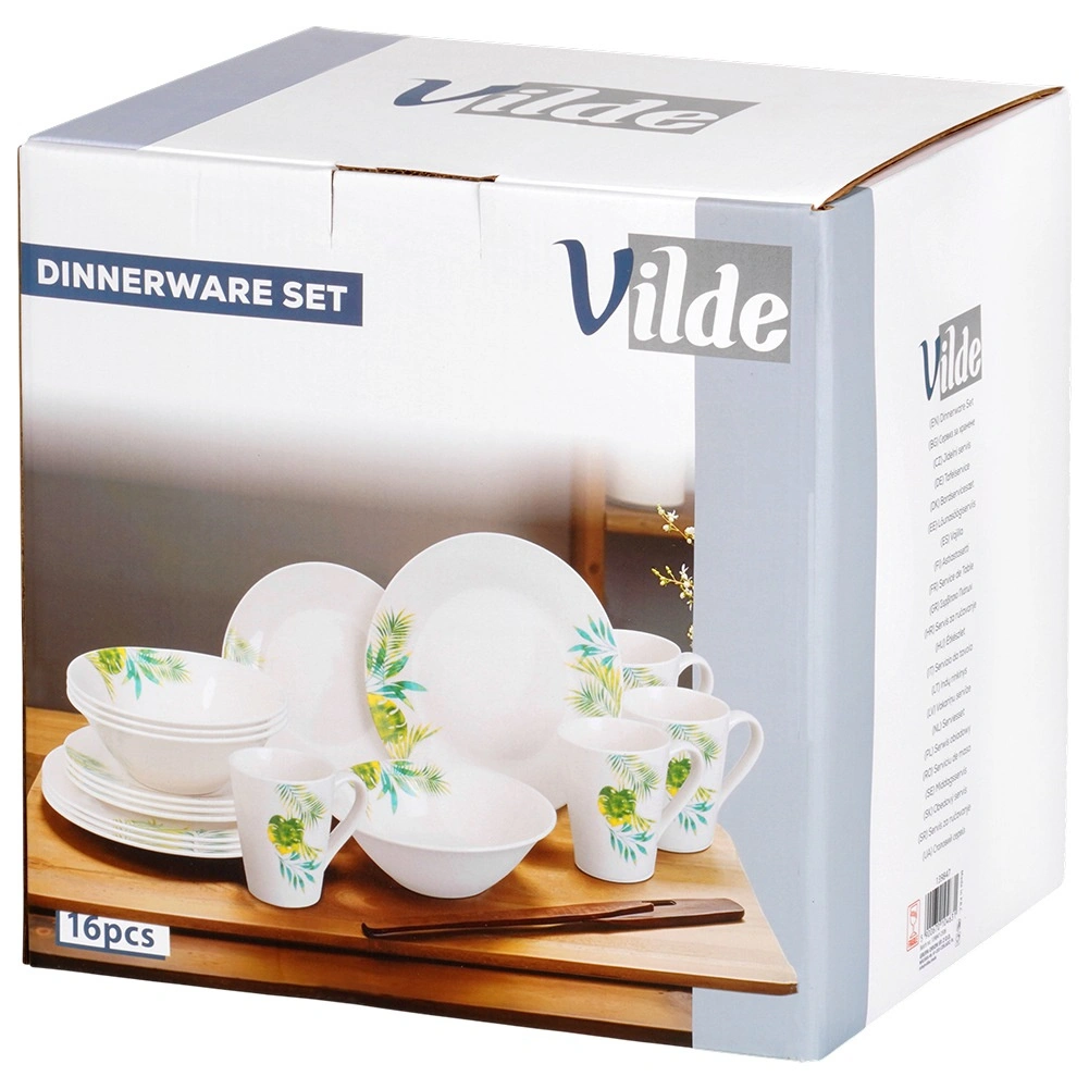 Eleganten porcelanasti jedilni set za 4 osebe z belo glazuro in tropskim rastlinskim motivom. Vsebuje 16 delov: plitve in desertne krožnike, sklede 600 ml ter vrčke 300 ml. Primeren za pomivalni stroj in mikrovalovno pečico, idealen za vsakodnevno pogrinjanje in praznične trenutke. Časovno neodvisen dizajn se zlahka ujema s katero koli kuhinjsko opremo.