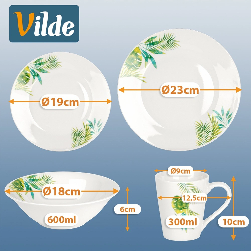 Ta 16-delni porcelanasti set za 4 osebe združuje kakovostno izdelavo, praktične dimenzije in moderen botaničen videz. Belo ozadje s tropskimi listi doda vaši mizi svež poudarek, medtem ko vzdržljiva glazura zagotavlja enostavno vzdrževanje in dolgo življenjsko dobo.