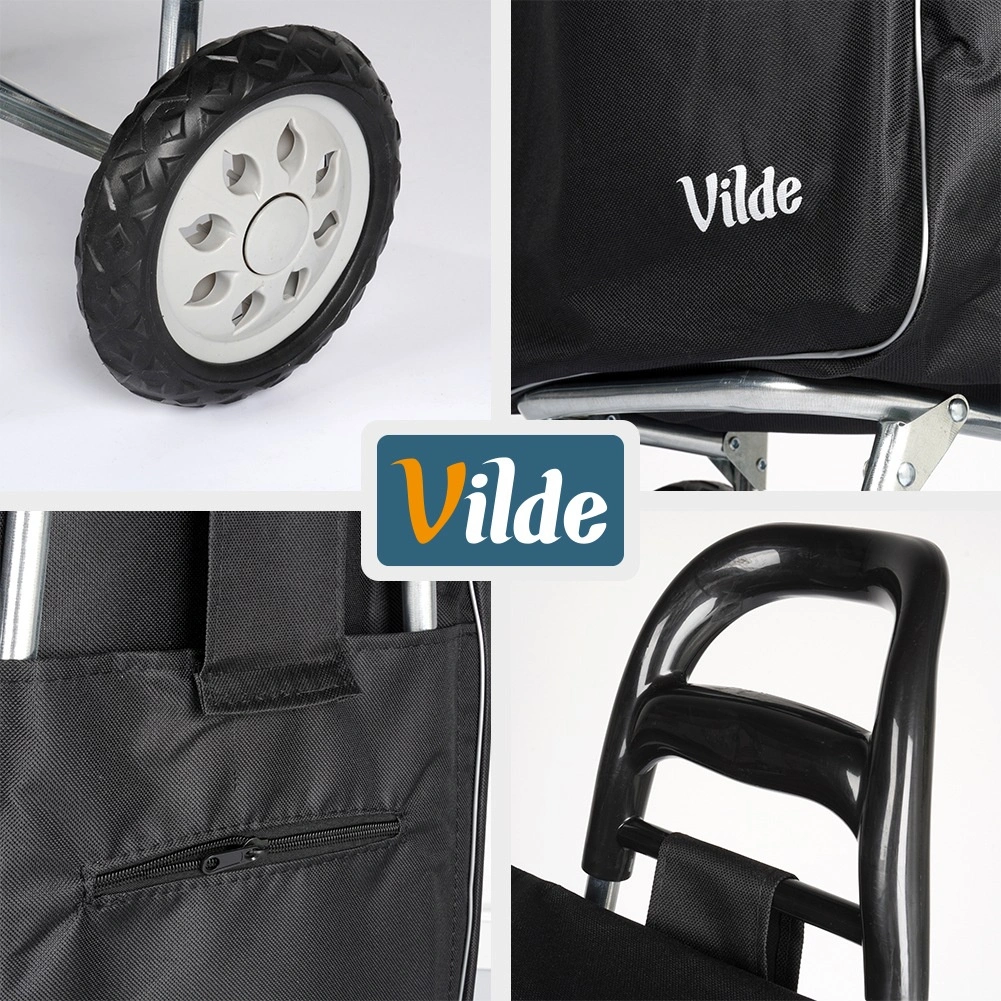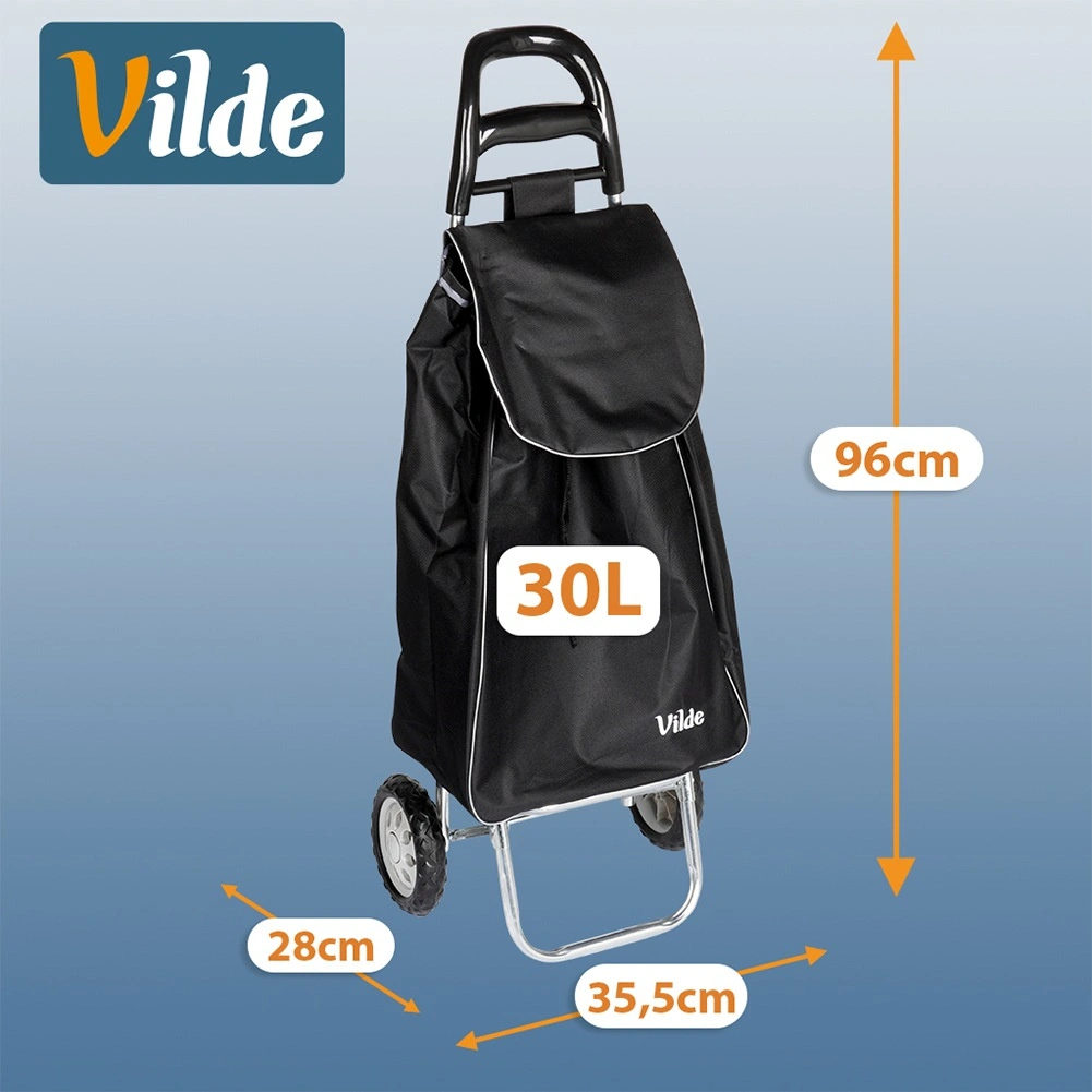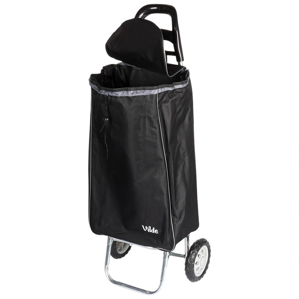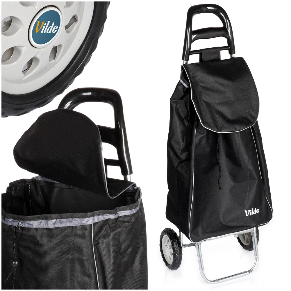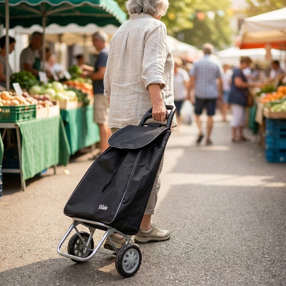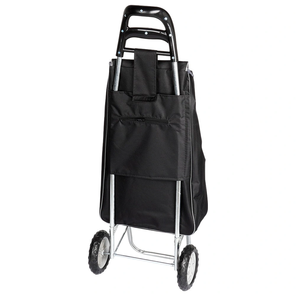 Nakupovalni voziček s črno poliestrsko torbo s prostornino 30 l je zasnovan za vsakodnevno uporabo. Kovinski okvir in trpežna tkanina zagotavljata zanesljivost, medtem ko zapiranje na vrvico in zgornji preklop ščitita vsebino pred vremenskimi vplivi. Zadnji žep na zadrgo varno hrani drobnarije pri roki.