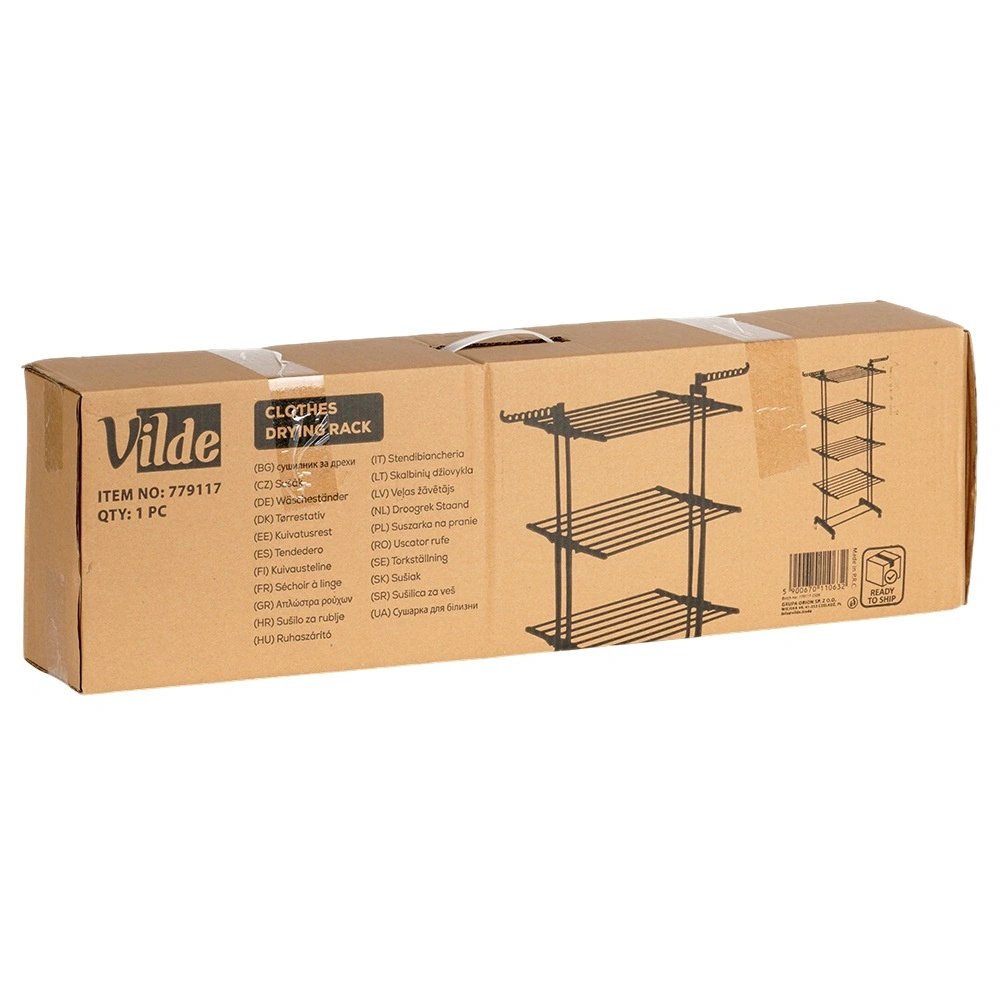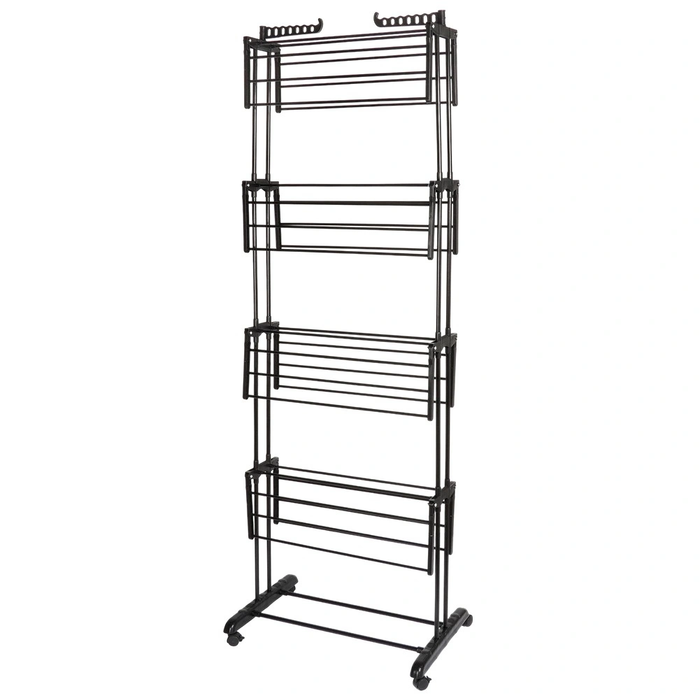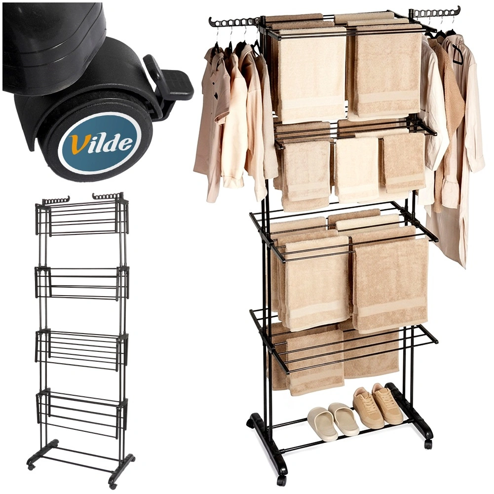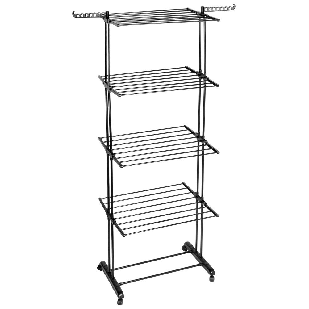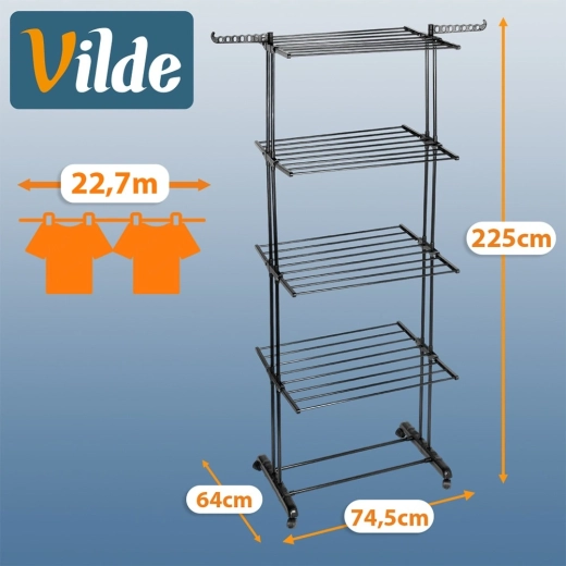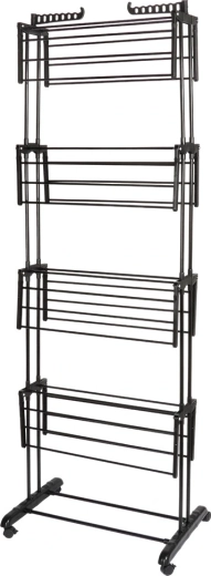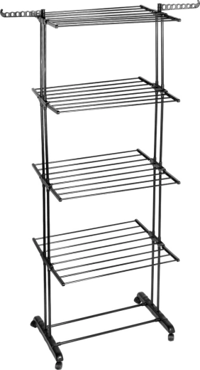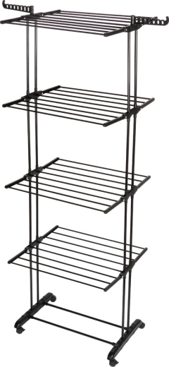Maksimalno izkoristite prostor pri sušenju perila s prostornim navpičnim stojalom v elegantni črni barvi. Štiri nadstropja, osem neodvisno zložljivih kril in stranska nosilca za obešalnike omogočajo prilagoditev kapacitete trenutni količini perila. Skupna sušilna površina znaša 22,7 m, nosilnost do 25 kg pa zlahka prenese tudi težje tekstilije.