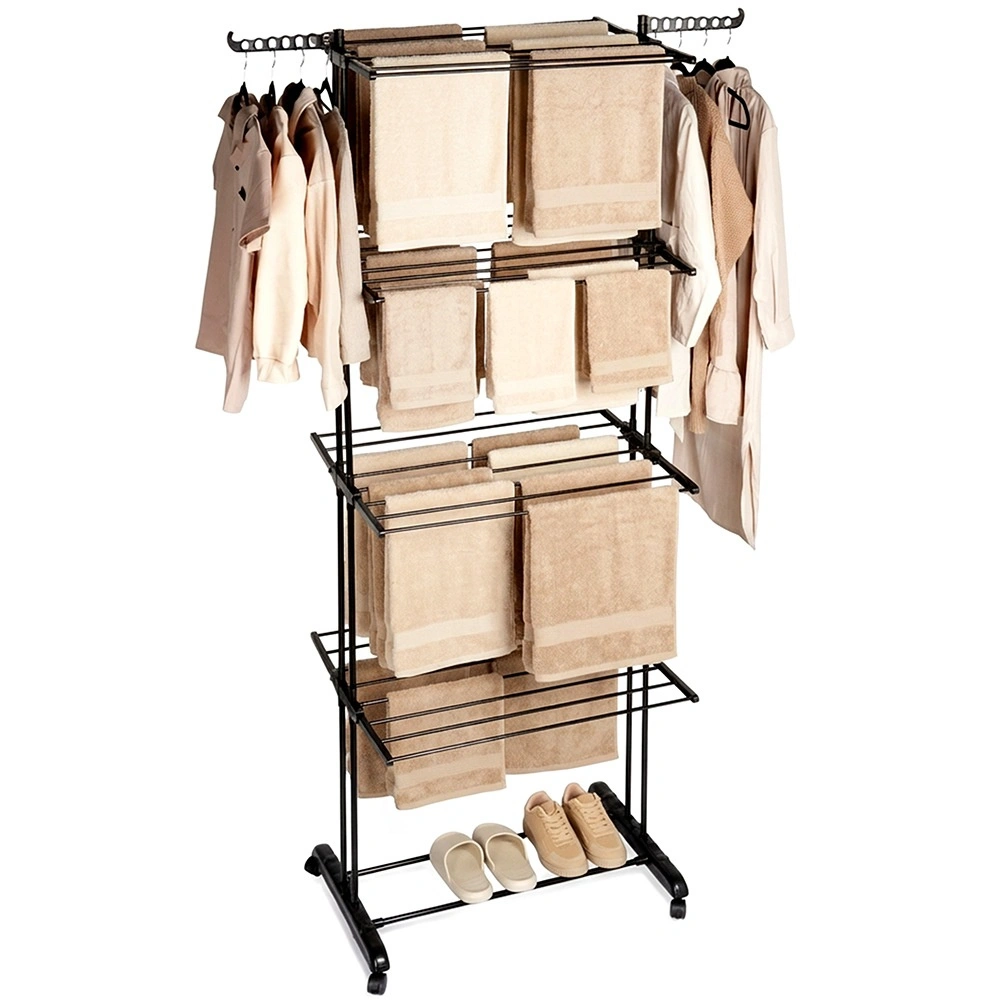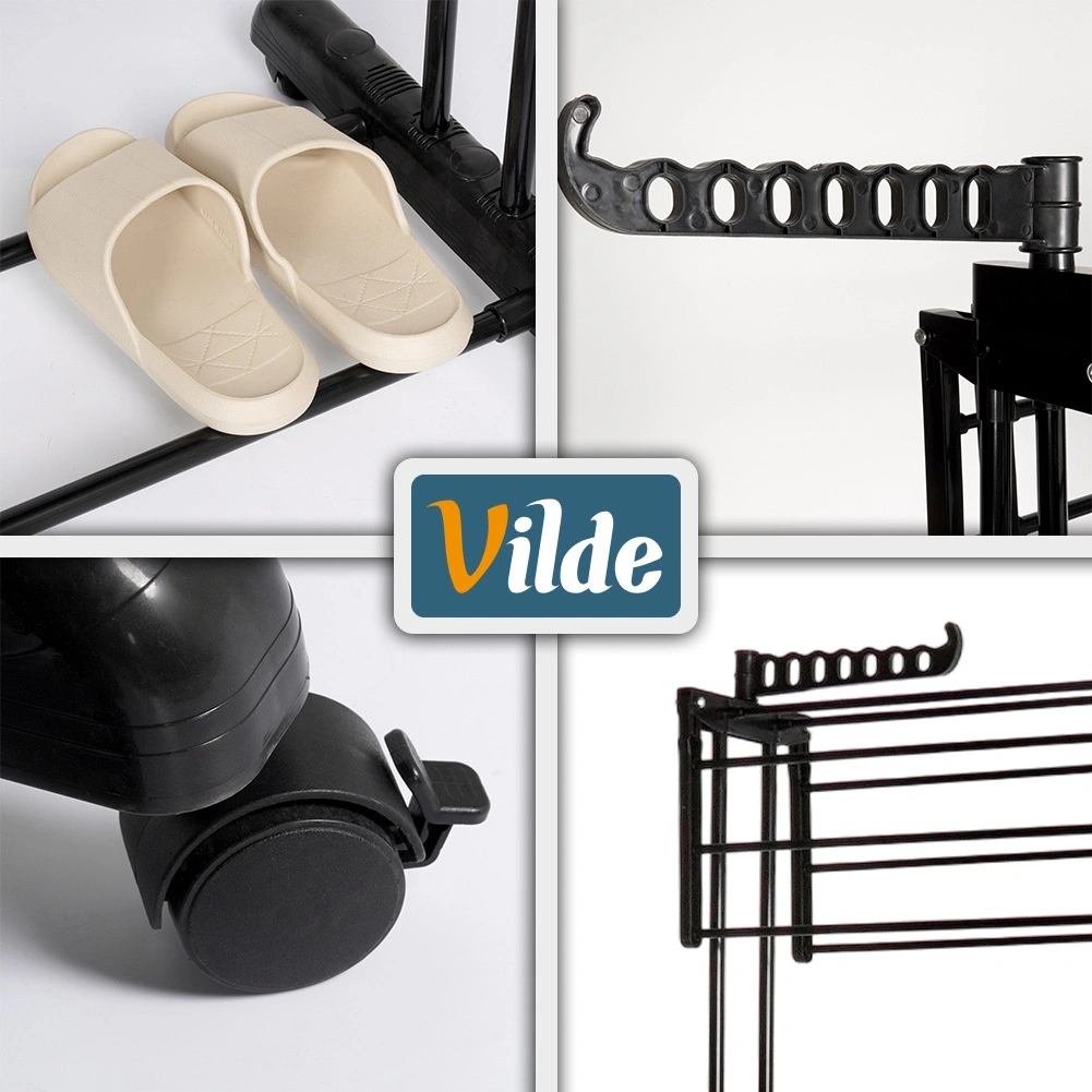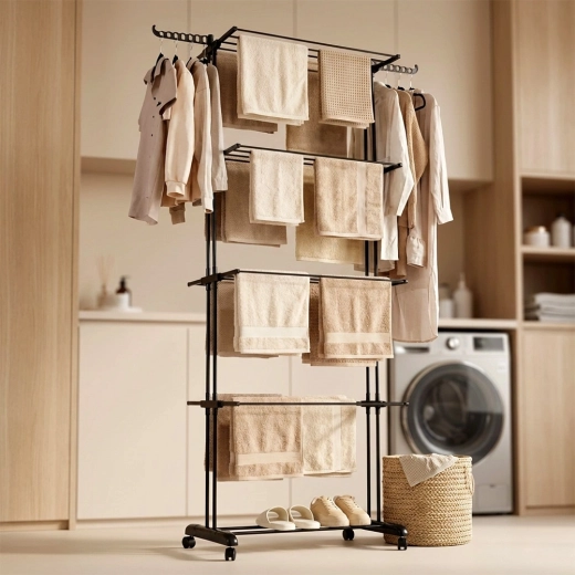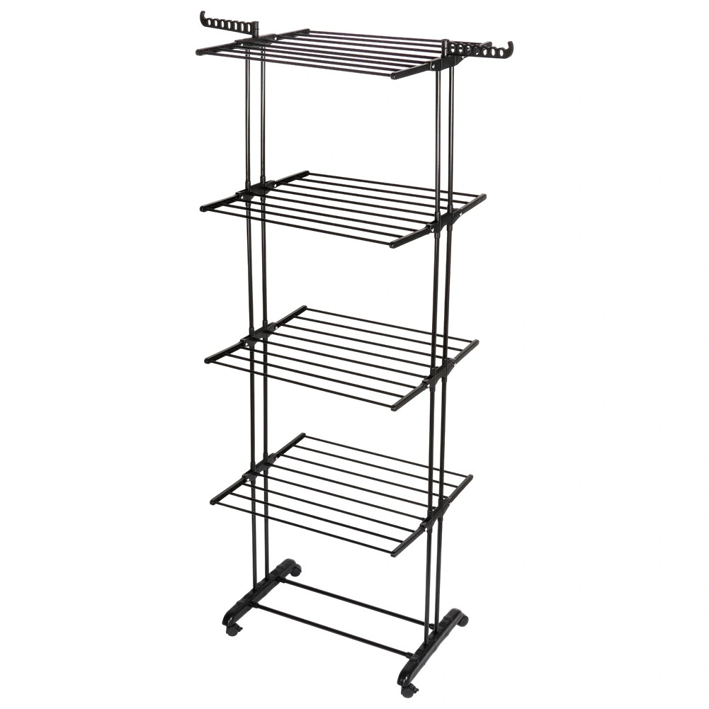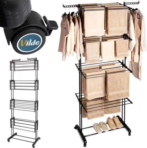 Vzdržljiva kovinska konstrukcija s prašnim lakiranjem je stabilna in odporna proti vlagi, zato je stojalo primerno za notranjo in zunanjo uporabo (balkon, terasa, vrt). Štiri kolesca omogočajo enostavno premikanje, dve med njimi imata zavoro za varno fiksiranje na mestu. Spodnja polica je idealna za sušenje obutve in dodatkov.