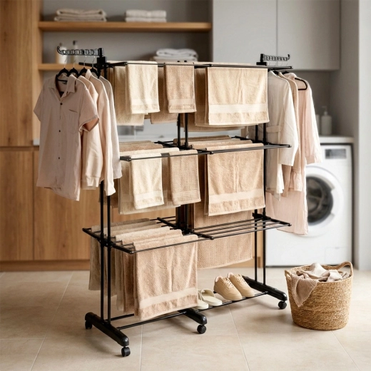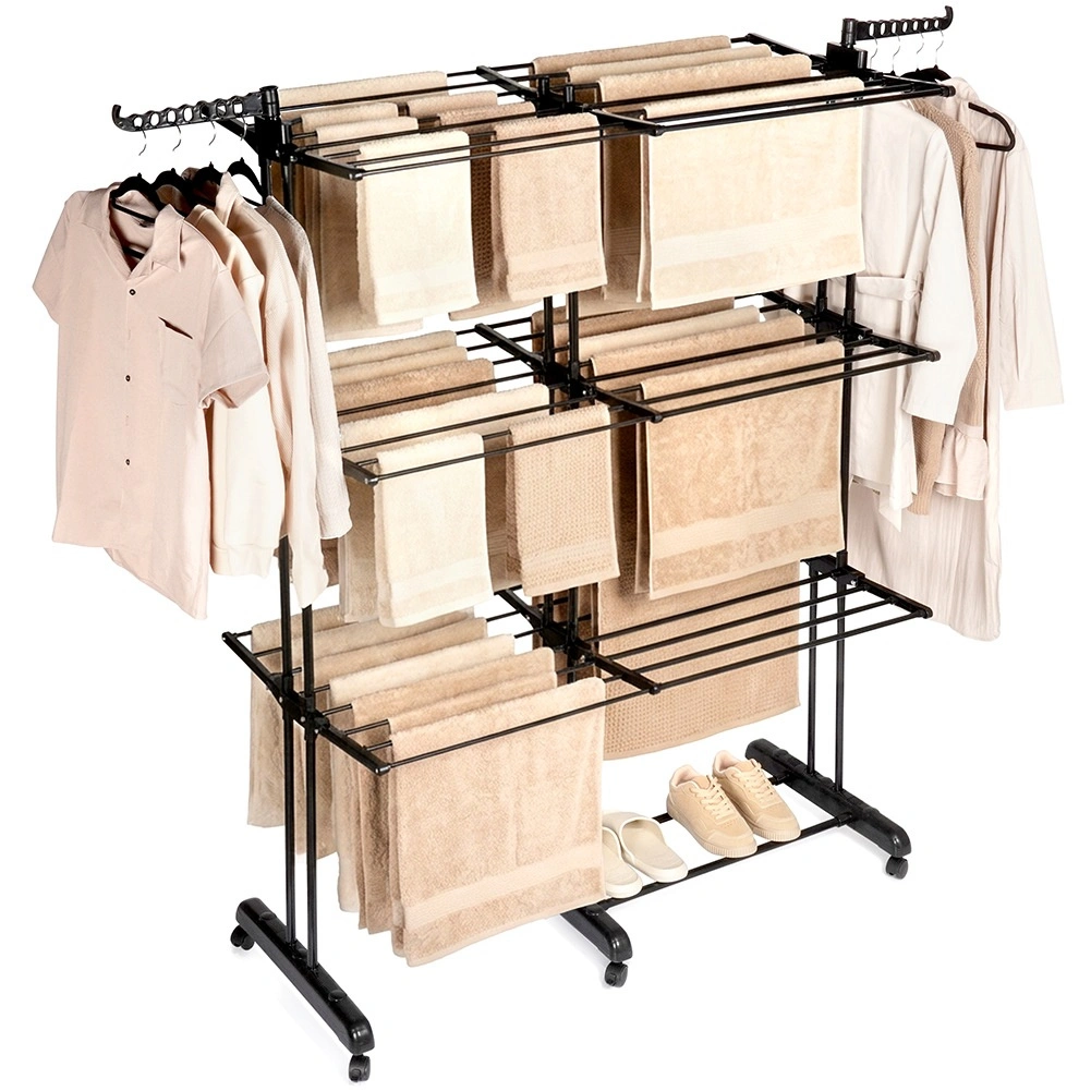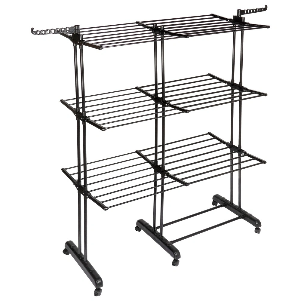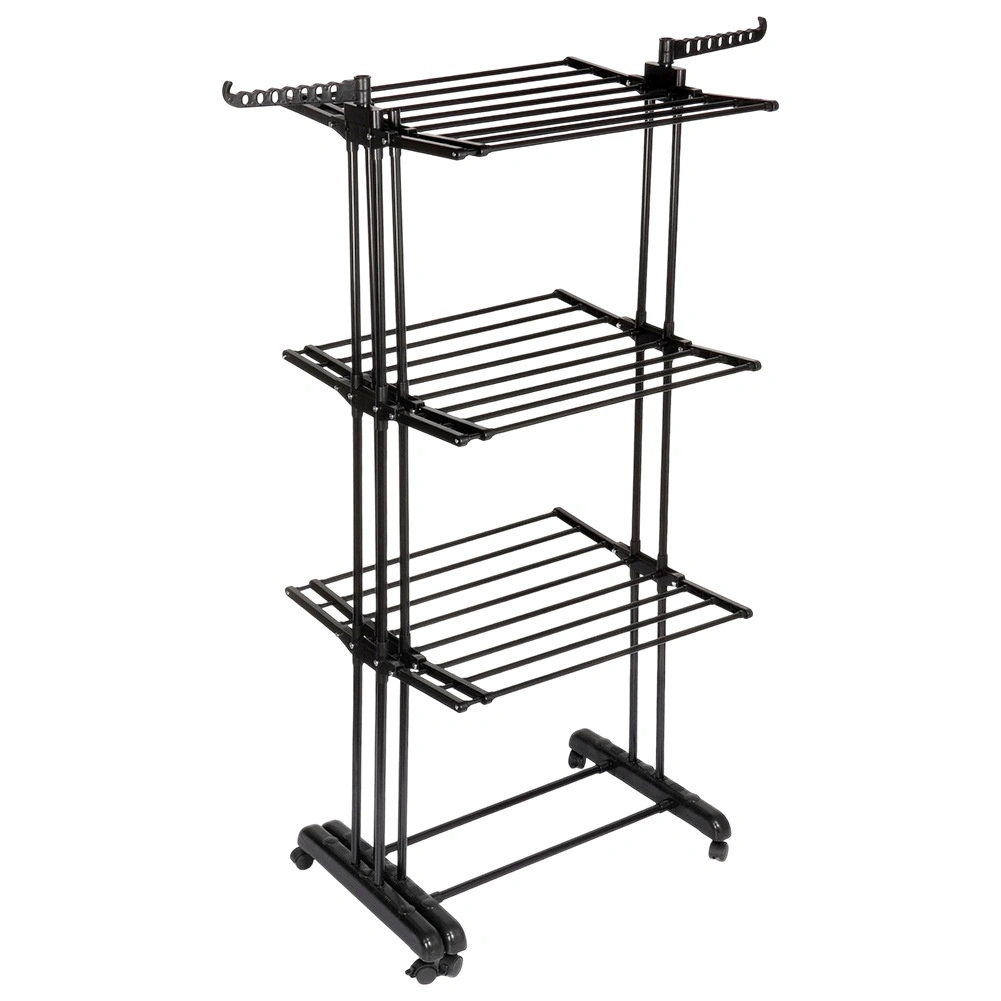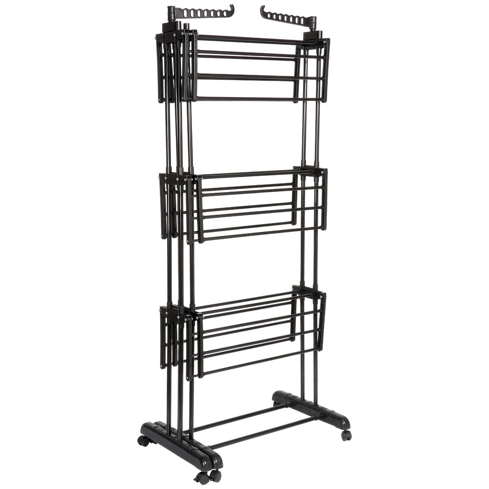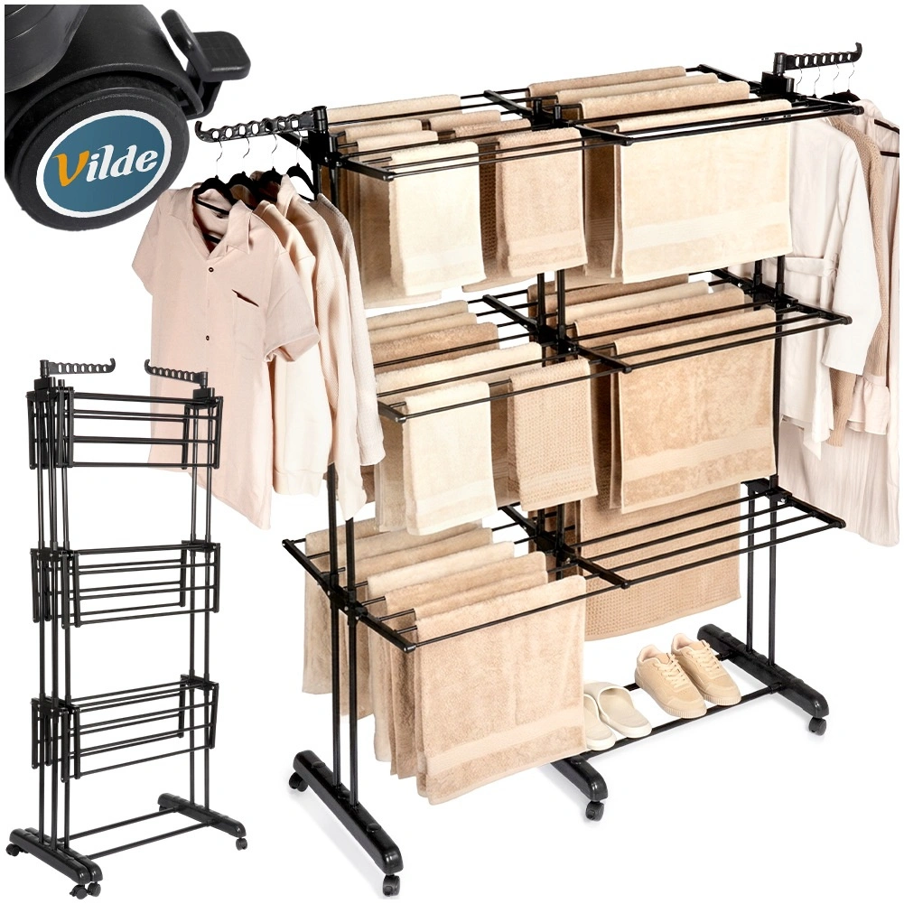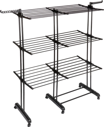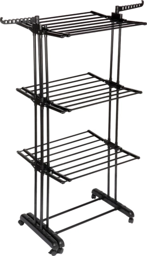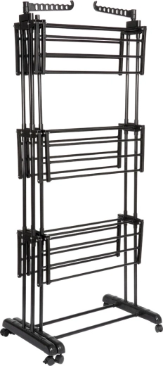 Vertikalno stojalo XXL v elegantni črni barvi je idealno za stanovanje, pralnico ali balkon. Tri neodvisne ravni in šest posamično zložljivih kril omogočajo prilagoditev prostora dolžini in količini perila. Na straneh sta roki z odprtinami za obešalnike, spodaj pa priročna polica na primer za obutev.