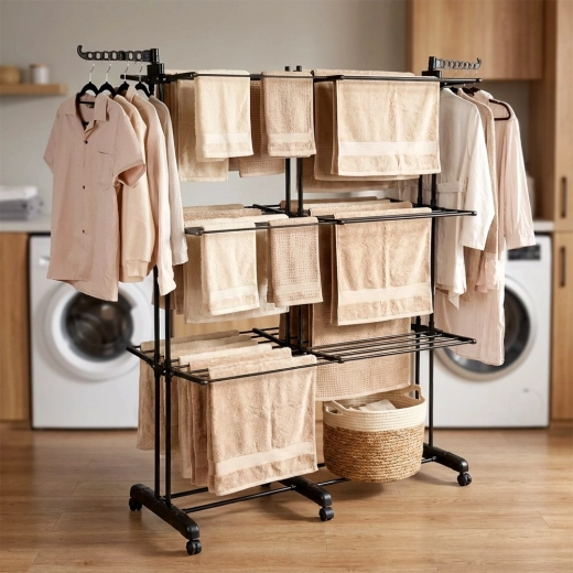 Šest neodvisnih zložljivih kril in stranski roki za obešalnike maksimizirata kapaciteto brez kompromisov pri kroženju zraka.